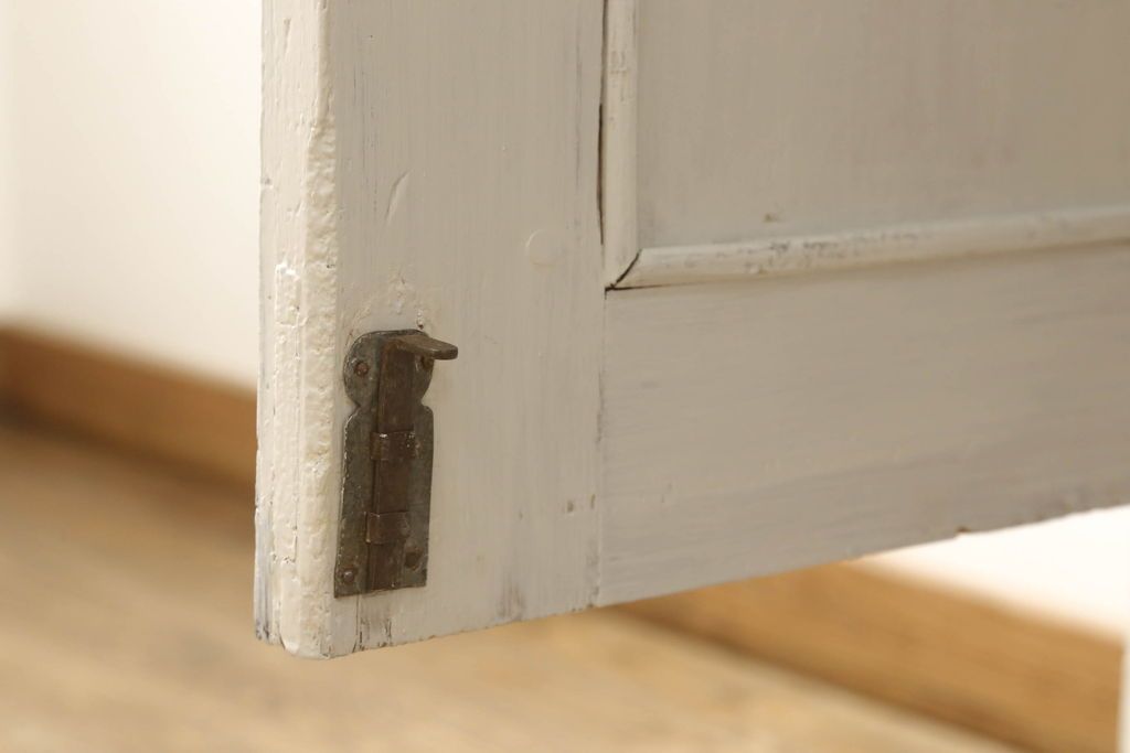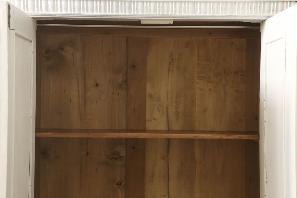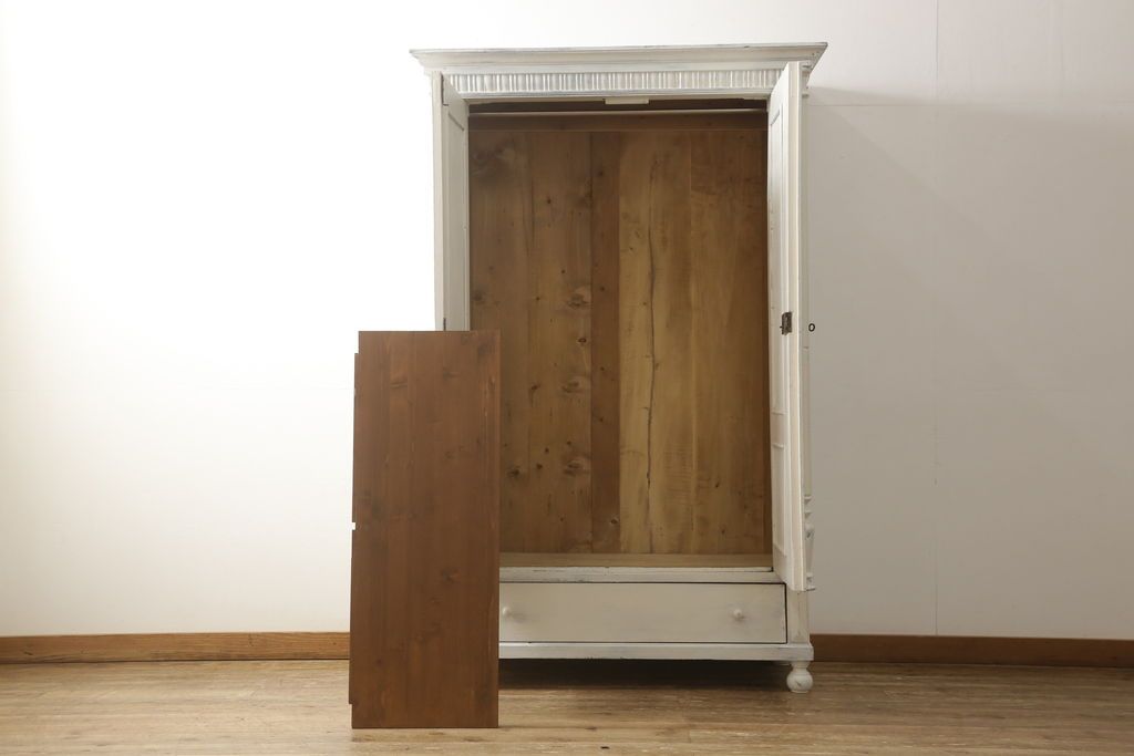 ワードローブ・ロッカー> ワードローブ > ワードローブをリペア&カスタム!木製脚 ・ハンガーポールを取り付け、開閉用の鍵を製作。既存の棚板は近しい色味で再着色し、本体はアンティークホワイトにペイント。(洋服タンス、収納棚、キャビネット、引き出し)