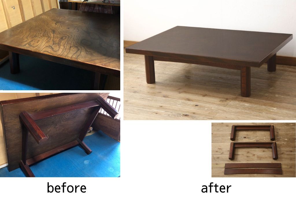 座卓を脚を外せる仕様にリメイク!脚を取り外し可能な仕様に加工。天板の塗装を剥離し本体は脚の色をベースに着色仕上げ。