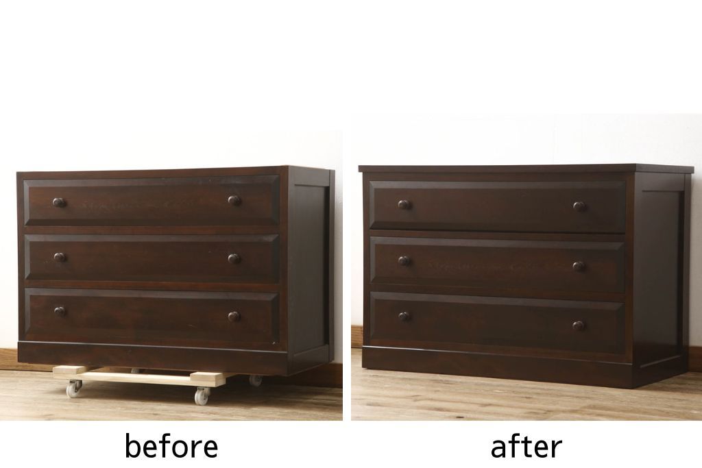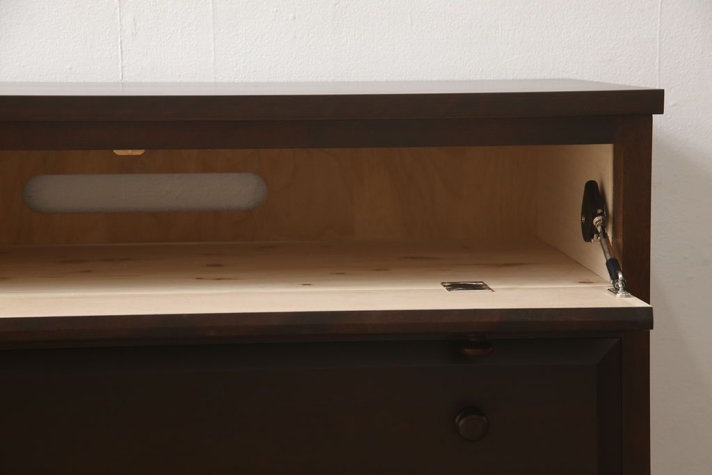 セミオーダー家具実績 > ローチェストをリペア&カスタム!天板を取り付け、1段目引き出しにフラップダウン加工を施し、配線用の穴開け加工。本体は元々の色味をベースに補色、傷消しにて仕上げ、新材部分は本体に色を合わせ。(ローボード、サイドチェスト、引き出し)