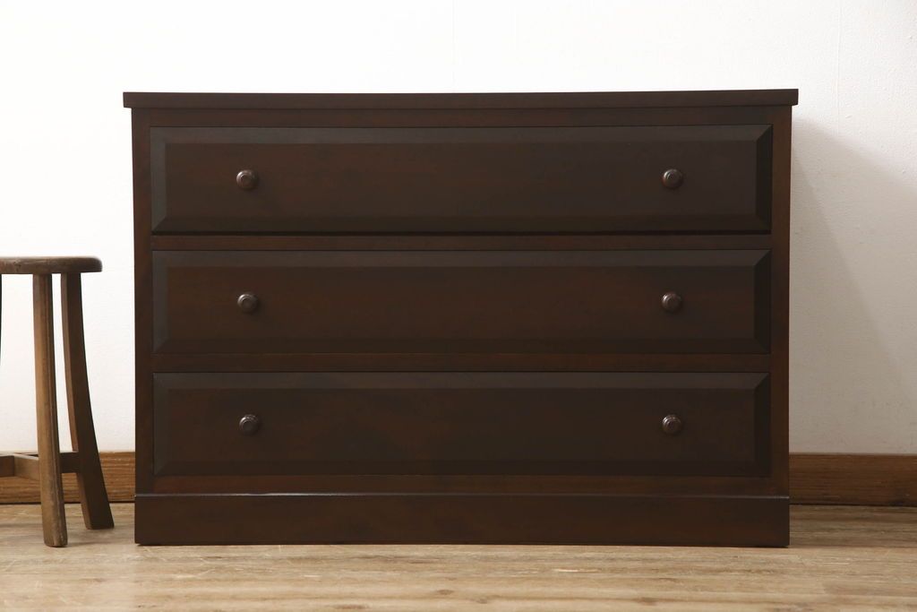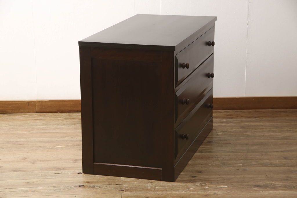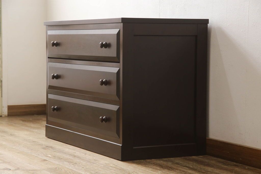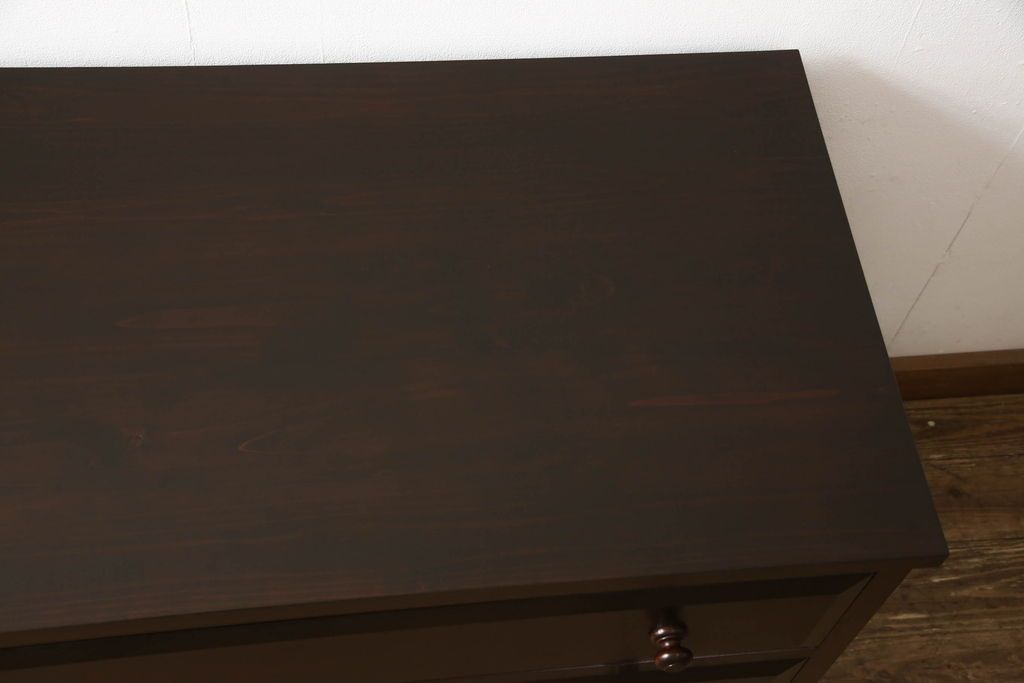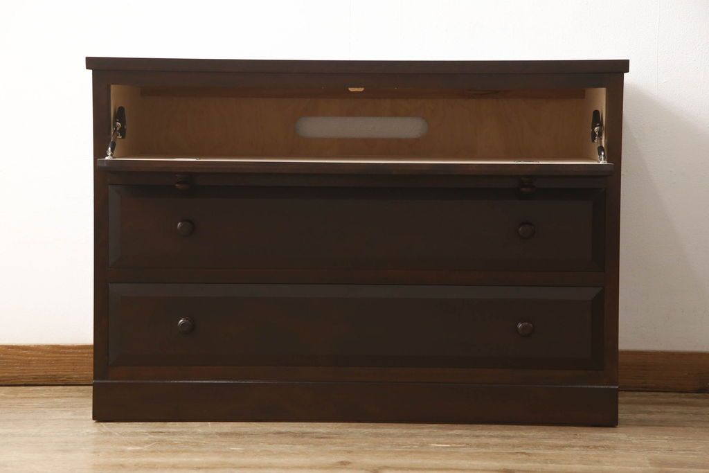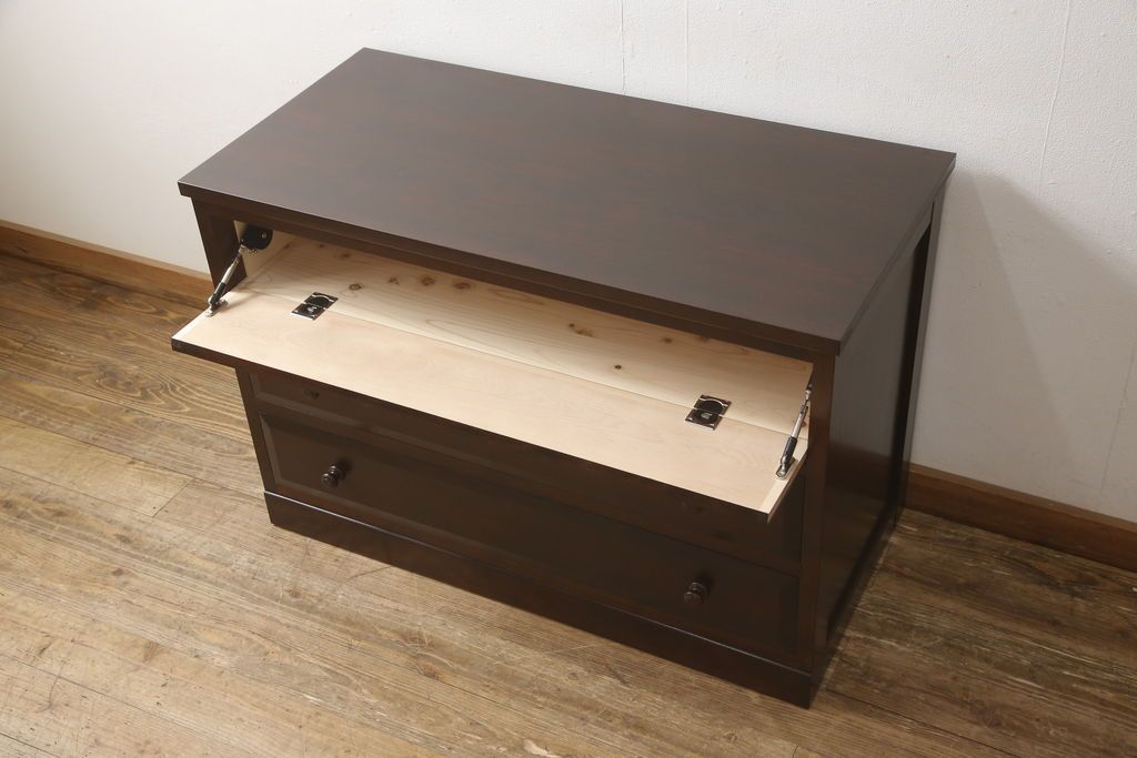 チェスト・引き出し> ローチェスト > ローチェストをリペア&カスタム!天板を取り付け、1段目引き出しにフラップダウン加工を施し、配線用の穴開け加工。本体は元々の色味をベースに補色、傷消しにて仕上げ、新材部分は本体に色を合わせ。(ローボード、サイドチェスト、引き出し)