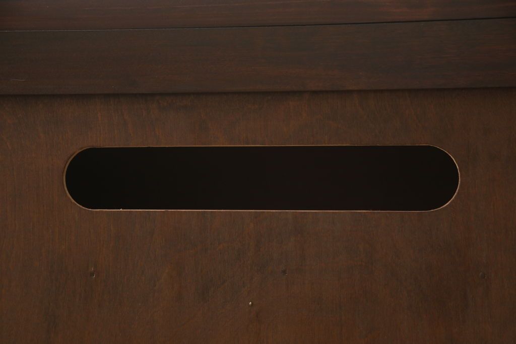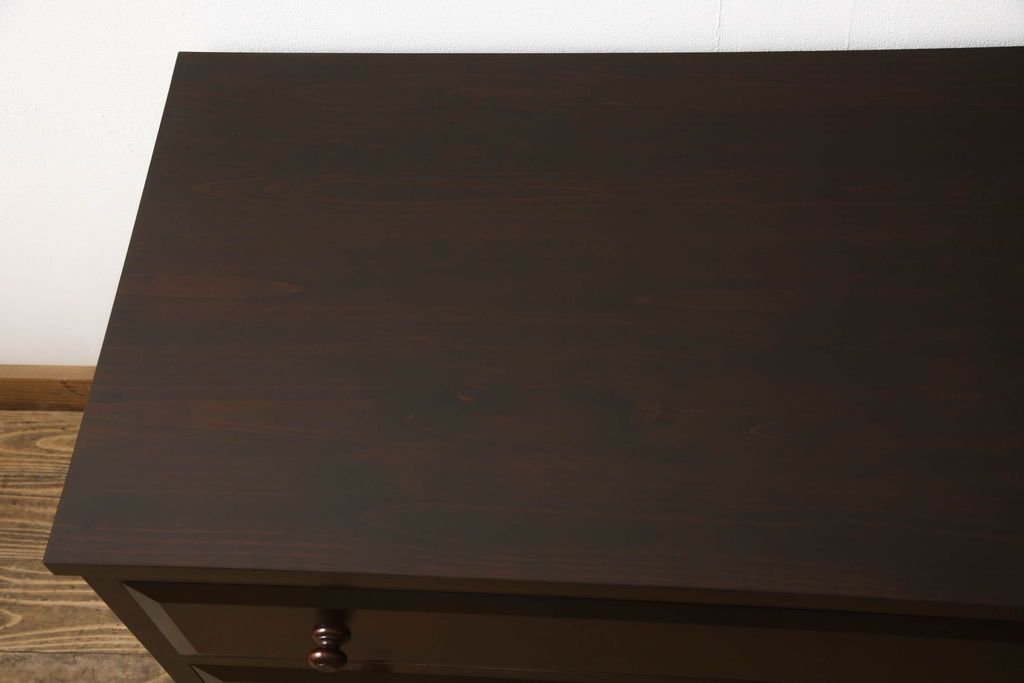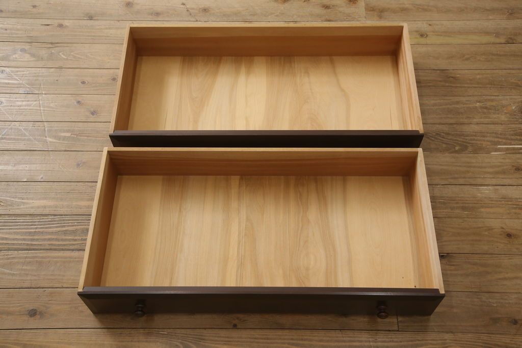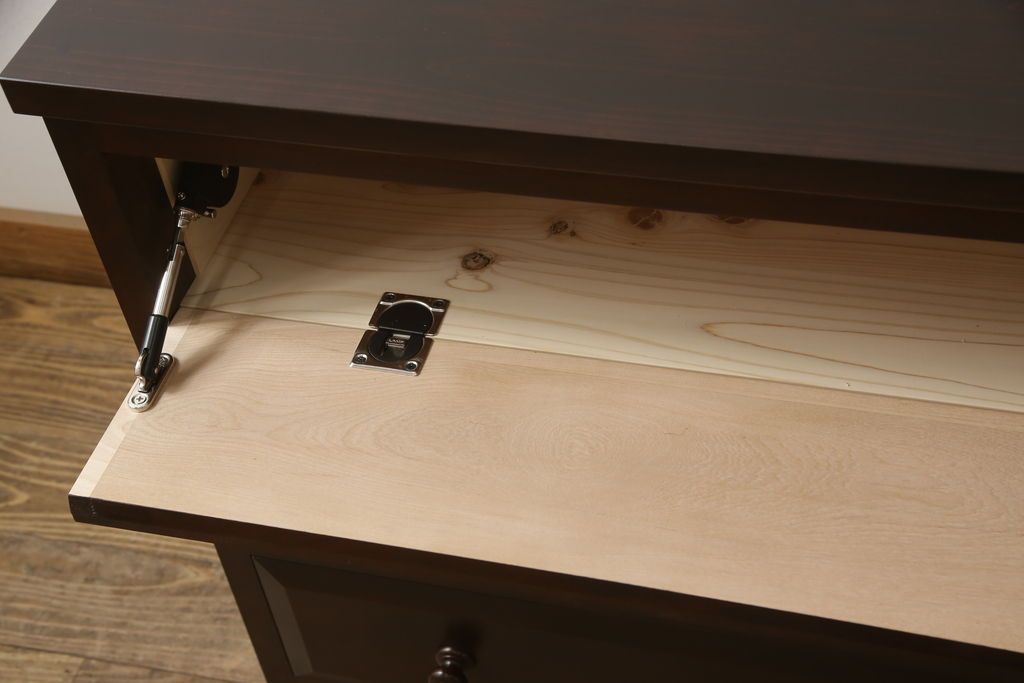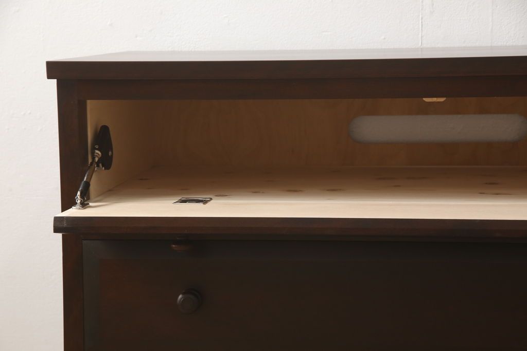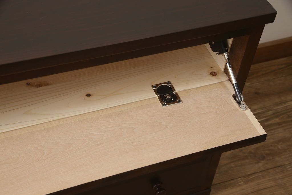 民芸家具 > ローチェストをリペア&カスタム!天板を取り付け、1段目引き出しにフラップダウン加工を施し、配線用の穴開け加工。本体は元々の色味をベースに補色、傷消しにて仕上げ、新材部分は本体に色を合わせ。(ローボード、サイドチェスト、引き出し)