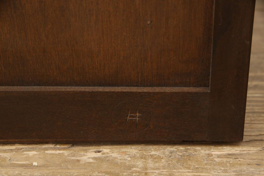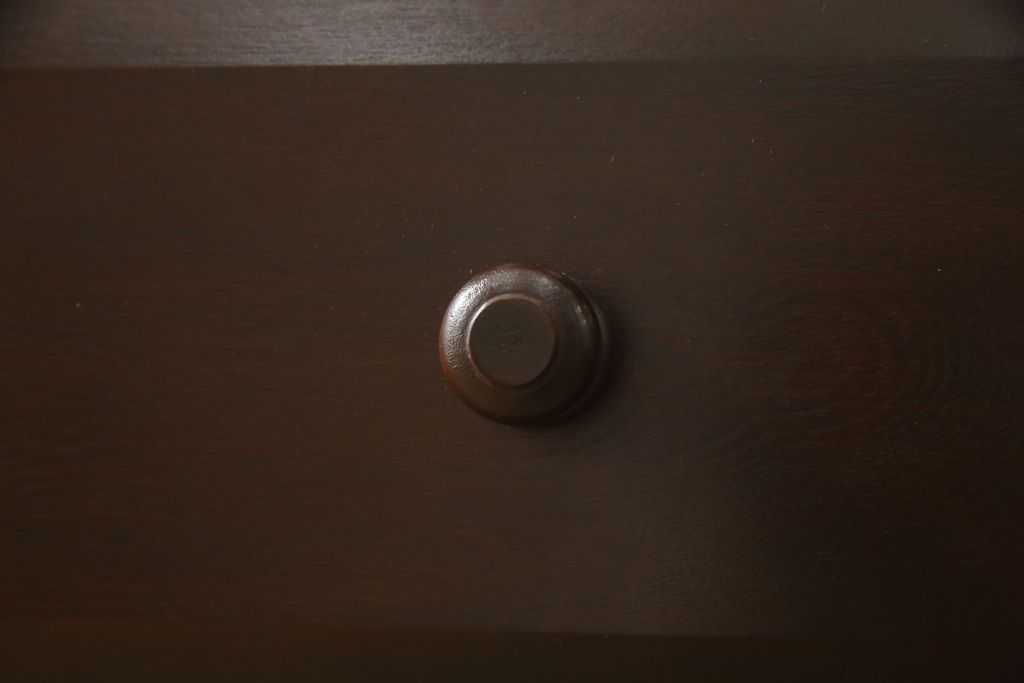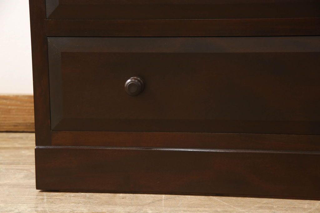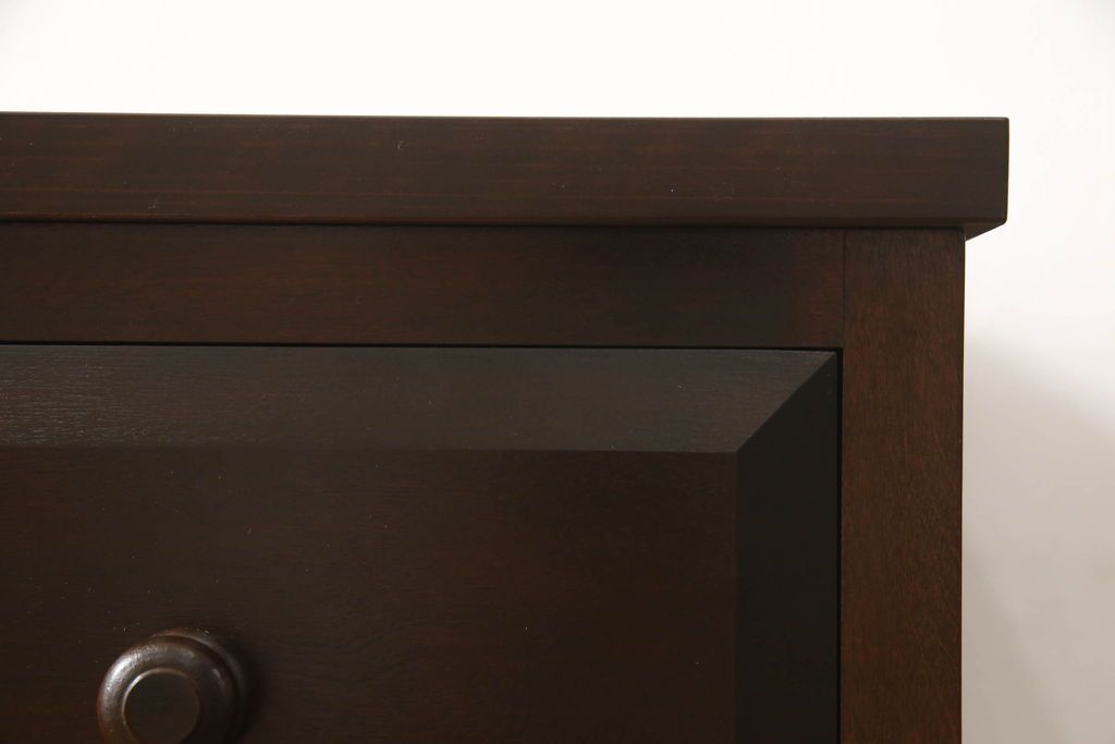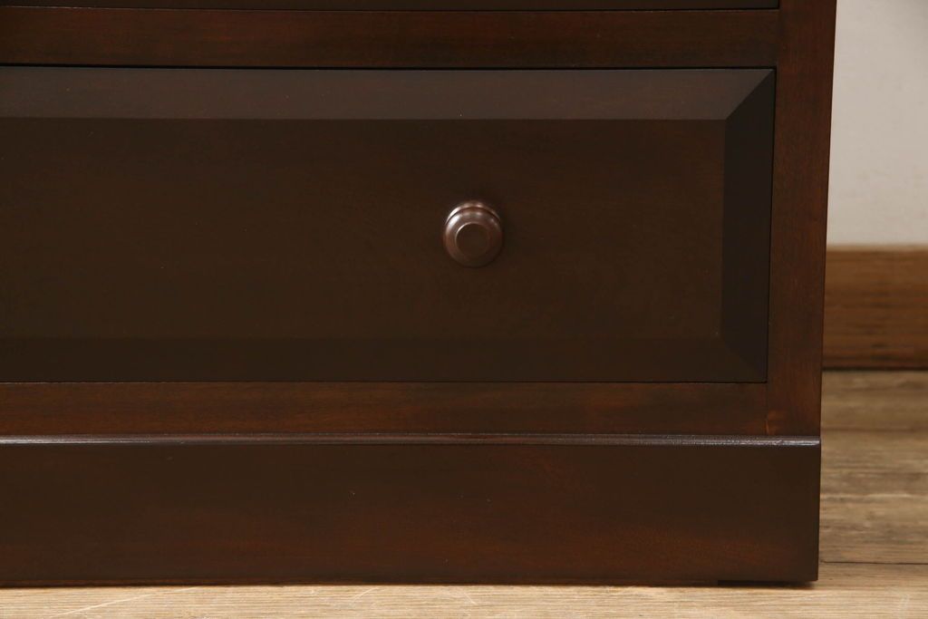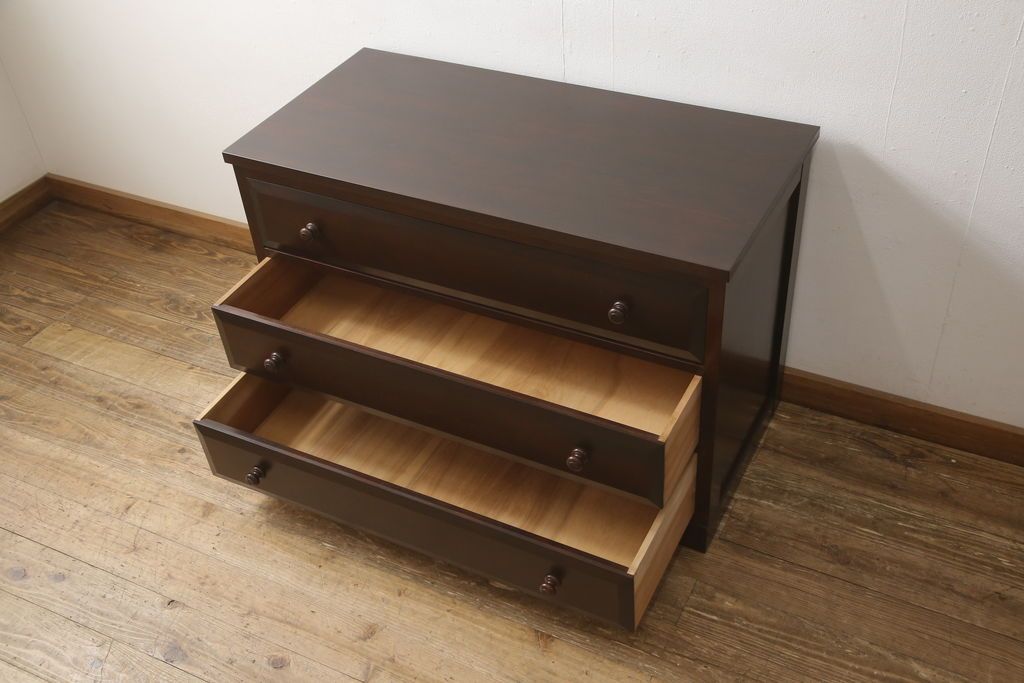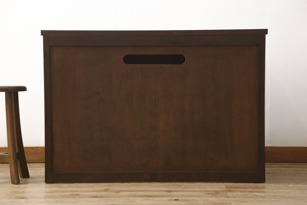 民芸家具 > ローチェストをリペア&カスタム!天板を取り付け、1段目引き出しにフラップダウン加工を施し、配線用の穴開け加工。本体は元々の色味をベースに補色、傷消しにて仕上げ、新材部分は本体に色を合わせ。(ローボード、サイドチェスト、引き出し)