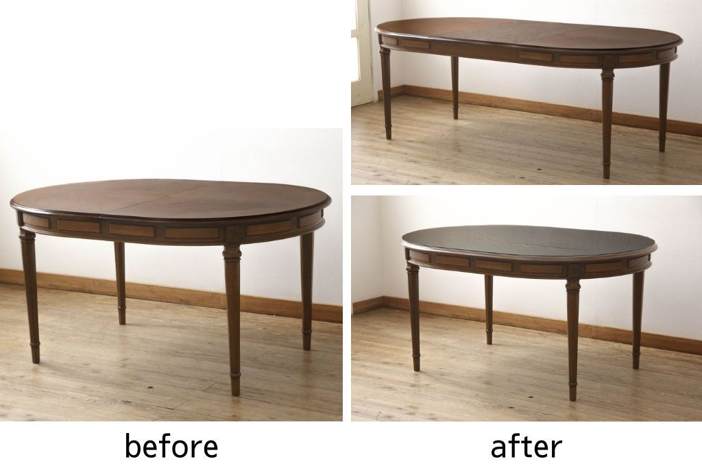 ダイニングテーブルをリペア&カスタム!延長天板を製作。合わせてガラス天板も用意。本体は現状の色味を活かして仕上げ。(4人掛け、6人掛け)