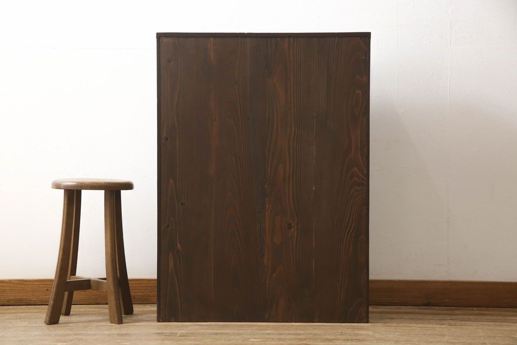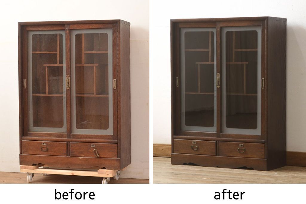 ガラス戸棚をリペア&カスタム!取っ手は似た雰囲気のものに交換。木部は現状の品物に合わせて1トーン程落ち着いた色に着色し、内部棚板・修繕箇所は本体と馴染むように。(飾り棚、収納棚、キャビネット)