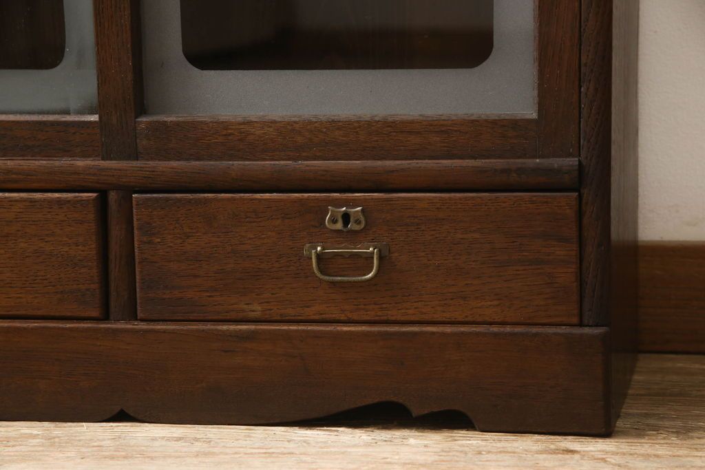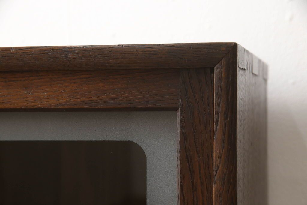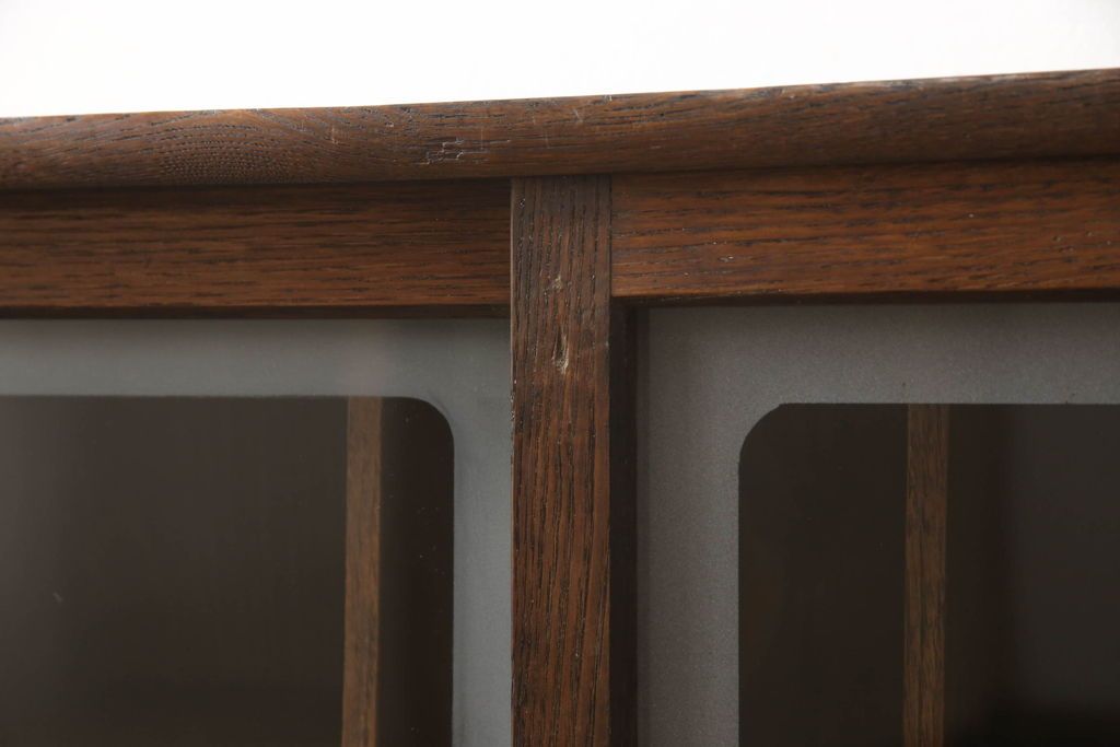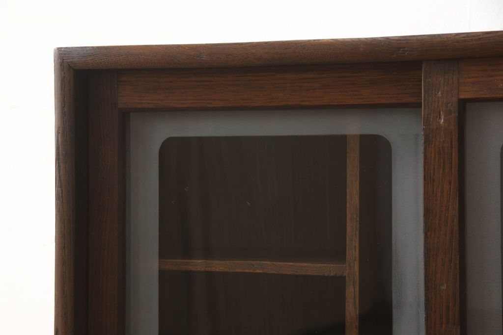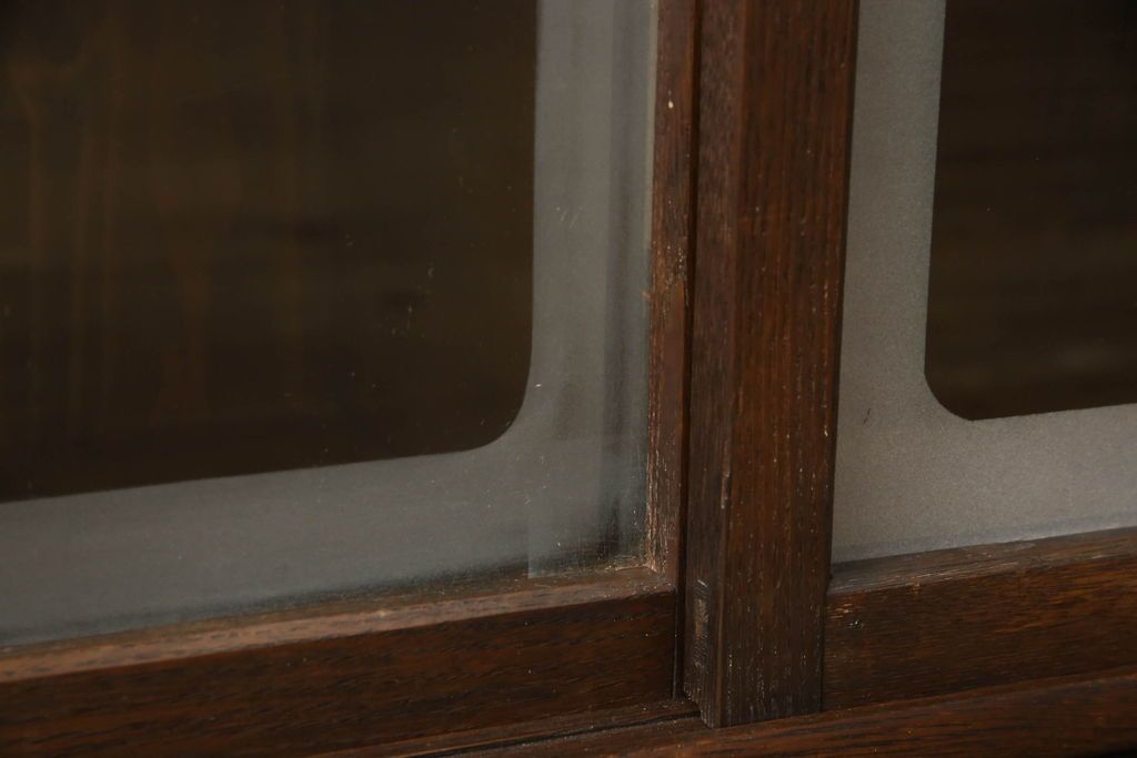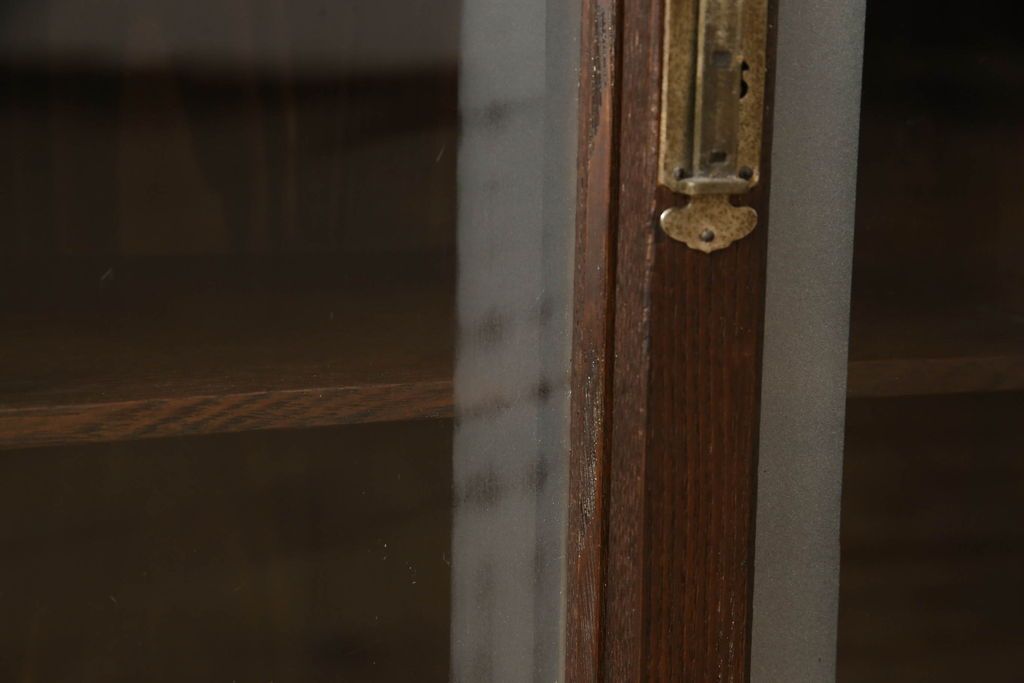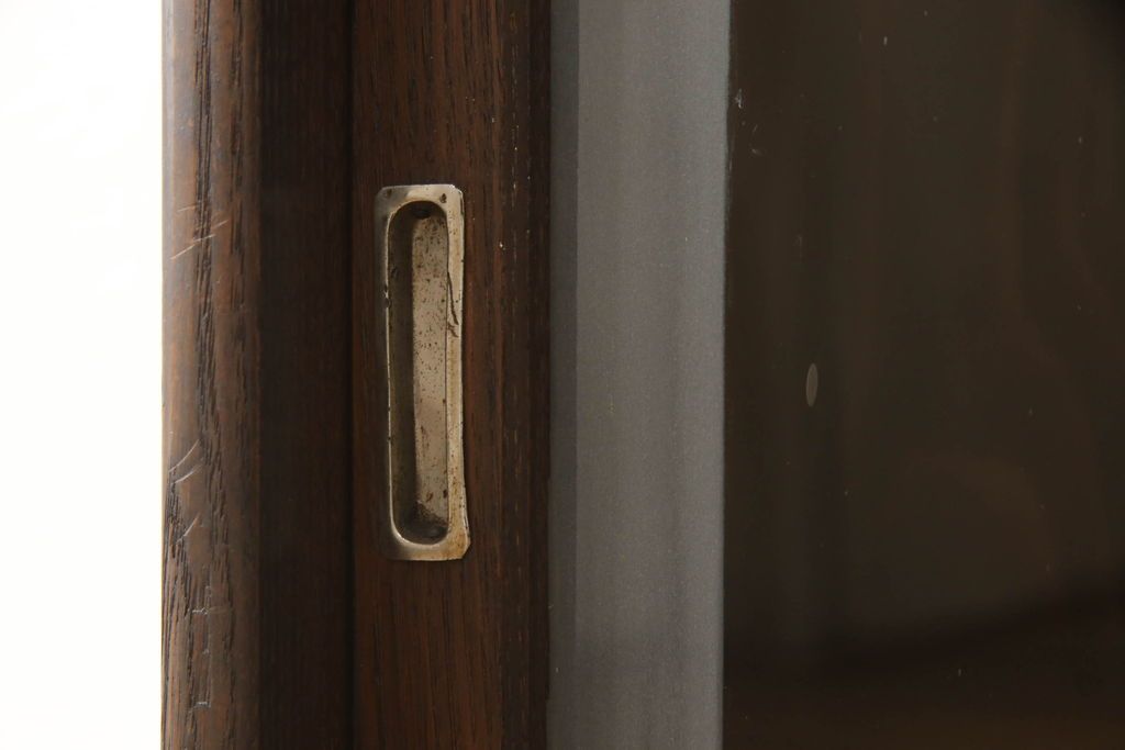 セミオーダー家具実績 > ガラス戸棚をリペア&カスタム!取っ手は似た雰囲気のものに交換。木部は現状の品物に合わせて1トーン程落ち着いた色に着色し、内部棚板・修繕箇所は本体と馴染むように。(飾り棚、収納棚、キャビネット)