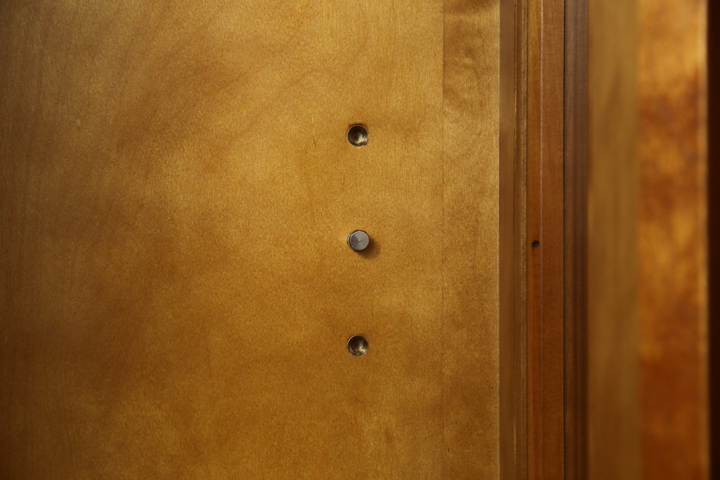・棚板は上段2枚、下段1枚あります。棚受けは上段6ヶ所・下段3ヶ所あり、それぞれ40mmピッチで調整できます。