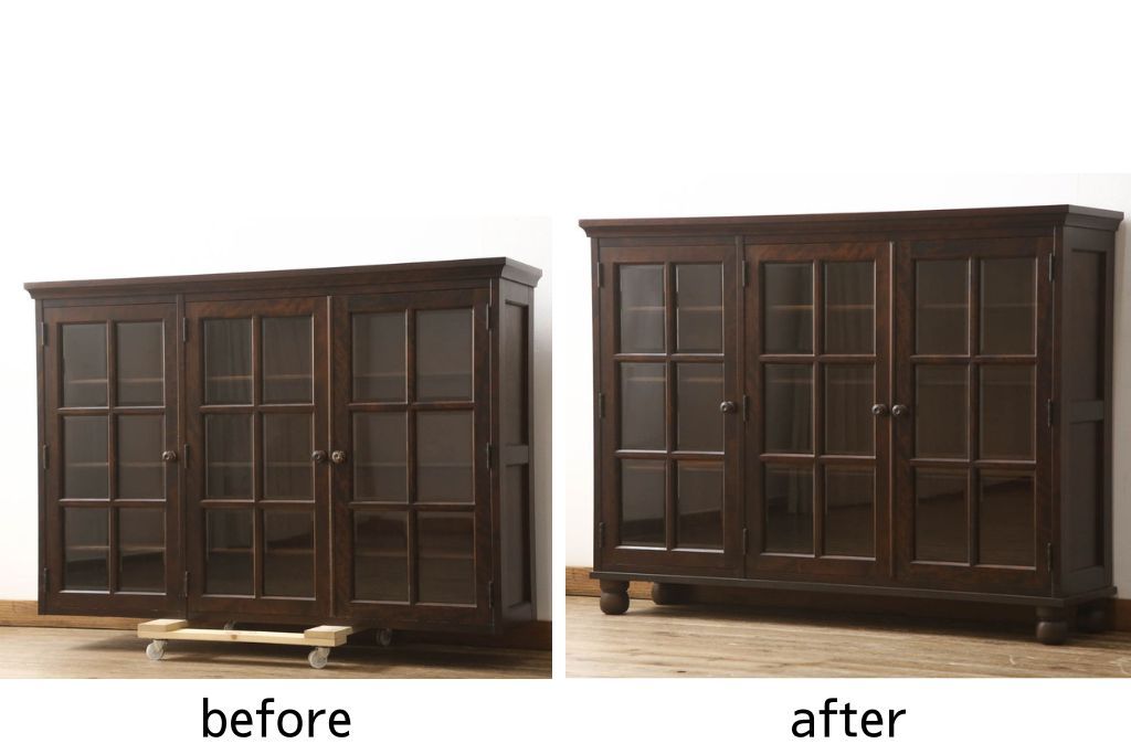セミオーダー家具実績 > キャビネットをリペア&カスタム!木製の脚を取り付け、本体は現状をベースにして1トーン程落ち着いた色味に着色して仕上げ。(食器棚、カップボード、飾り棚、収納棚、本箱、ブックケース、サイドボード、サイドキャビネット)