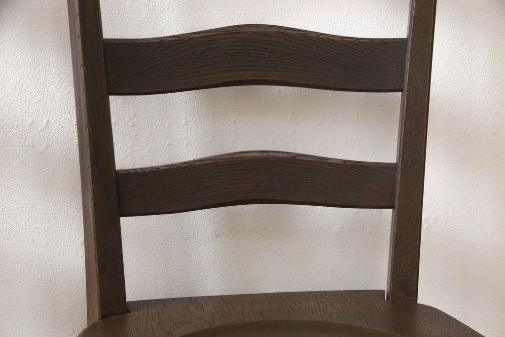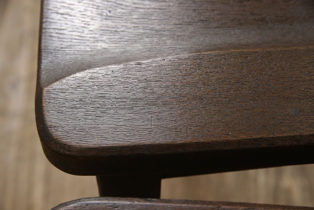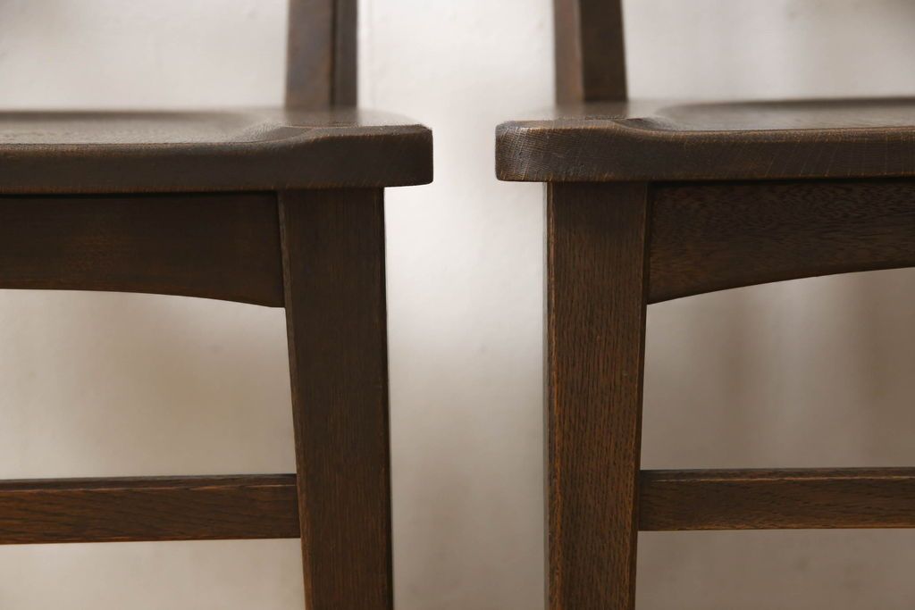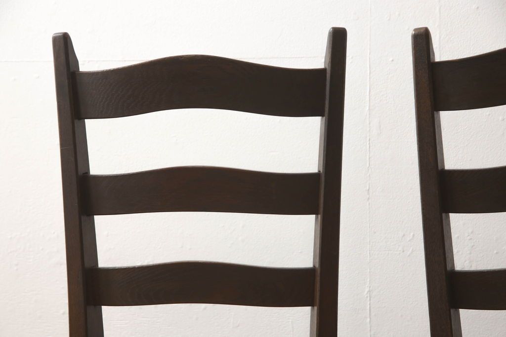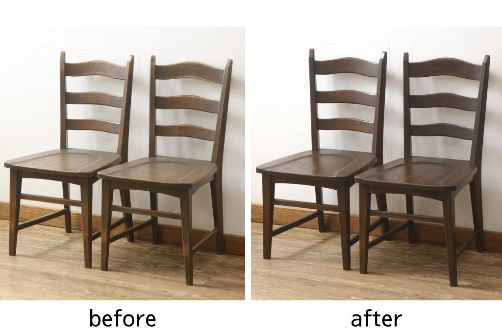 セミオーダー家具実績 > ラダー型食堂椅子2脚をリペア&カスタム!座面までの高さをリサイズし、修繕箇所は本体と馴染ませ、木部は現状をベースにして1トーン程落ち着いた色味に着色。(ダイニングチェア、ラダーバックチェア、ワークチェア、椅子、板座チェア)