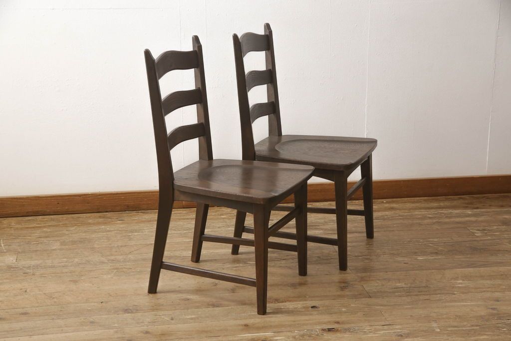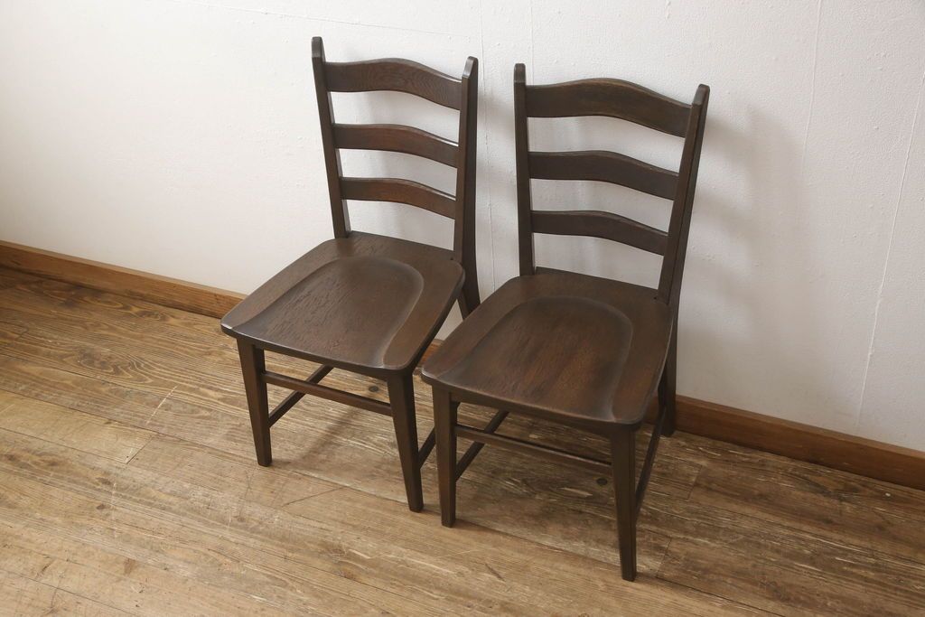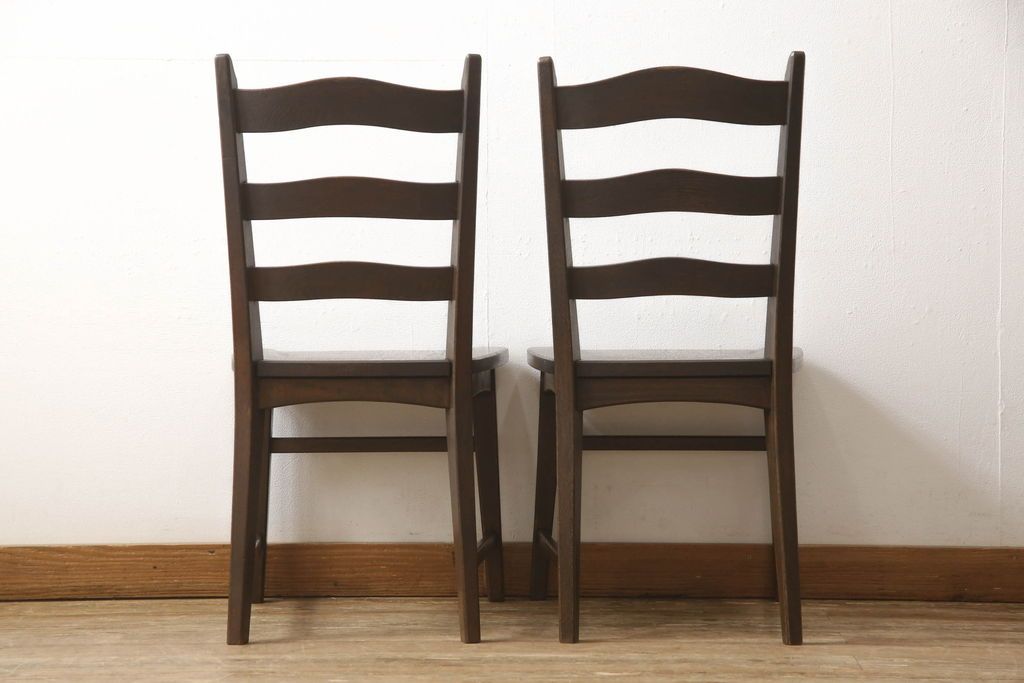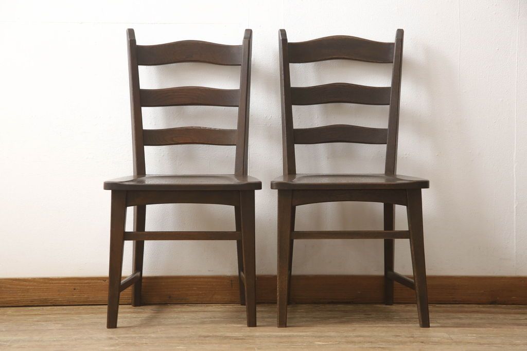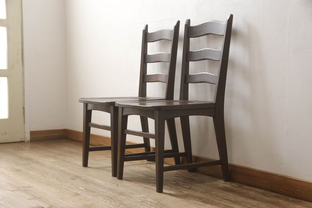 ラダー型食堂椅子2脚をリペア&カスタム!座面までの高さをリサイズし、修繕箇所は本体と馴染ませ、木部は現状をベースにして1トーン程落ち着いた色味に着色。(ダイニングチェア、ラダーバックチェア、ワークチェア、椅子、板座チェア)