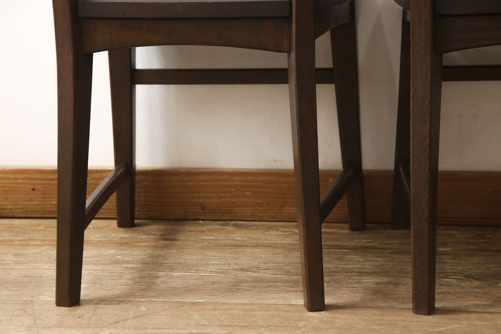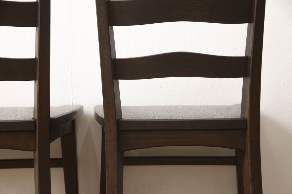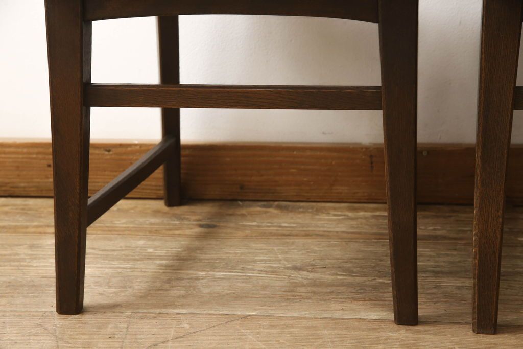 椅子・ベンチ> ダイニングチェア > ラダー型食堂椅子2脚をリペア&カスタム!座面までの高さをリサイズし、修繕箇所は本体と馴染ませ、木部は現状をベースにして1トーン程落ち着いた色味に着色。(ダイニングチェア、ラダーバックチェア、ワークチェア、椅子、板座チェア)