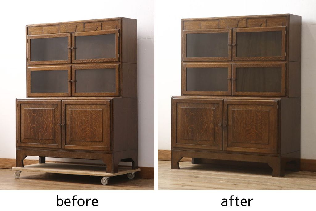 セミオーダー家具実績 > スタッキングブックケースをリペア&カスタム!下段棚の中仕切りを全て取り外し。修繕箇所は本体と馴染ませ、木部は現状をベースにして1トーン程落ち着いた色味に着色。(本箱、収納棚、キャビネット)