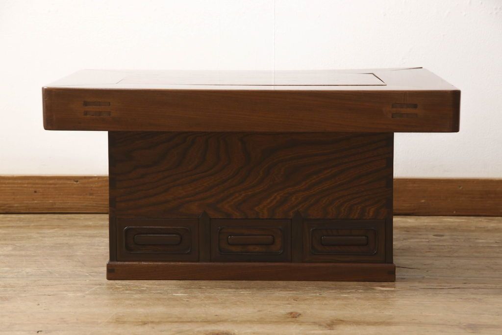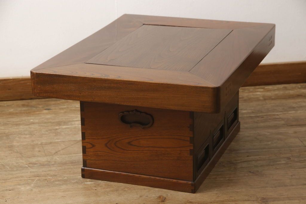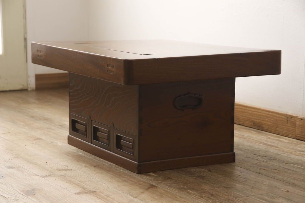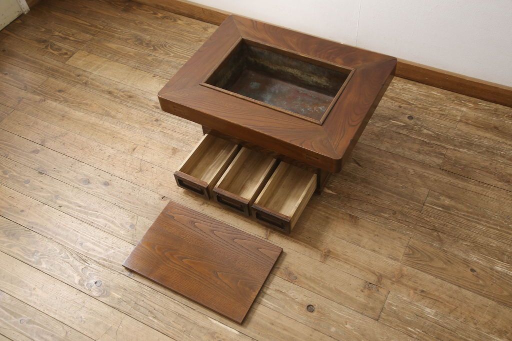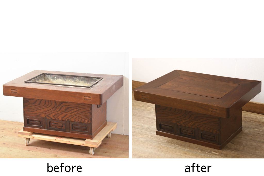 セミオーダー家具実績 > 関西火鉢をリペア&カスタム!蓋は開口部に合わせ木目の近い栗材で新規製作。蓋の色味は本体に合わせ、本体は現状をベースに着色。(囲炉裏、長火鉢、座卓、ローテーブル)