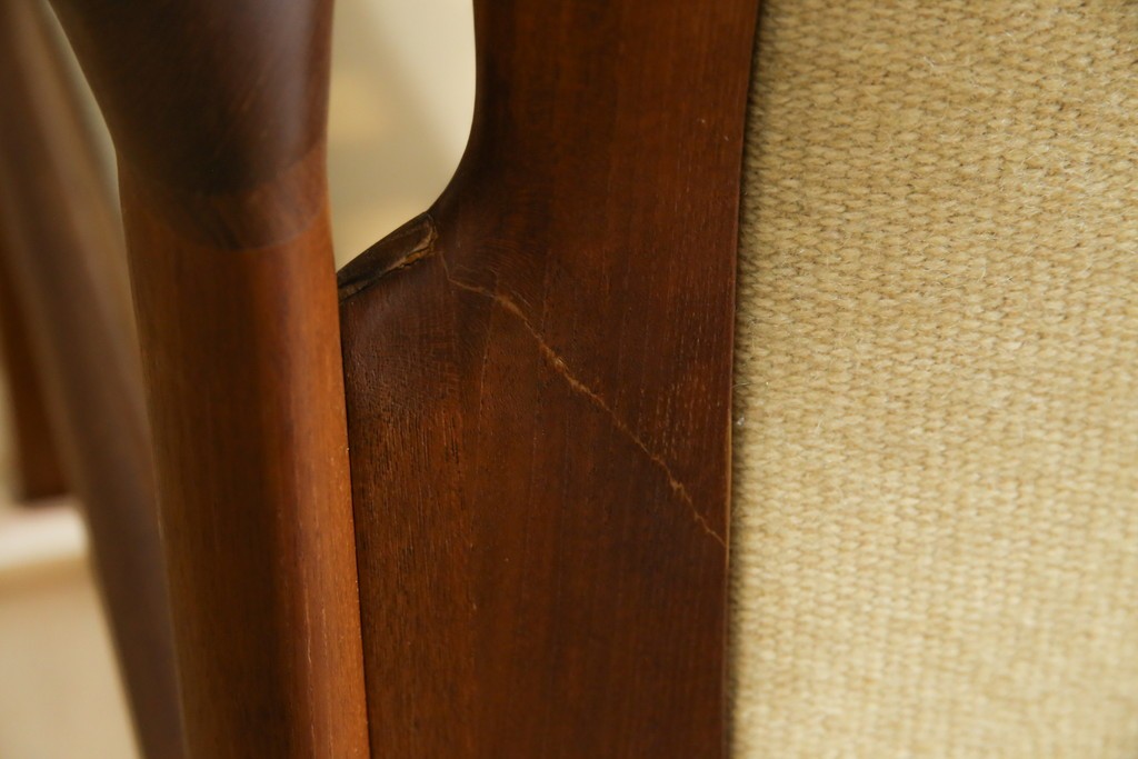 ・画像の通り、背もたれ部分にヒビがございます。補強修理しておりますので使用上、強度上に問題はありません。