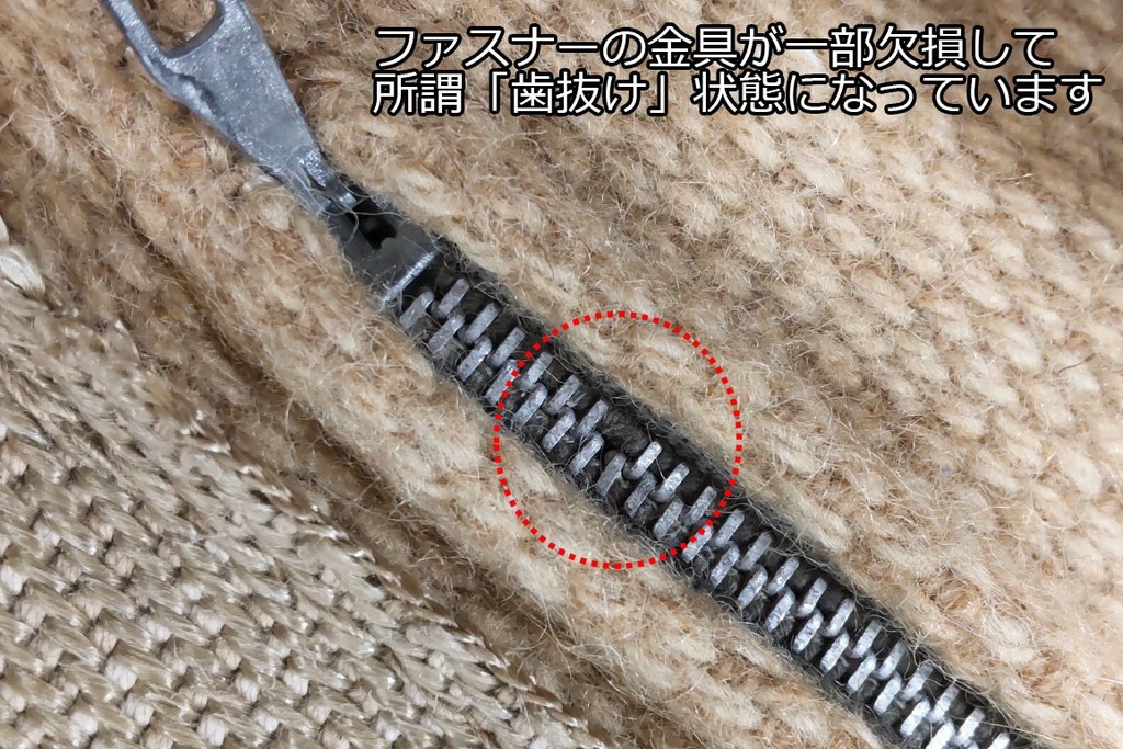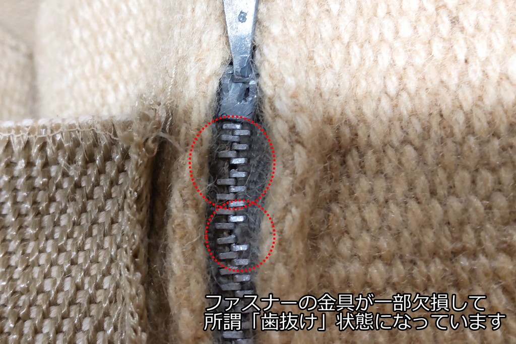 ・画像の通り、ファスナーにダメージがございます。現状実使用に問題はありませんが、ファスナーを開閉する際は優しくお願いいたします。
