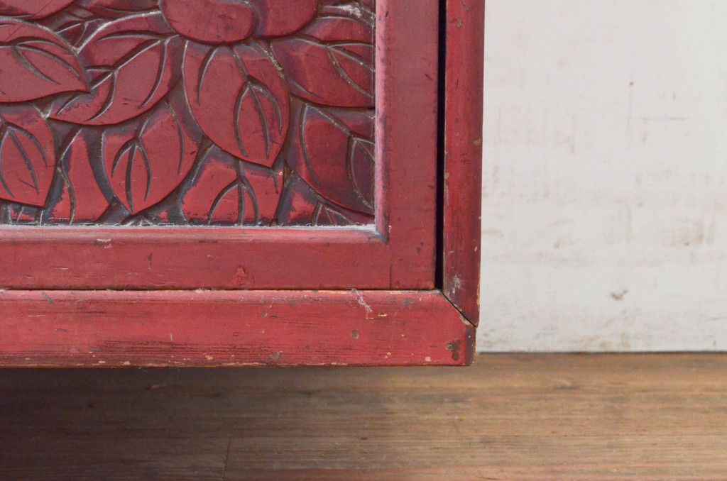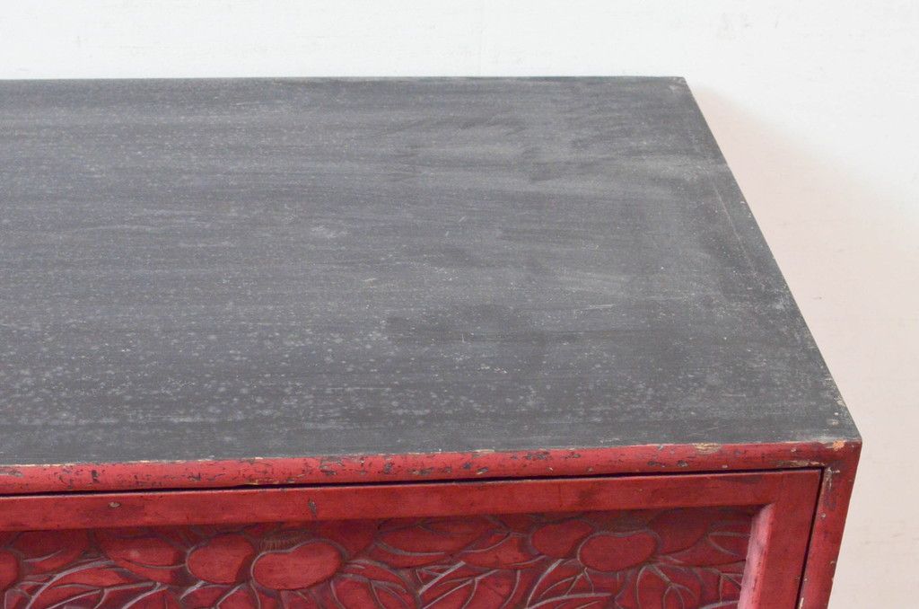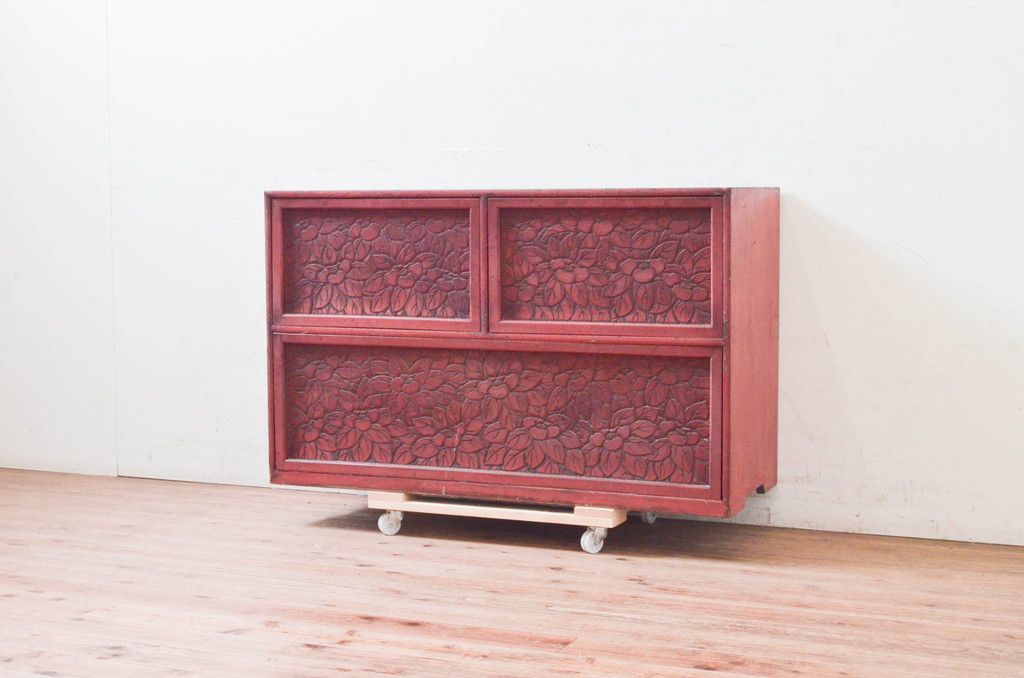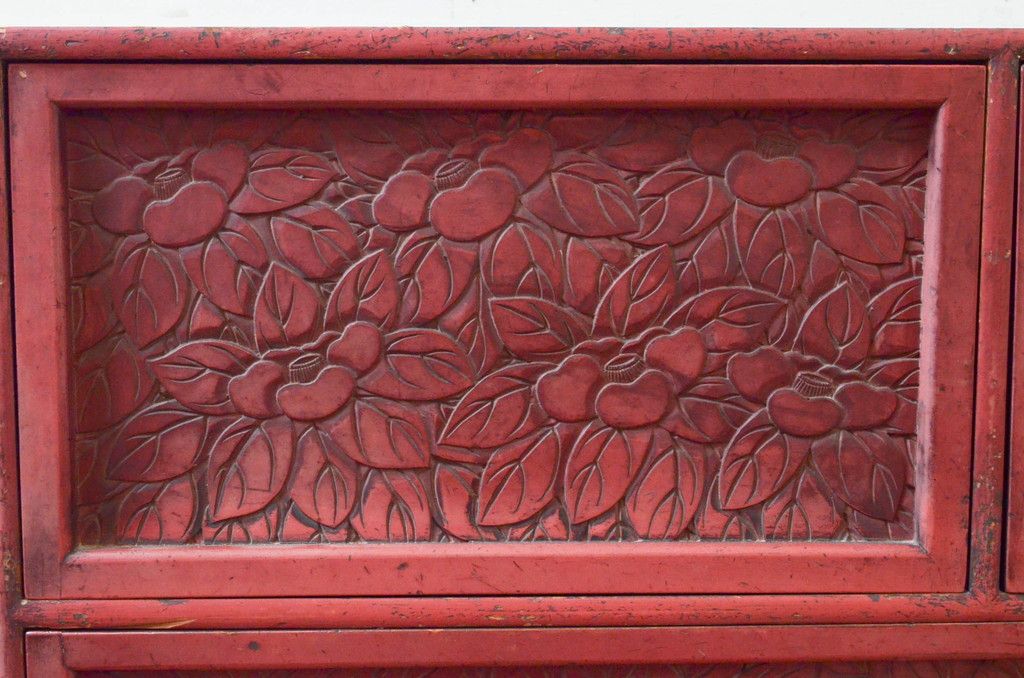 和製アンティーク 希少 上手物!! 椿と孔雀の彫りが見事な前面堆朱のローチェスト(サイドチェスト、引き出し、テレビ台、テレビボード)(R-074159)です。