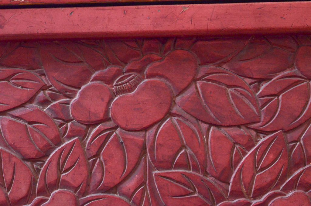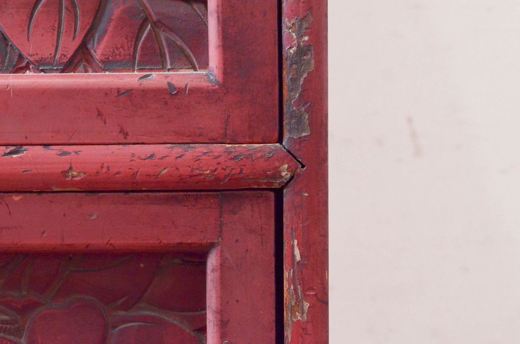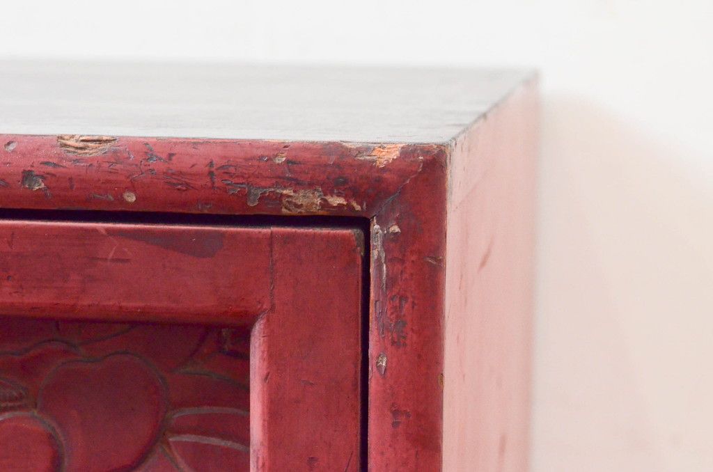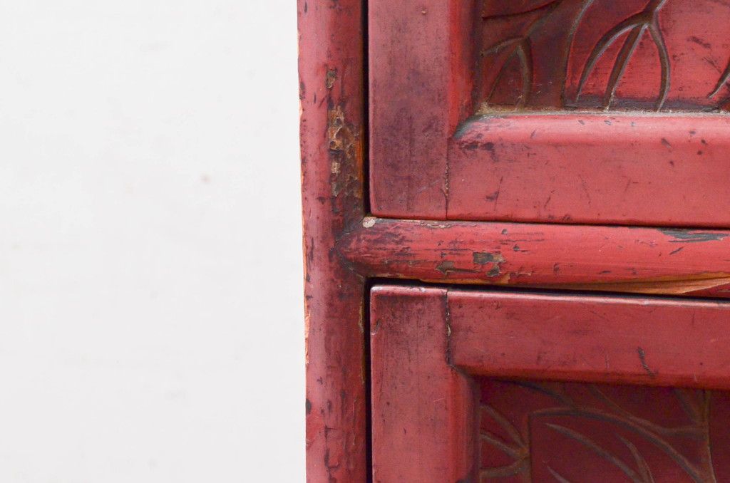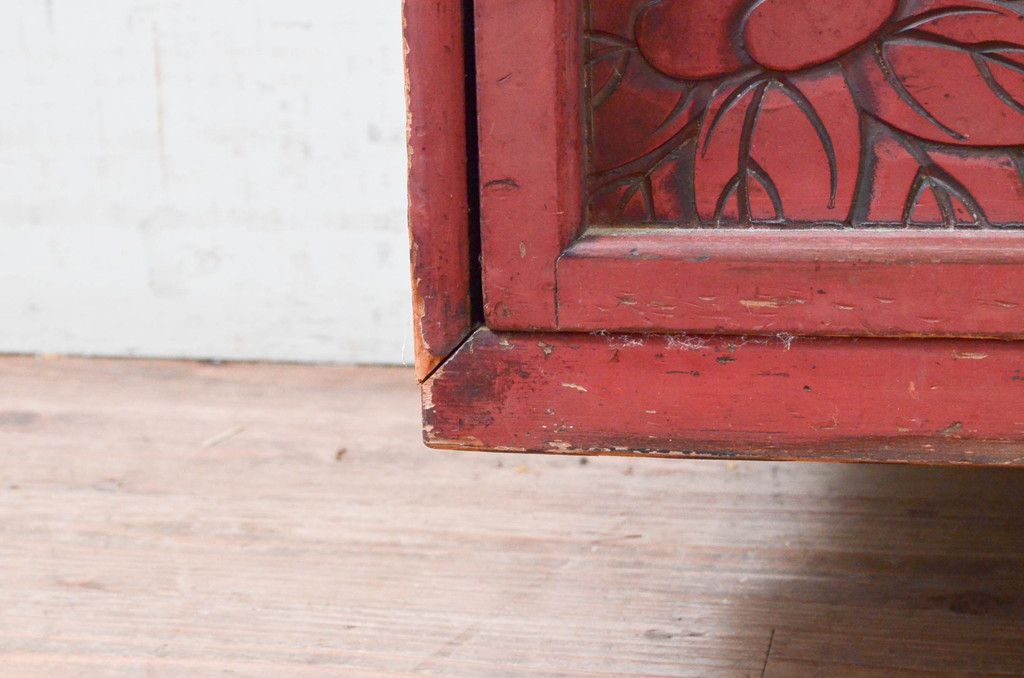 和製アンティーク 希少 上手物!! 椿と孔雀の彫りが見事な前面堆朱のローチェスト(サイドチェスト、引き出し、テレビ台、テレビボード)(R-074159)です。