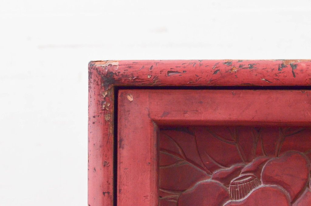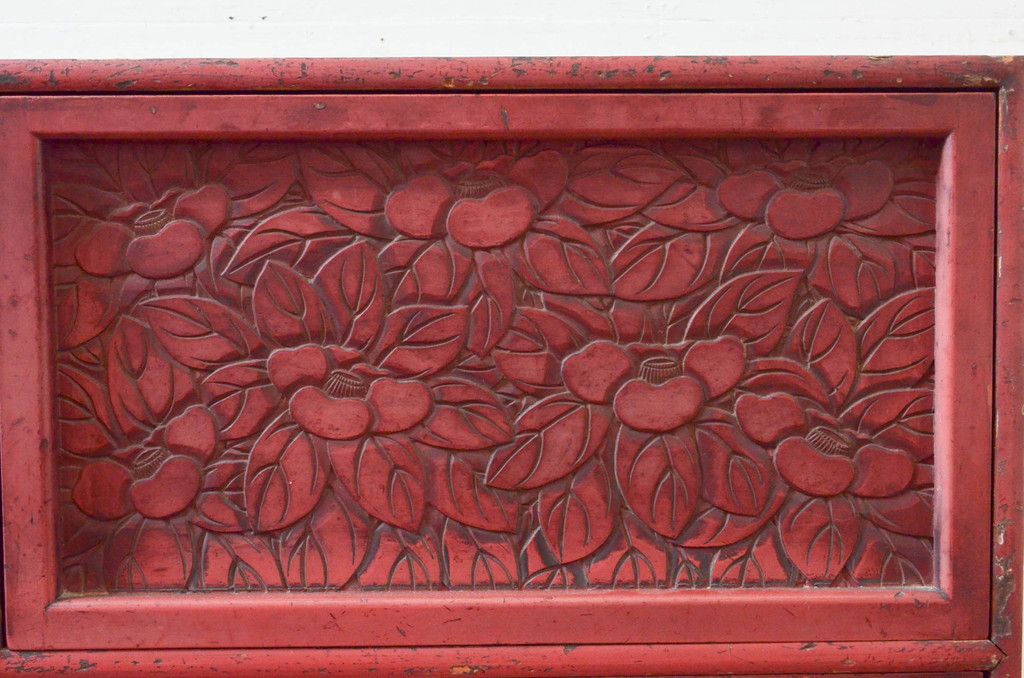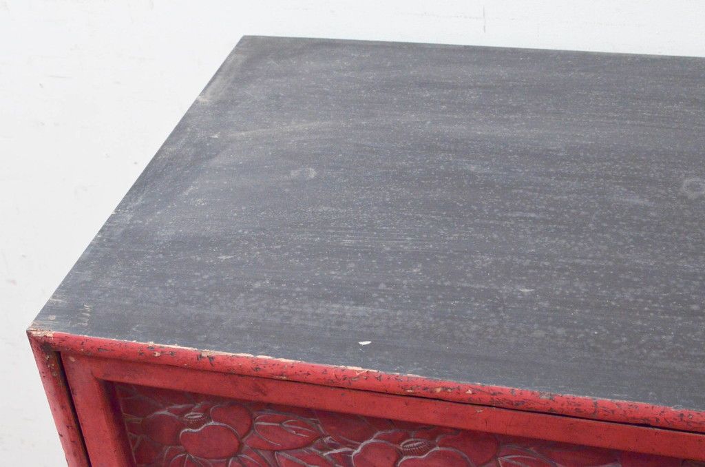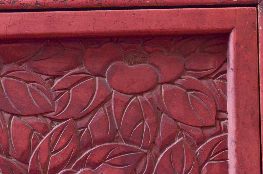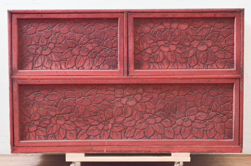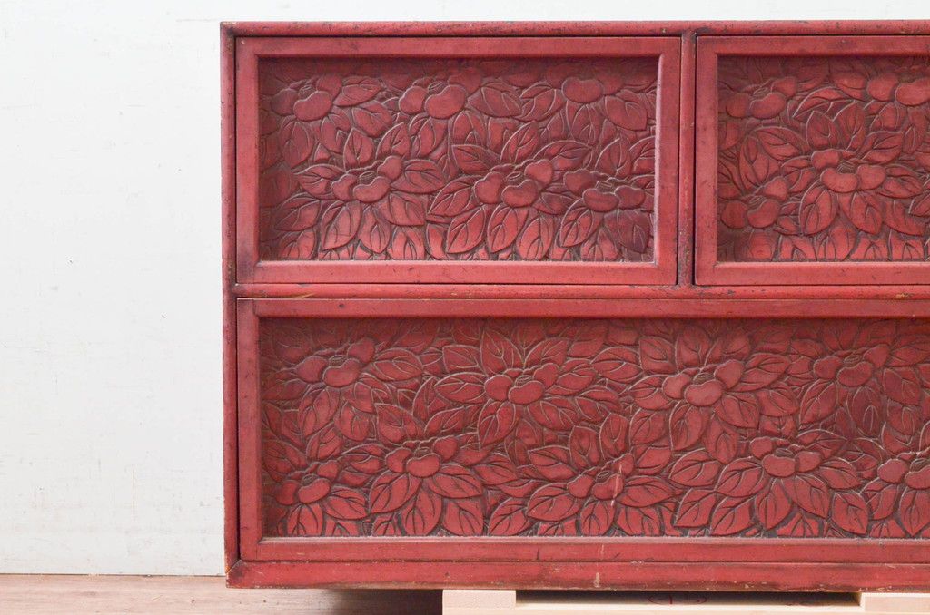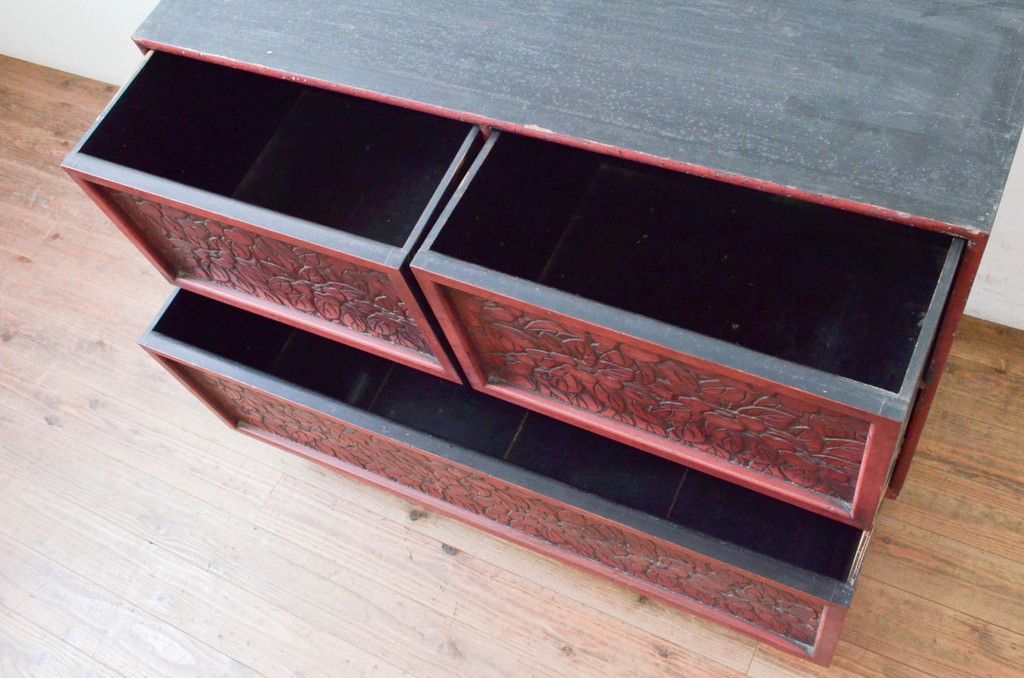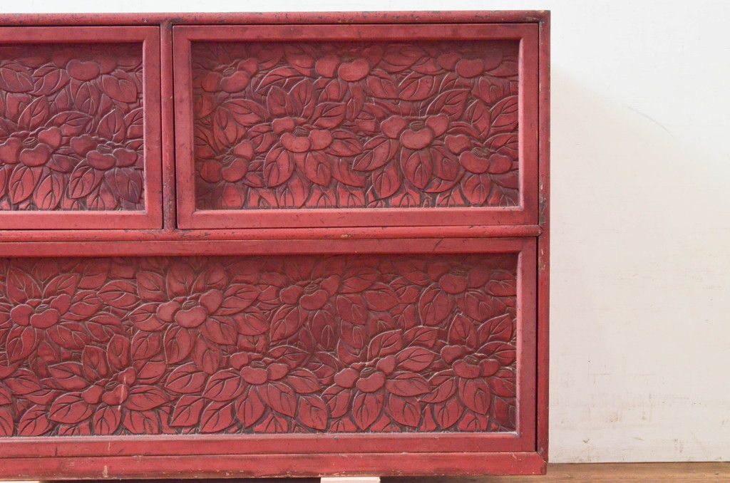 和製アンティーク 希少 上手物!! 椿と孔雀の彫りが見事な前面堆朱のローチェスト(サイドチェスト、引き出し、テレビ台、テレビボード)(R-074159)