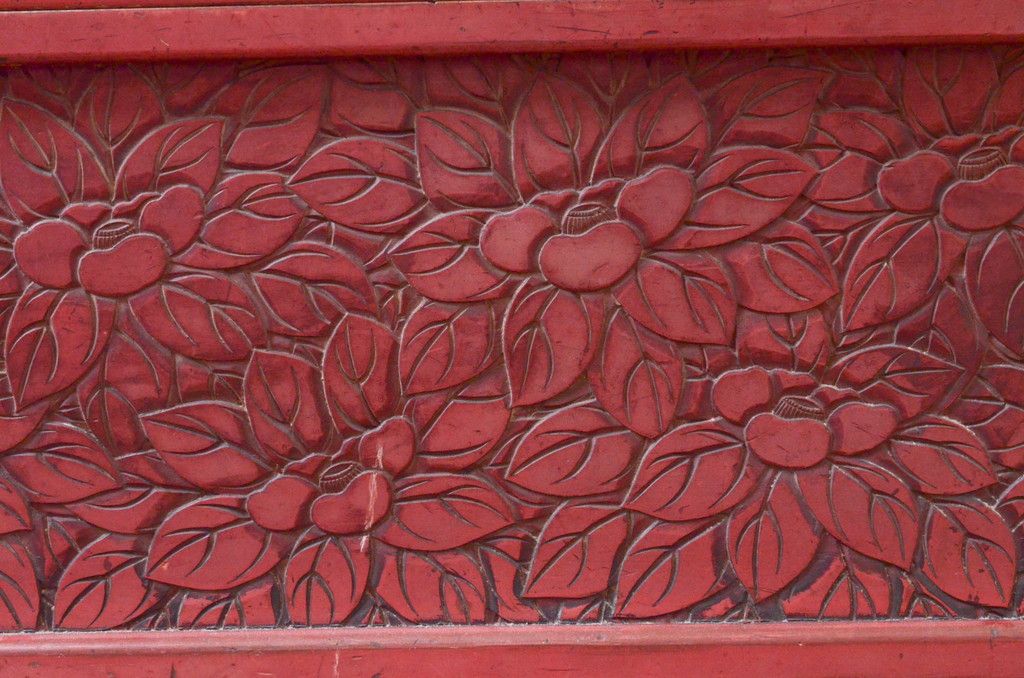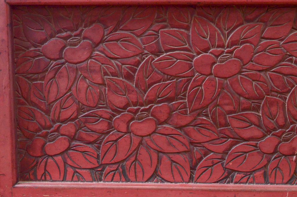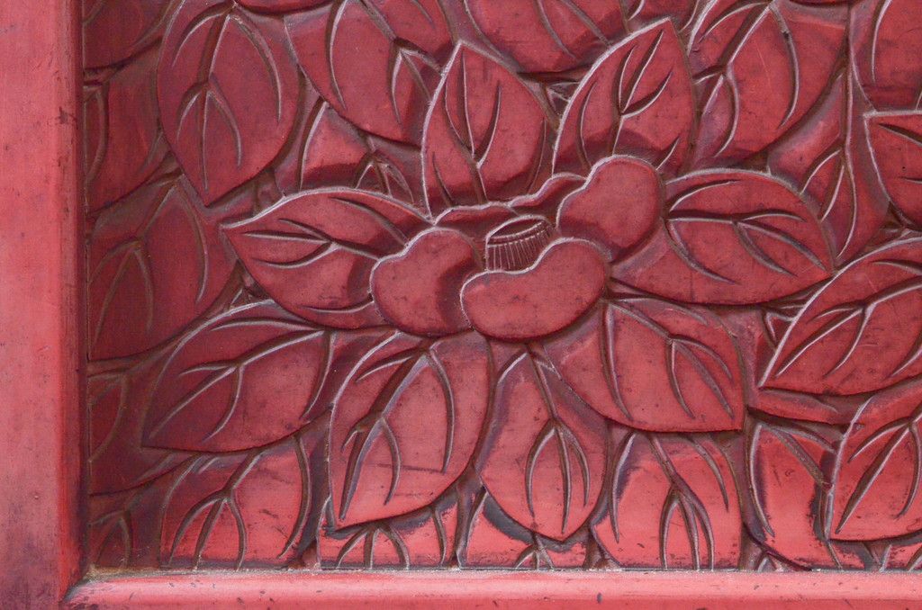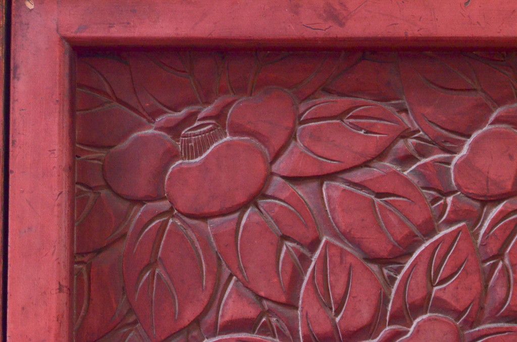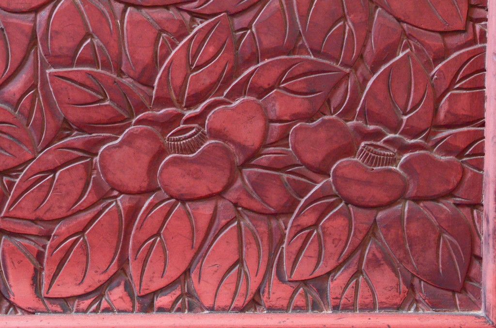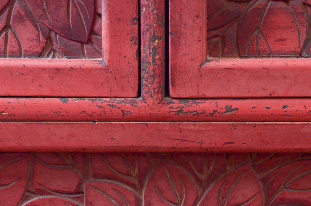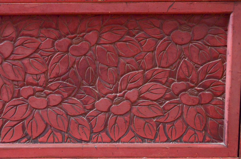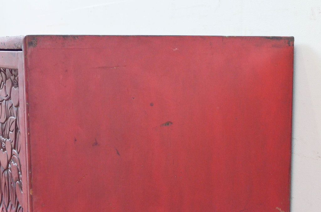 和製アンティーク 希少 上手物!! 椿と孔雀の彫りが見事な前面堆朱のローチェスト(サイドチェスト、引き出し、テレビ台、テレビボード)(R-074159)