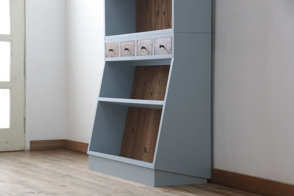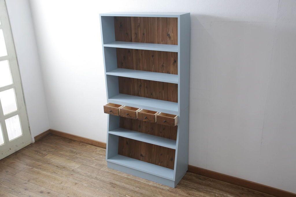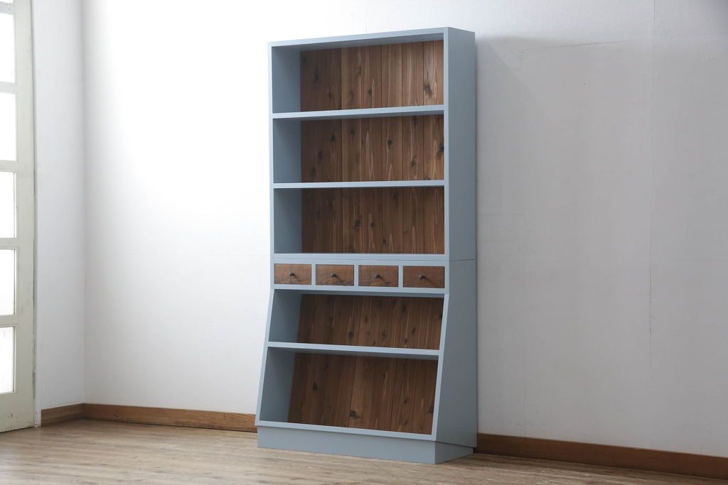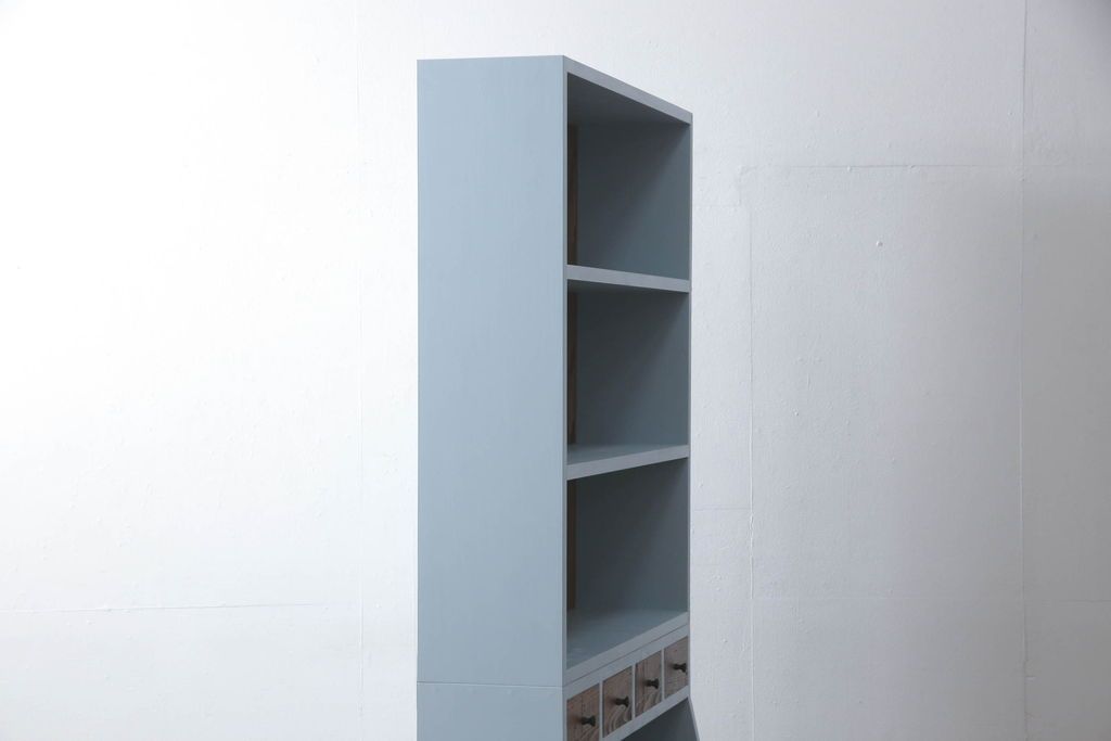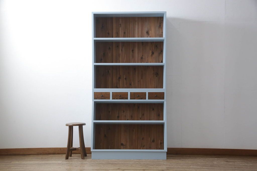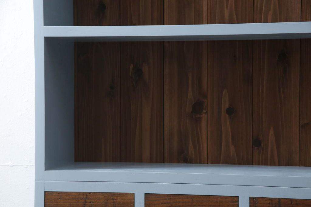 オープンラック・シェルフ> 本棚 > 本棚を新規製作!本体はヒノキ無垢材を使用し、上下分割できる仕様に。くすんだ水色にペイント仕上げ。(ブックシェルフ、収納棚、ウッドシェルフ)