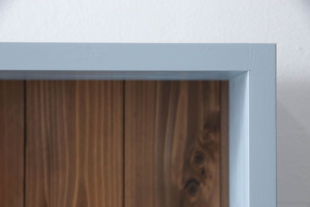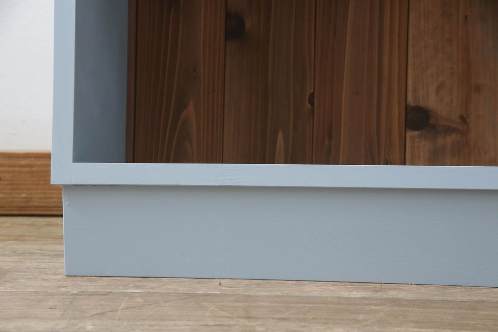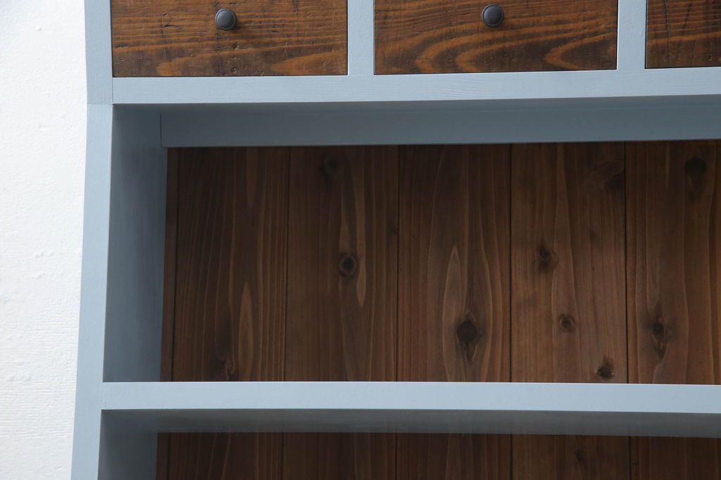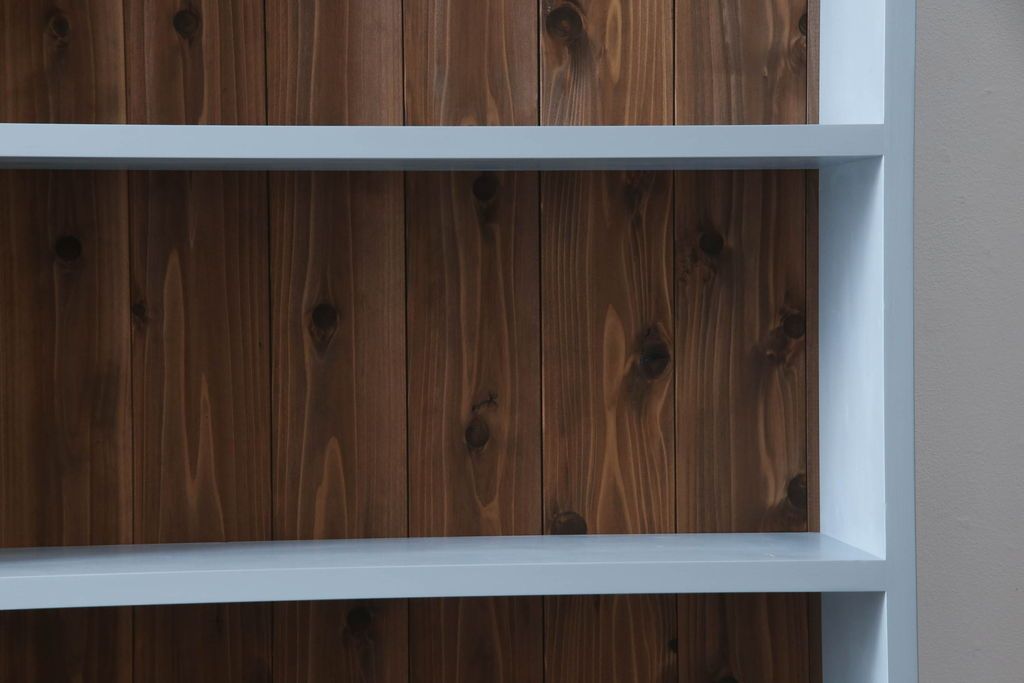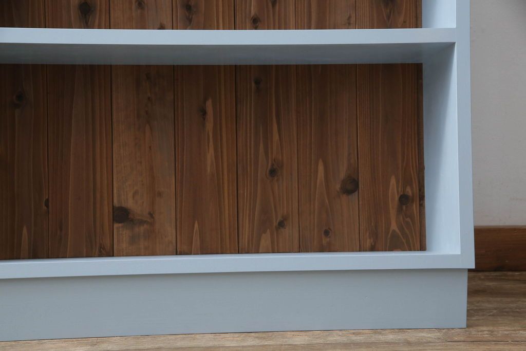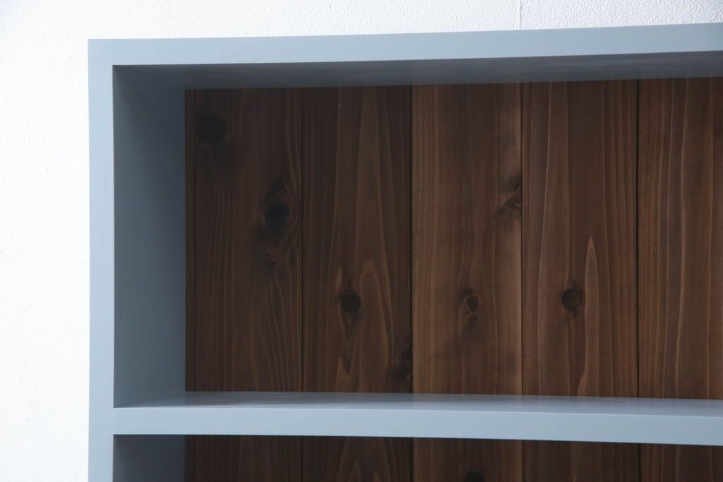 オープンラック・シェルフ > 本棚を新規製作!本体はヒノキ無垢材を使用し、上下分割できる仕様に。くすんだ水色にペイント仕上げ。(ブックシェルフ、収納棚、ウッドシェルフ)