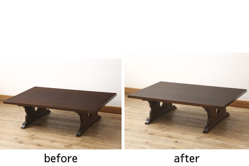 ラフジュ工房> セミオーダー家具実績 > 松本民芸家具の折りたたみ座卓の見た目を変えずに奇麗にリペア!天板の塗装を剥離し、輪ジミのできにくい塗料で再塗装。(ローテーブル、ちゃぶ台、文机、センターテーブル、折り畳み)