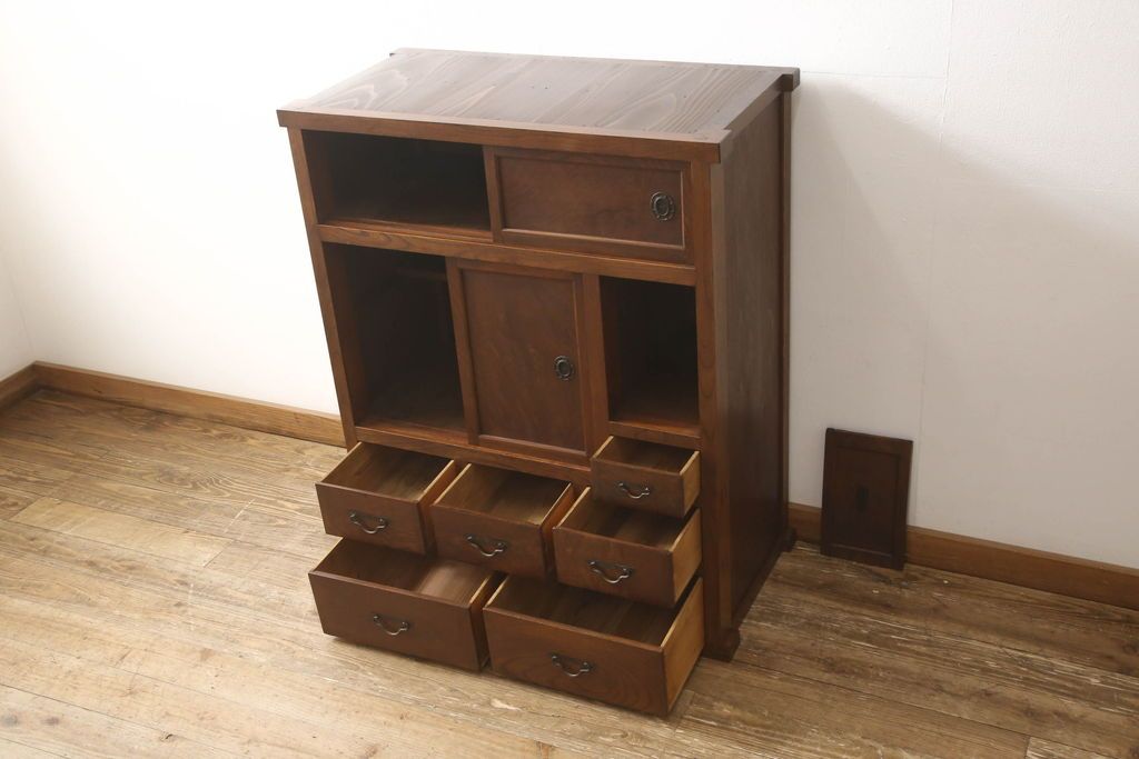 キャビネット・戸棚> サイドキャビネット > 大正昭和初期の収納箪笥の見た目を変えずに奇麗にリペア!引手や取っ手の金具部分は現状のものを使用。現状の色味をベースにワントーン程濃くなるように着色。(関東水屋箪笥、サイドキャビネット、収納棚、戸棚、茶箪笥)