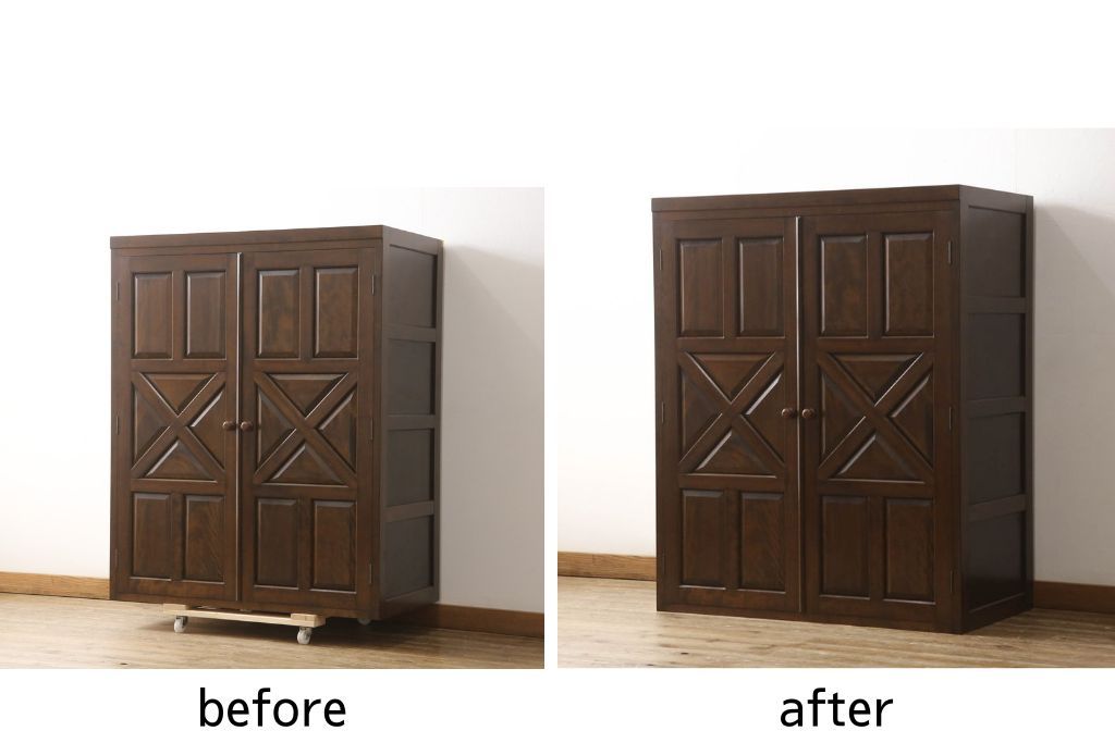 セミオーダー家具実績 > 松本民芸家具の収納棚をリペア&カスタム!お客様のご希望に合わせて棚板を1枚、100mmピッチで棚受けを作成。現状のお品物に合わせて着色。( キャビネット、ワードローブ)