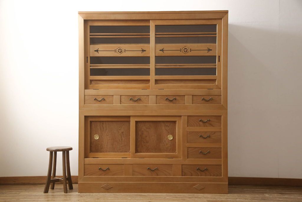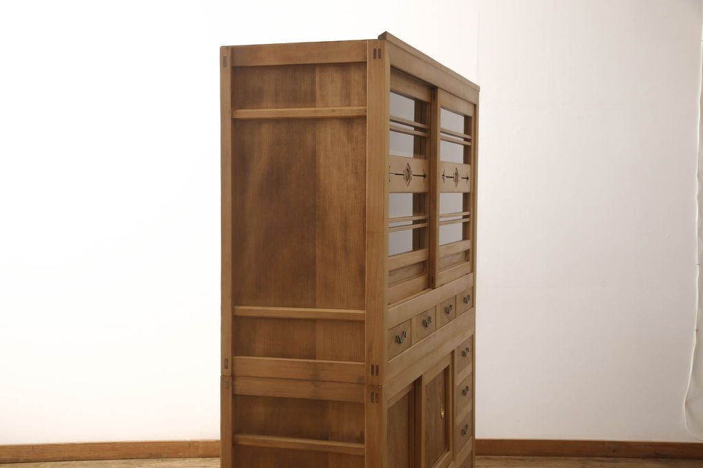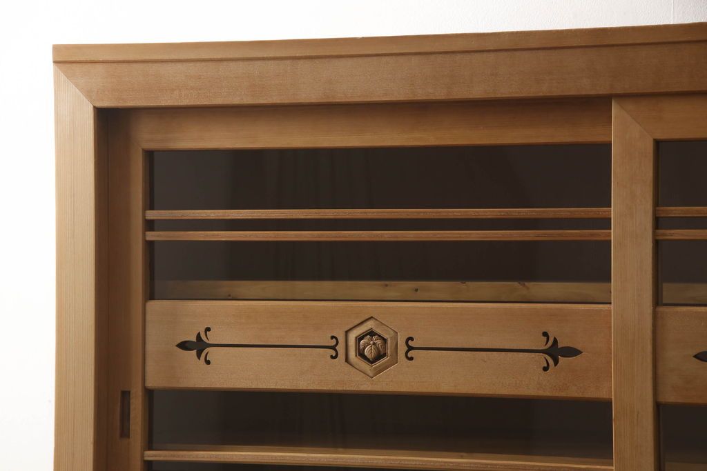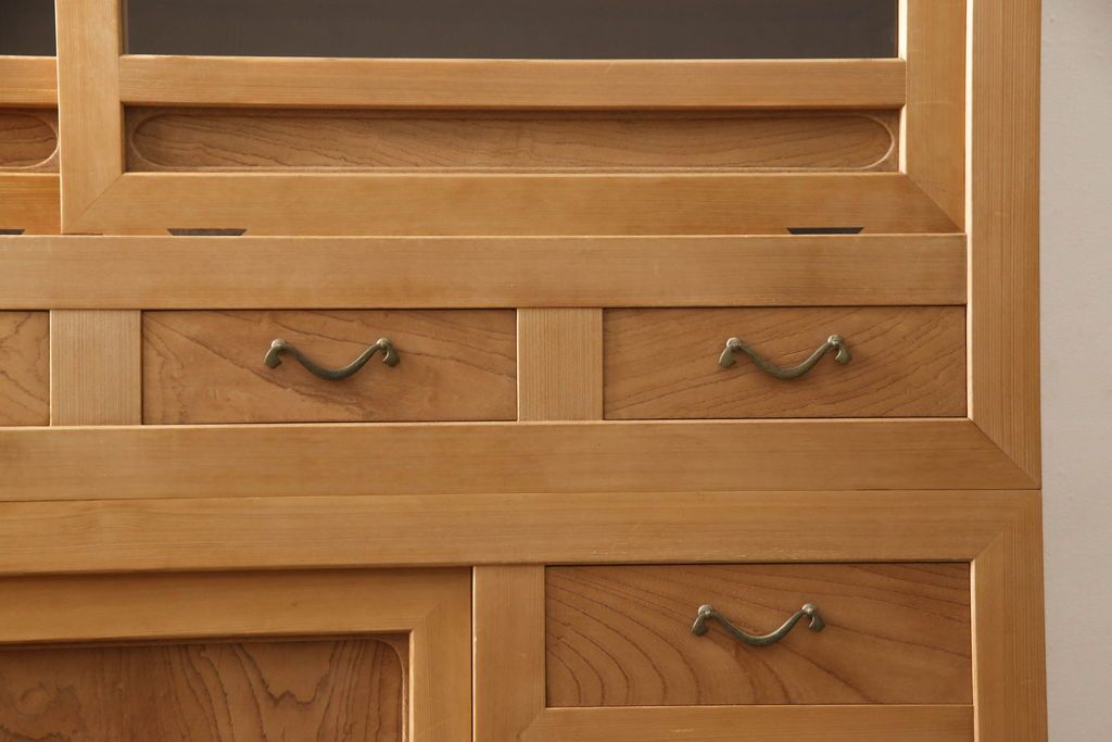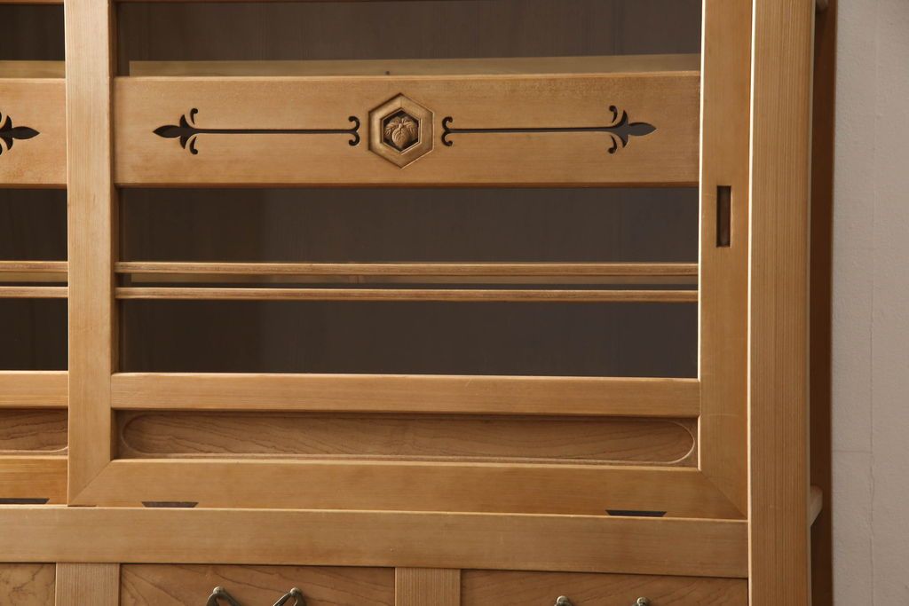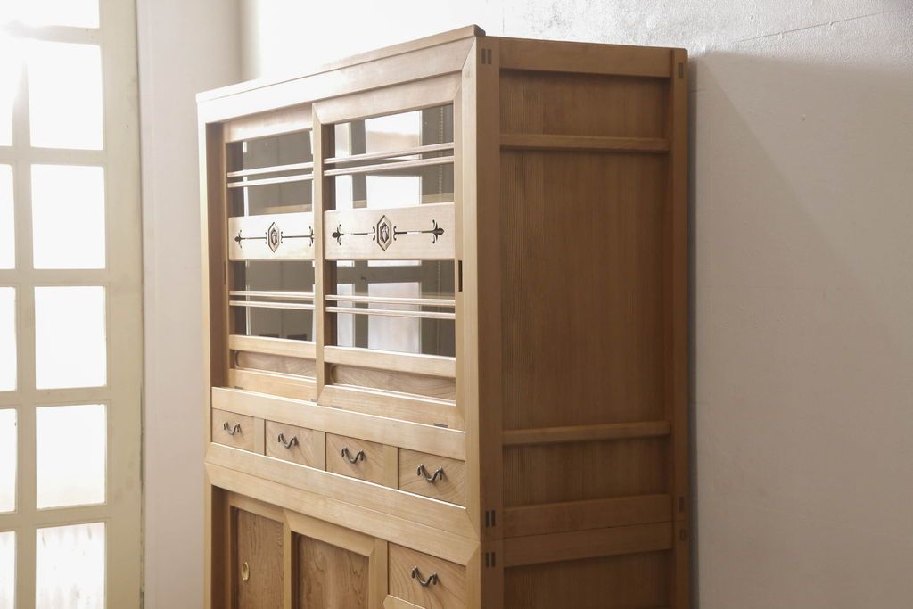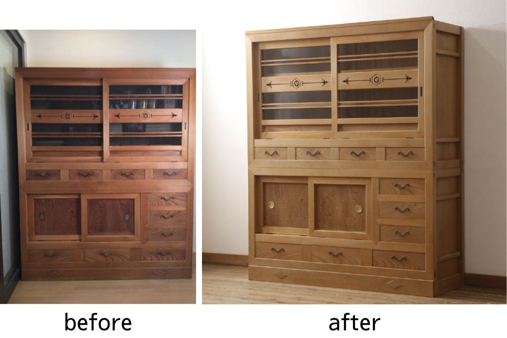 重ね水屋箪笥を綺麗に再生!天板と背板の修理・交換。上段引き戸の金網をガラスに仕様変更。棚板を新規製作、下段の引き戸の引手を交換。クリアワックス仕上げ。