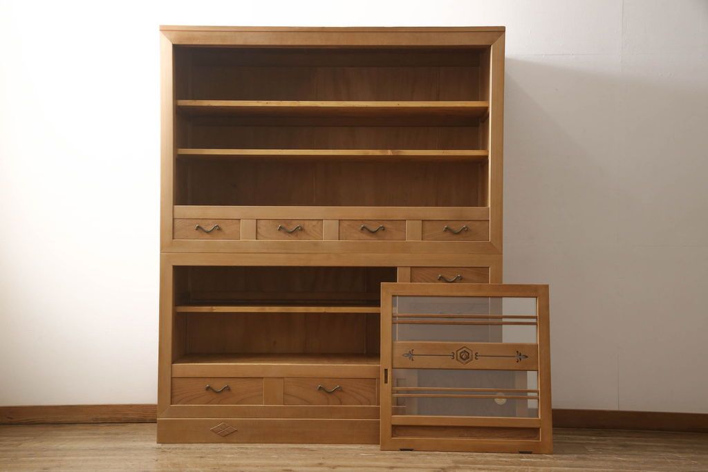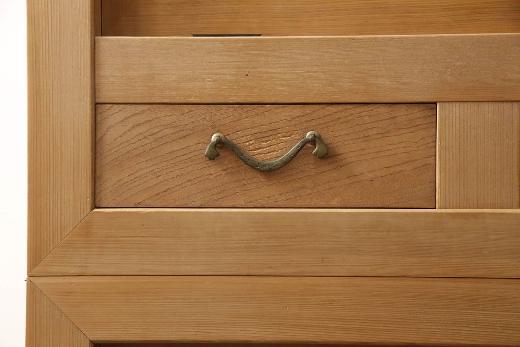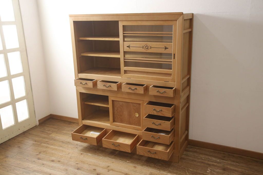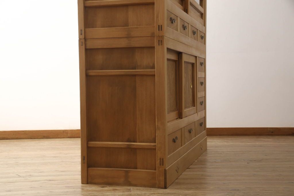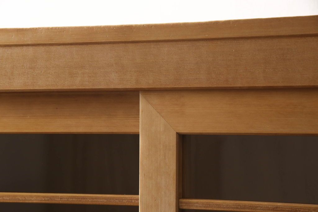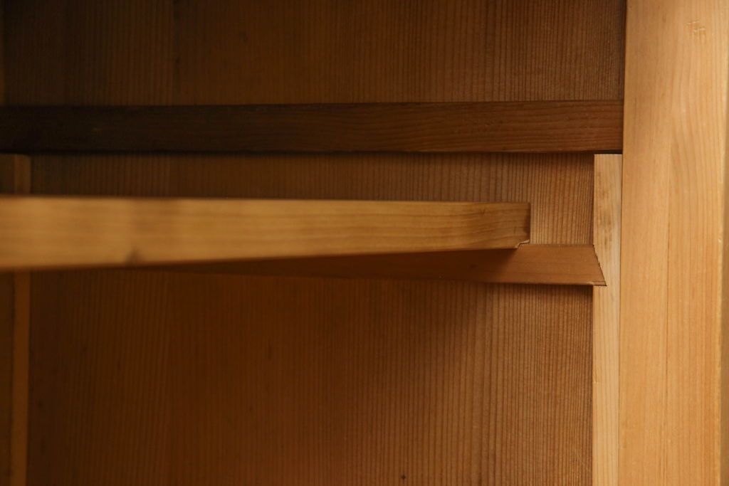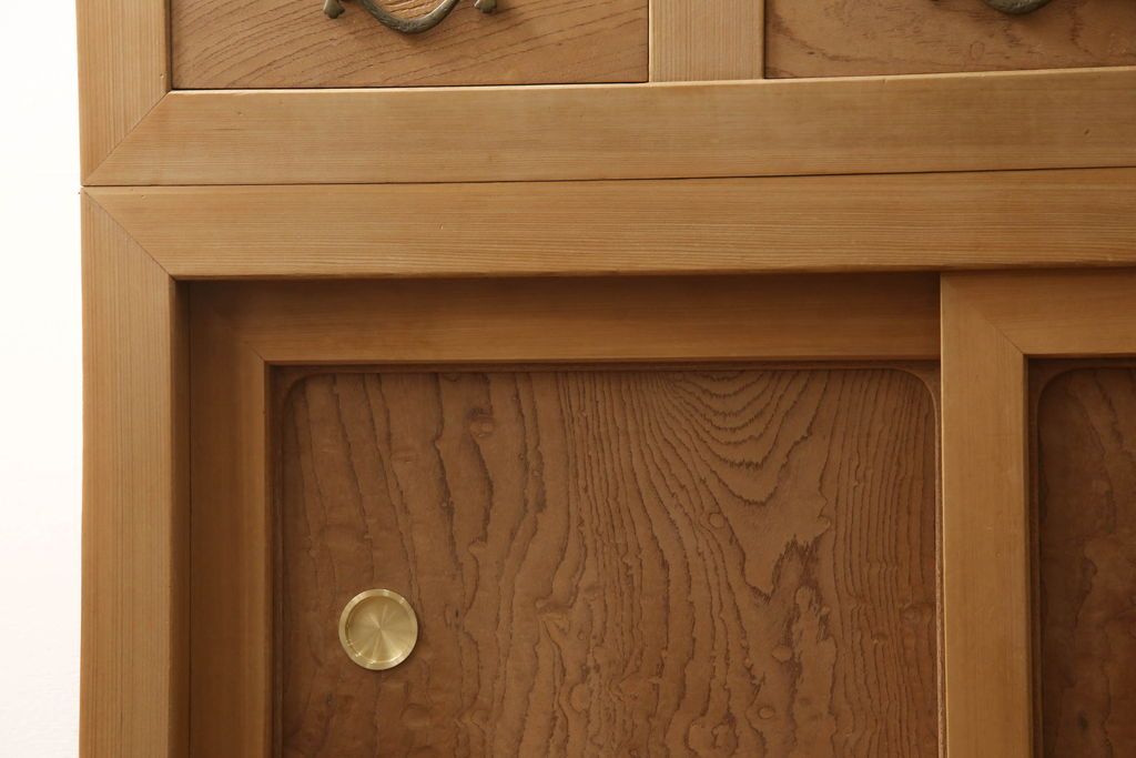重ね水屋箪笥を綺麗に再生!天板と背板の修理・交換。上段引き戸の金網をガラスに仕様変更。棚板を新規製作、下段の引き戸の引手を交換。クリアワックス仕上げ。