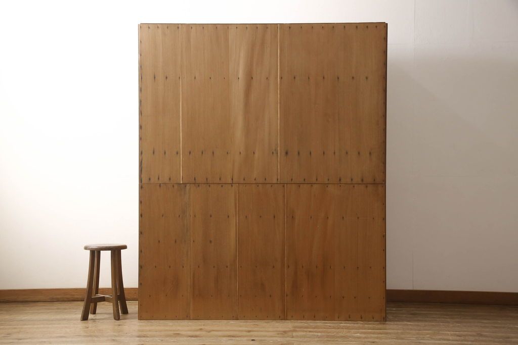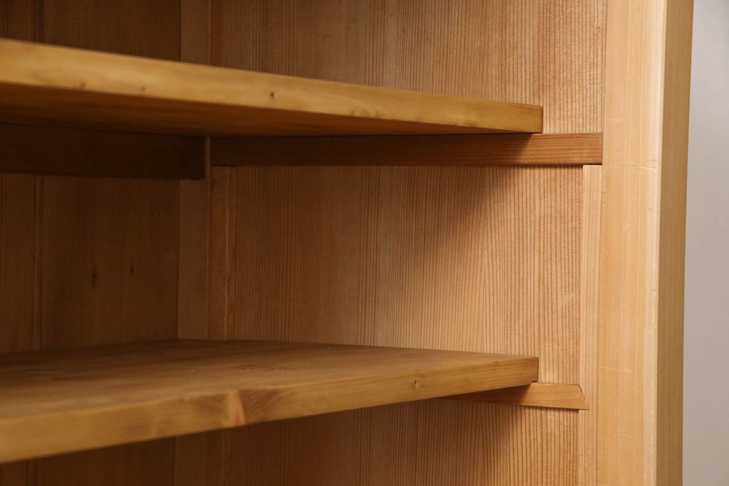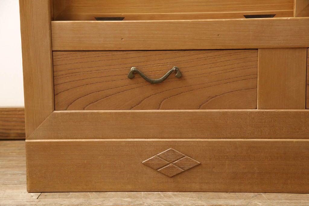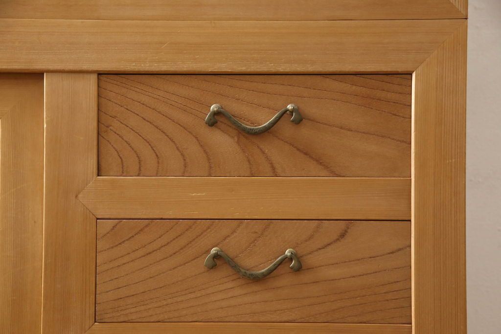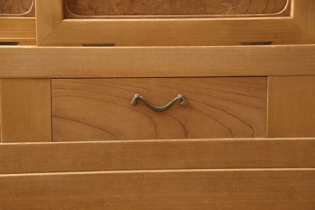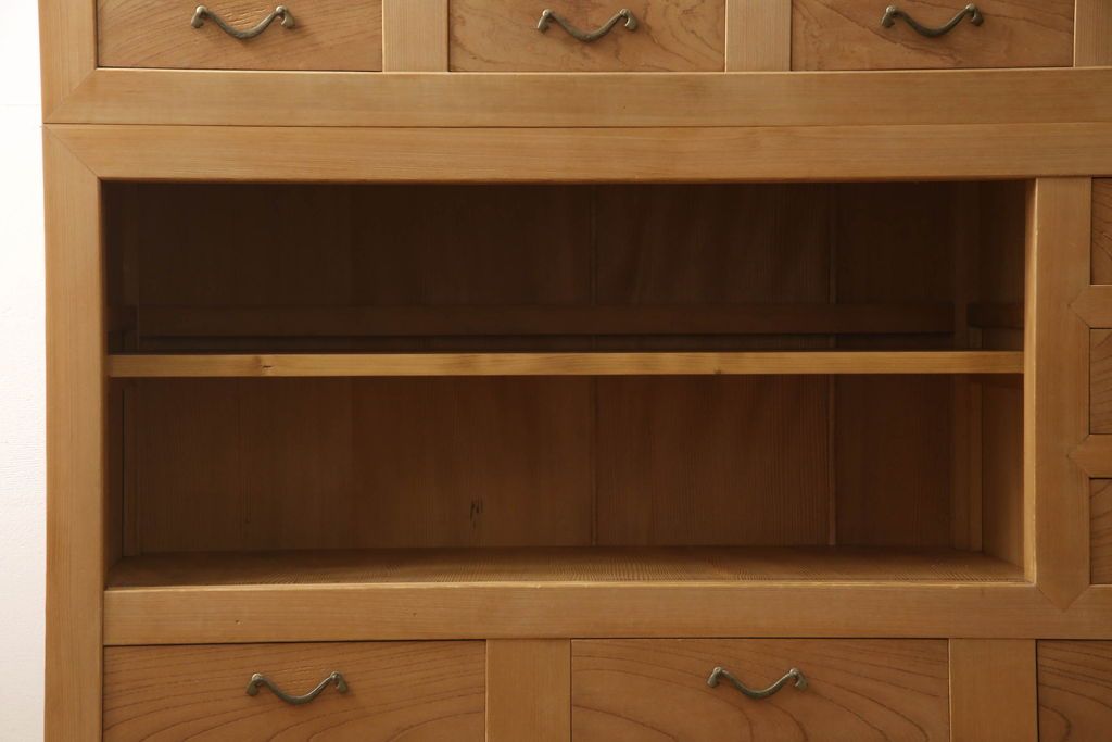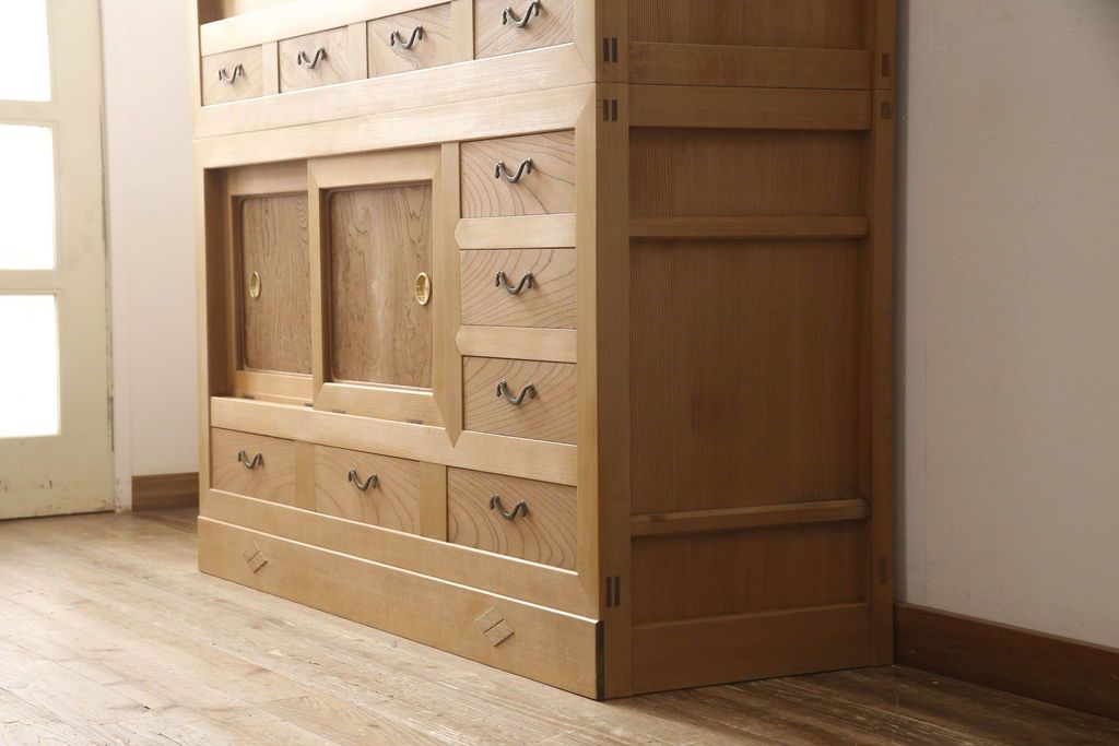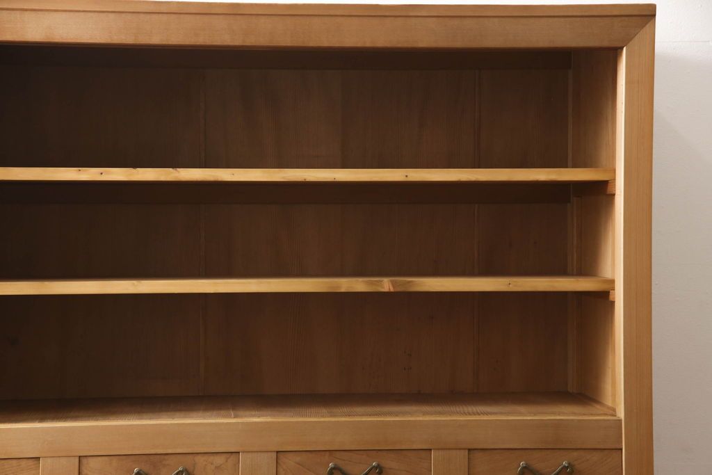 重ね水屋箪笥を綺麗に再生!天板と背板の修理・交換。上段引き戸の金網をガラスに仕様変更。棚板を新規製作、下段の引き戸の引手を交換。クリアワックス仕上げ。