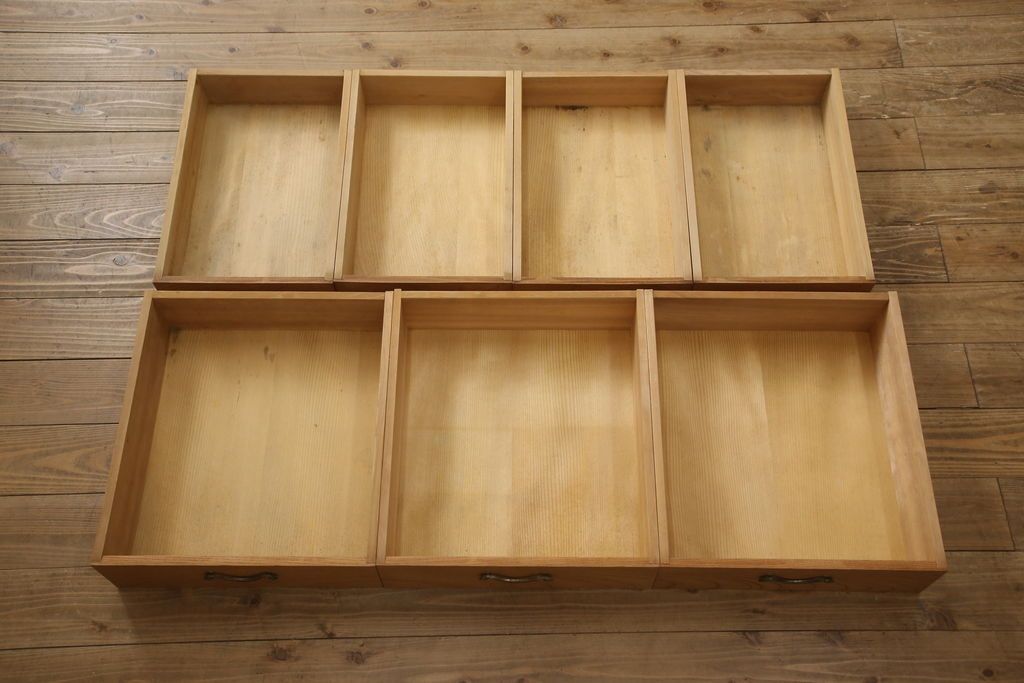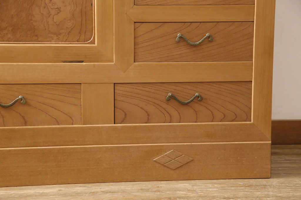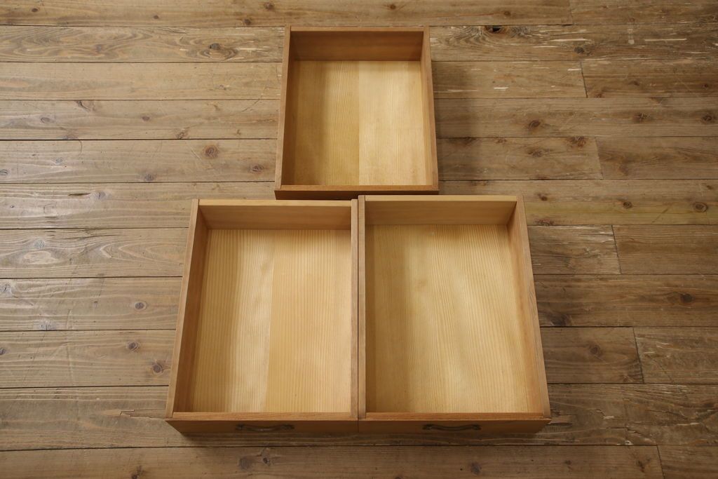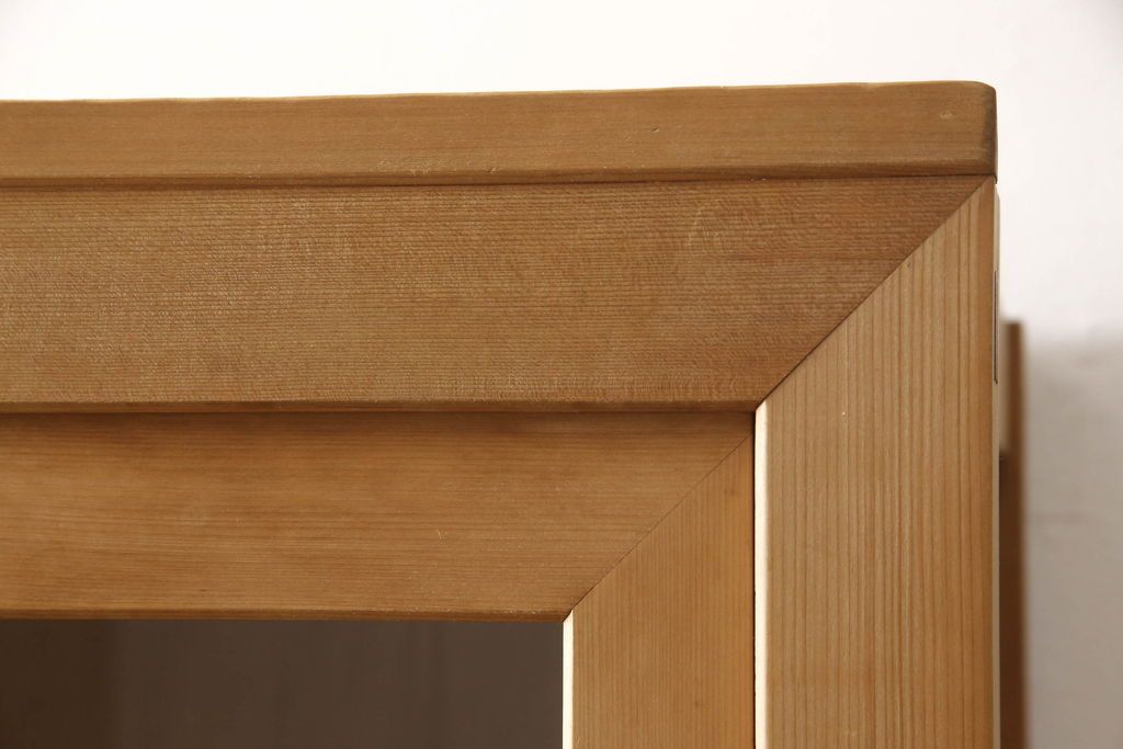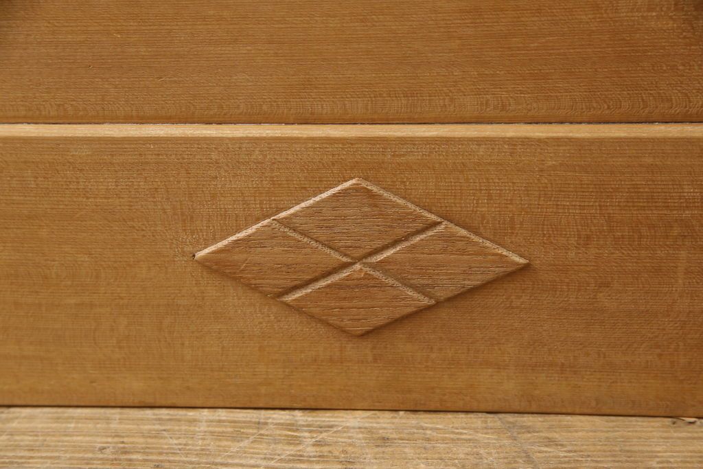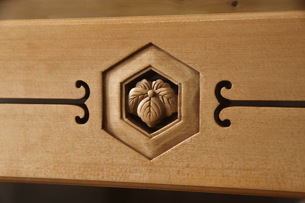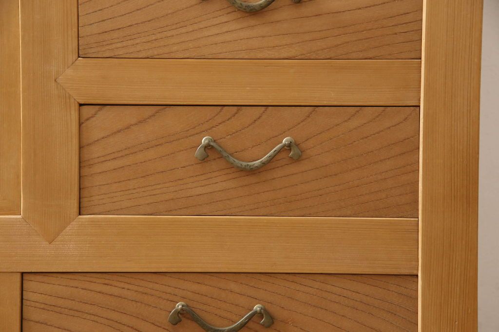 重ね水屋箪笥を綺麗に再生!天板と背板の修理・交換。上段引き戸の金網をガラスに仕様変更。棚板を新規製作、下段の引き戸の引手を交換。クリアワックス仕上げ。