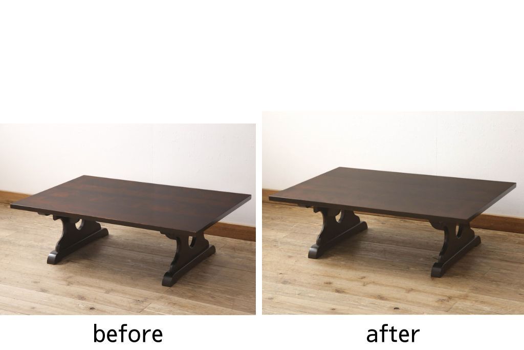ラフジュ工房> セミオーダー家具実績 > 北海道民芸家具の折り畳み式テーブルの見た目を変えずに奇麗にリペア!天板の塗装を剥離して輪ジミのできにくい塗料で再塗装。(ローテーブル、ちゃぶ台、文机、センターテーブル、折り畳み)