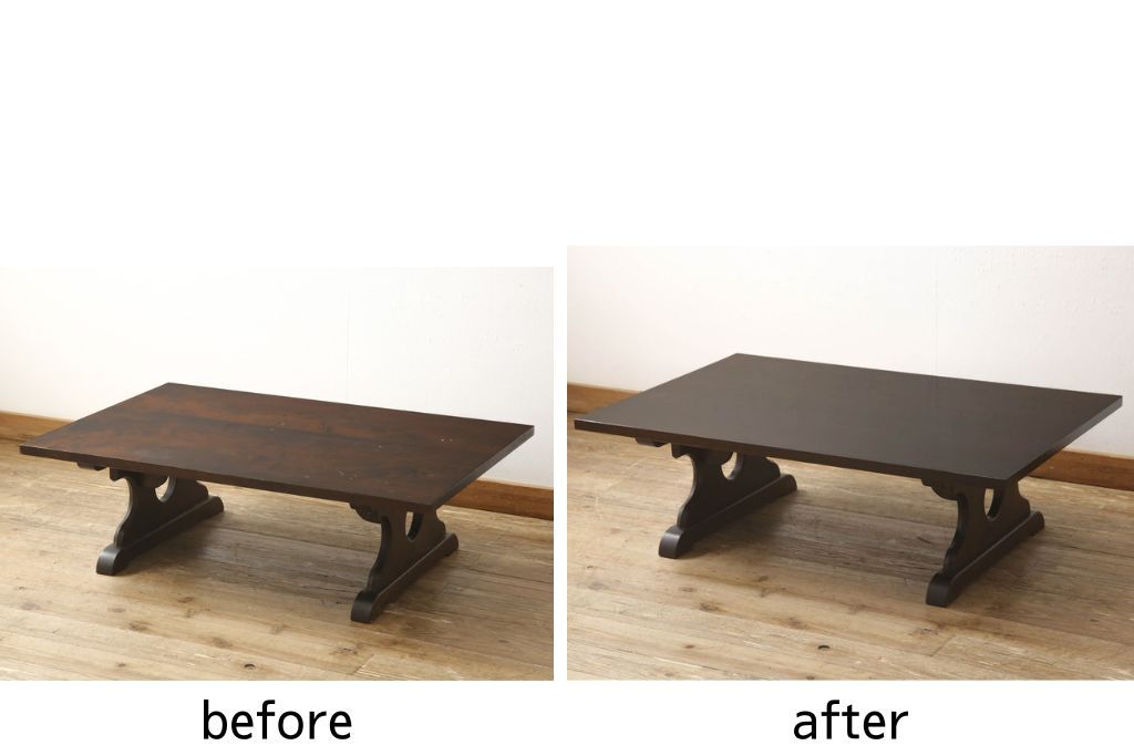 ラフジュ工房> セミオーダー家具実績 > 北海道民芸家具の折り畳み式テーブルを見た目を変えずに奇麗にリペア!天板の塗装を剥離して輪ジミのできにくい塗料で再塗装。(ローテーブル、ちゃぶ台、文机、センターテーブル、折り畳み)