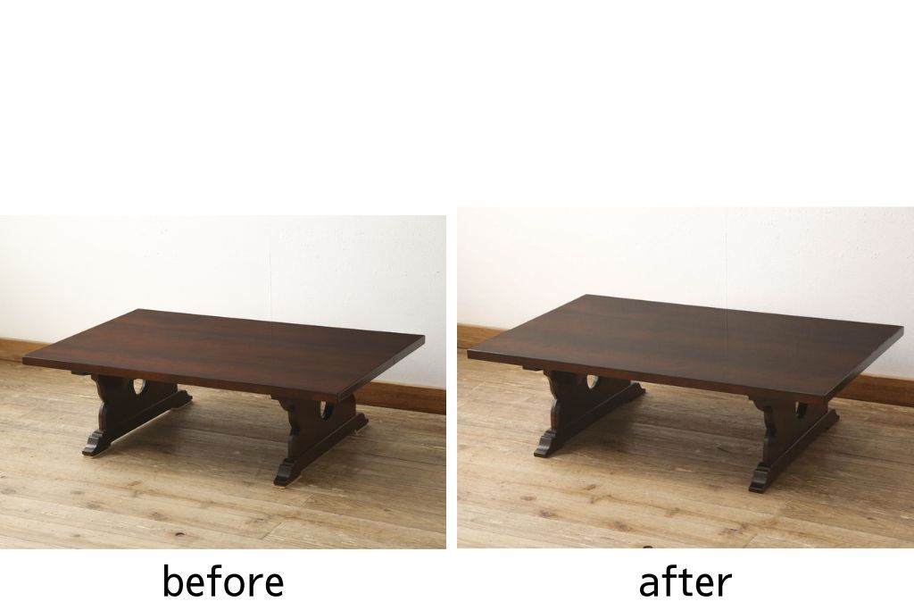 ラフジュ工房> セミオーダー家具実績 > 松本民芸家具の折り畳み式テーブルを変えずに奇麗にリペア!天板の塗装を剥離して輪ジミのできにくい塗料で再塗装。(ローテーブル、ちゃぶ台、文机、センターテーブル、折り畳み)