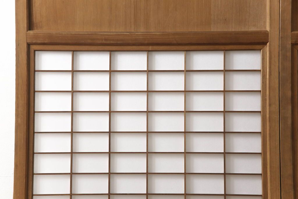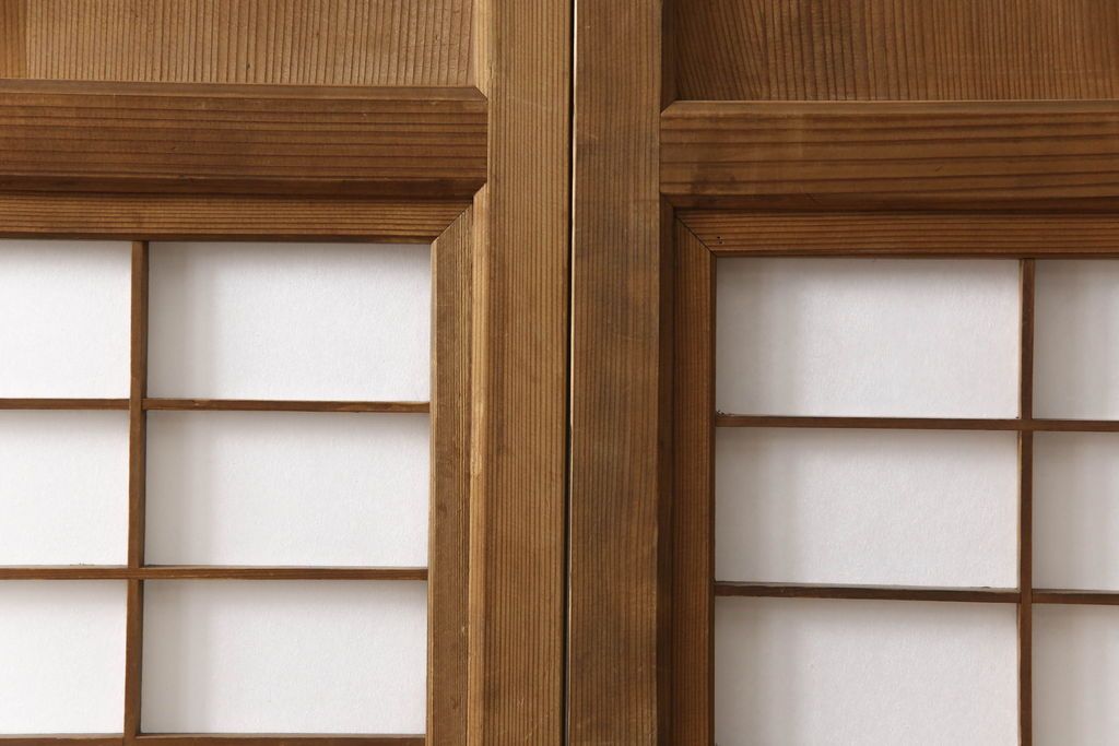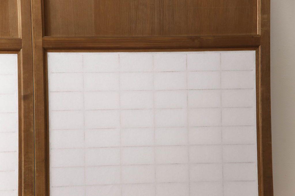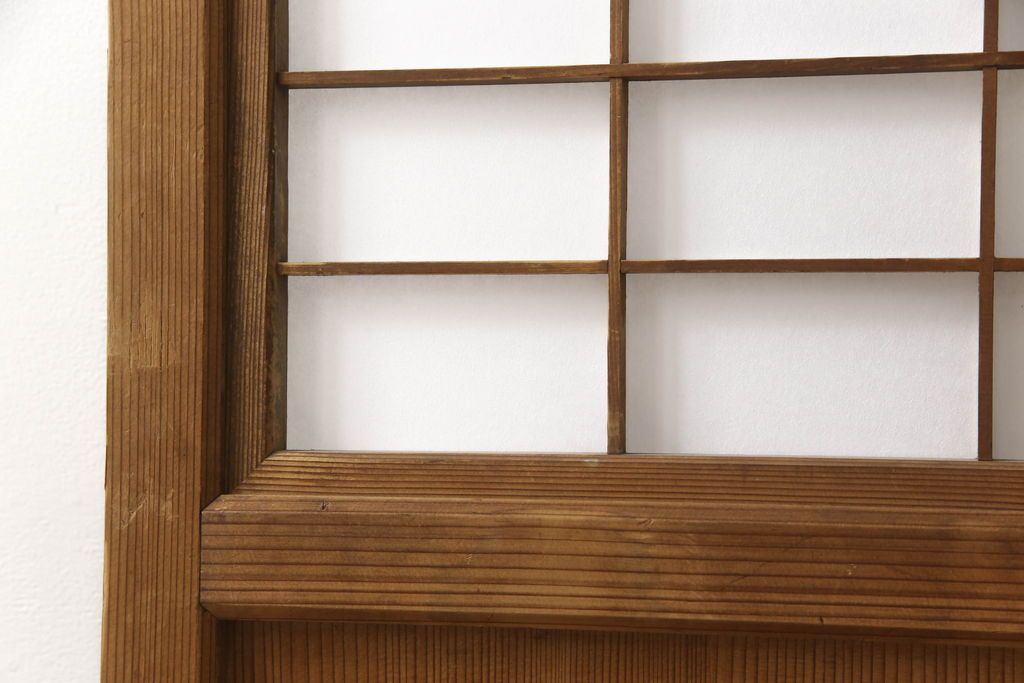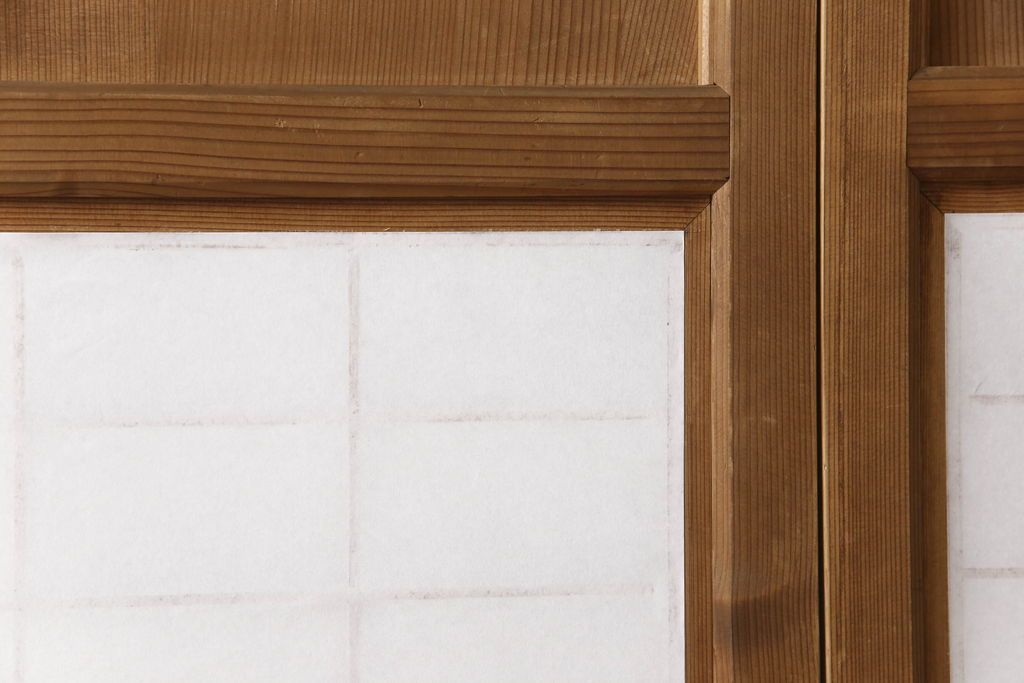 障子帯戸の見た目を変えずに奇麗にリペア!V型戸車を取り付け、プラスチック障子紙に張り替え。鏡板の隙間防止処理。着色は行わず、シミ抜きのみで仕上げ。(障子戸、格子戸、板戸、引き戸、建具)