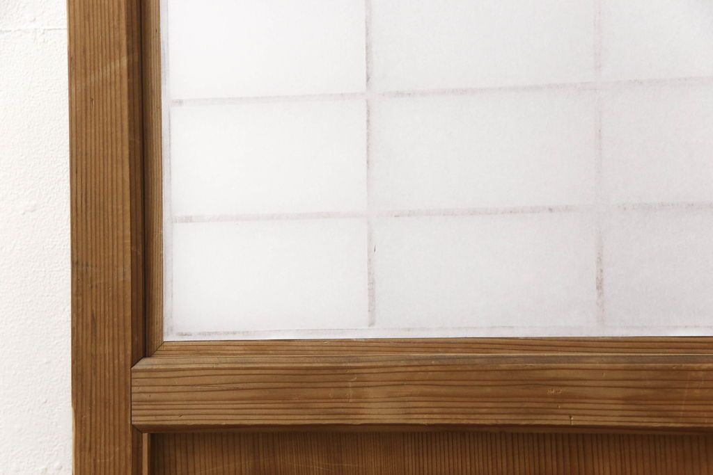 ドア・建具> 障子戸 > 障子帯戸の見た目を変えずに奇麗にリペア!V型戸車を取り付け、プラスチック障子紙に張り替え。鏡板の隙間防止処理。着色は行わず、シミ抜きのみで仕上げ。(障子戸、格子戸、板戸、引き戸、建具)