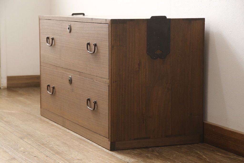 チェスト・引き出し> ローチェスト > 桐箪笥をリペア&カスタム!天板を補強し、金具をフラットに修正加工。自然な茶色に着色仕上げ。(ローボード、テレビ台、ローチェスト、引き出し、桐箪笥、桐たんす、収納箪笥、時代箪笥)