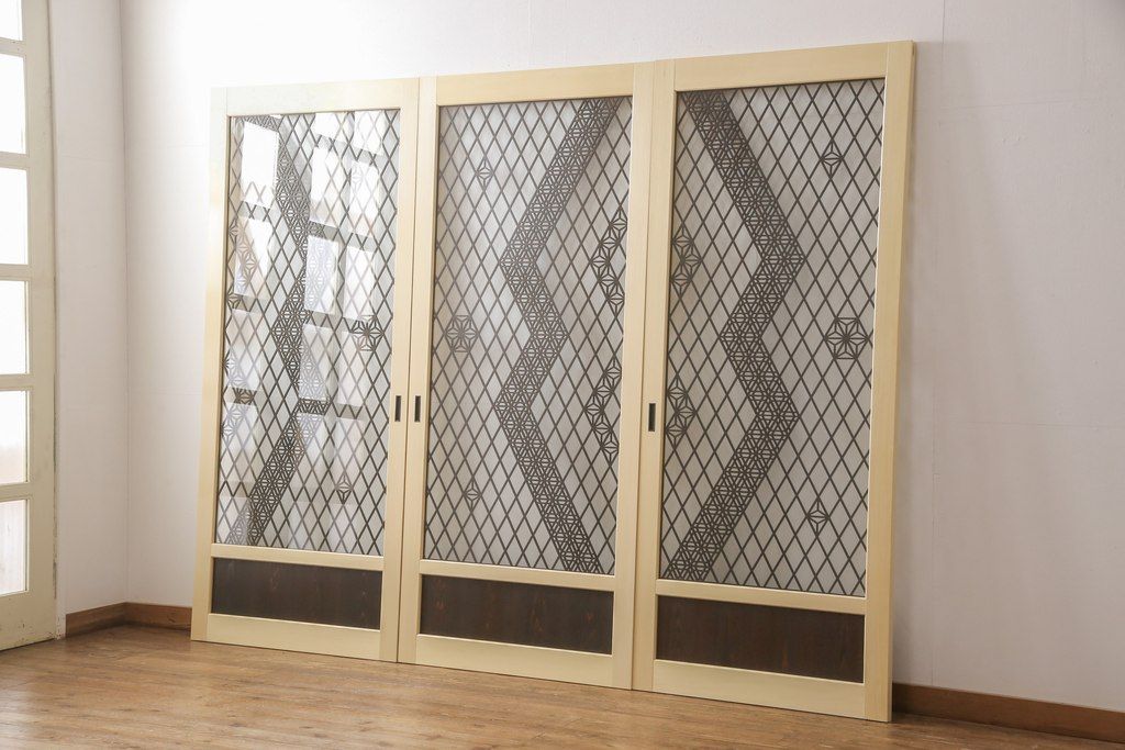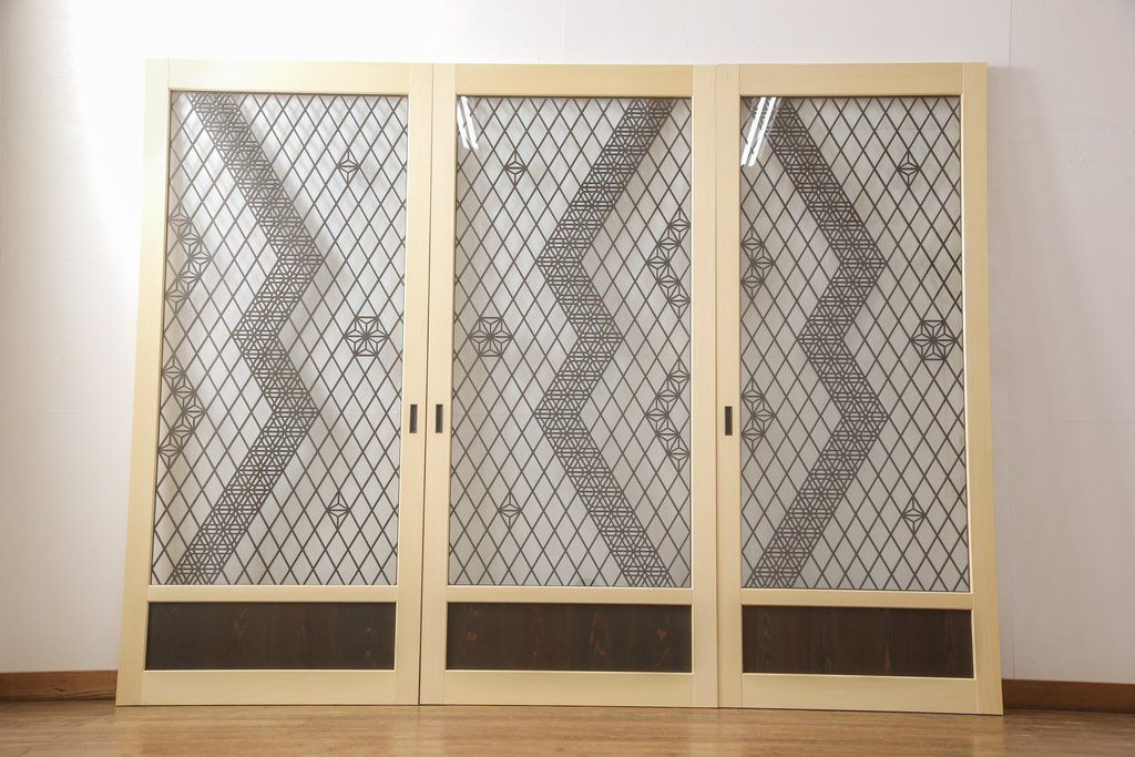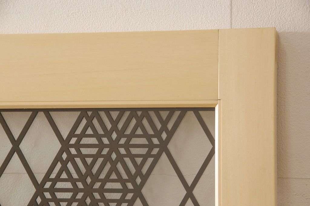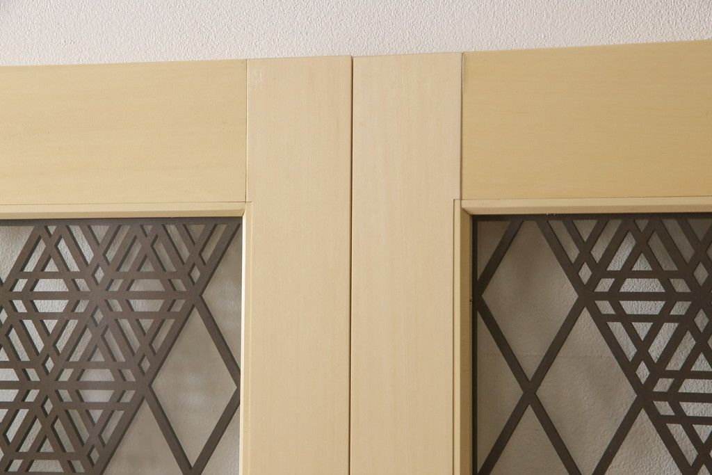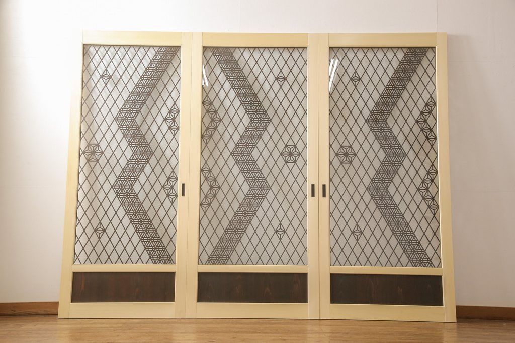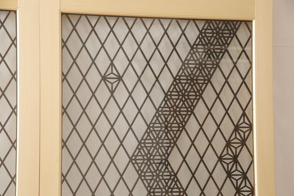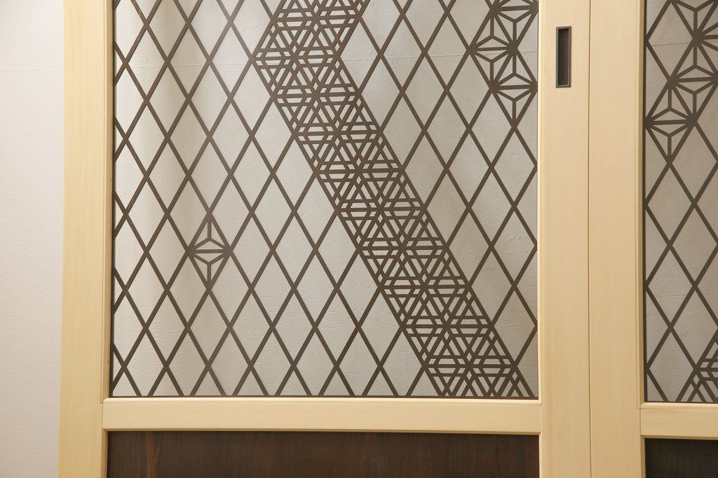 ドア・建具> 2枚・3枚セット > レーザー組子入りガラス戸を新規製作!ガラスはクリアガラスを使用。格子は茶色で着色、建具本体は自然な木味を活かした仕上げ。(引き戸、建具)