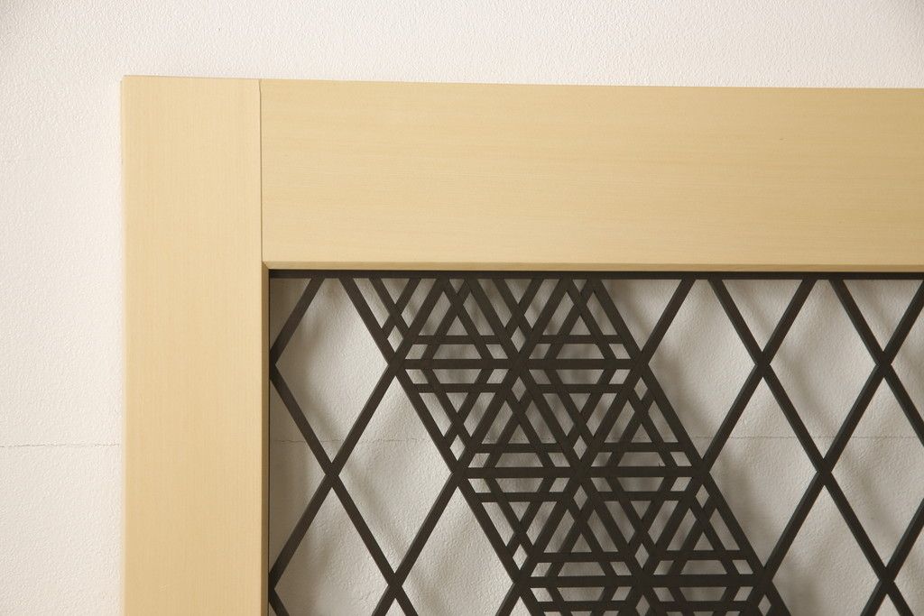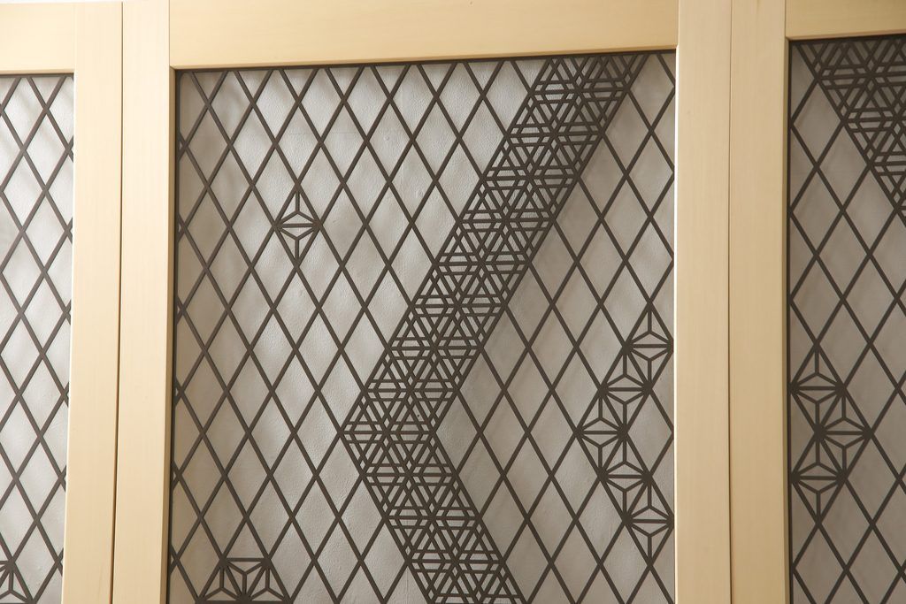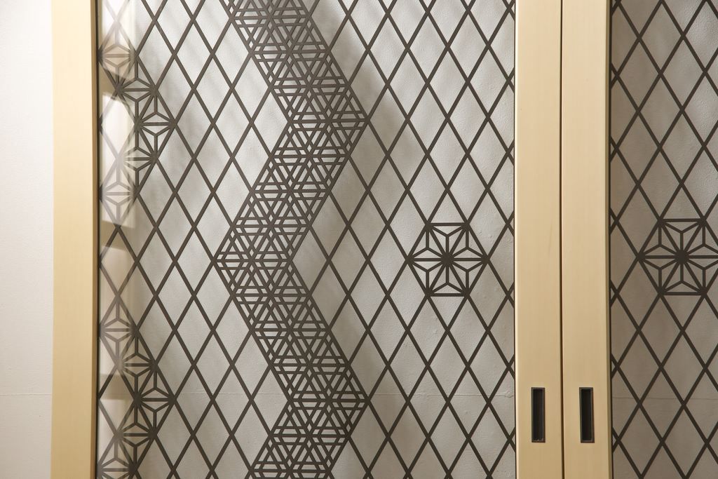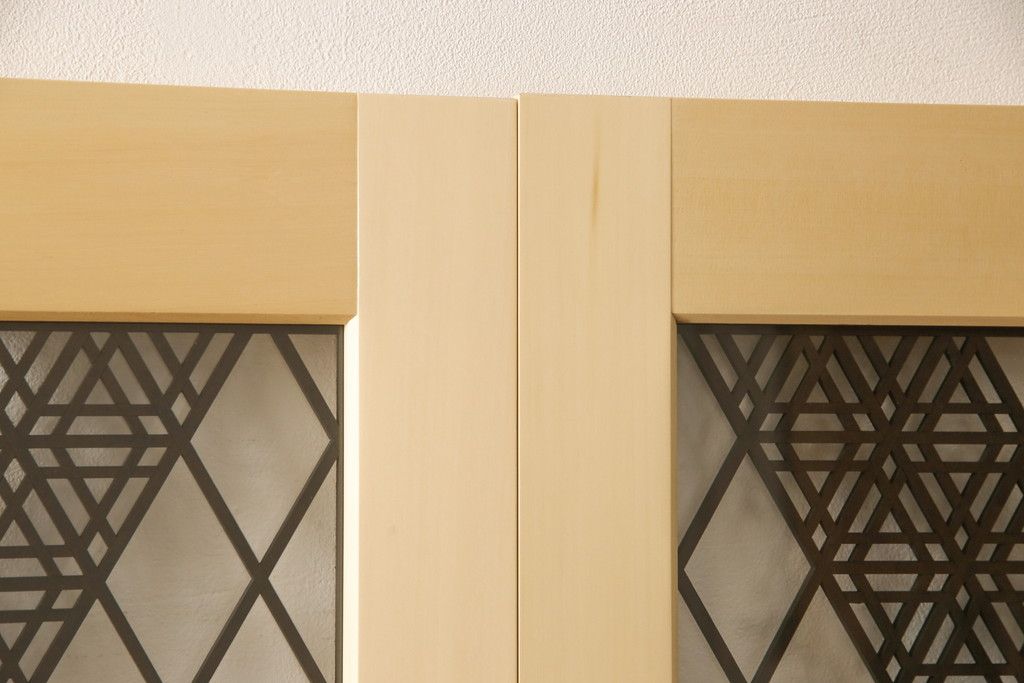フルオーダー家具実績 > レーザー組子入りガラス戸を新規製作!ガラスはクリアガラスを使用。格子は茶色で着色、建具本体は自然な木味を活かした仕上げ。(引き戸、建具)