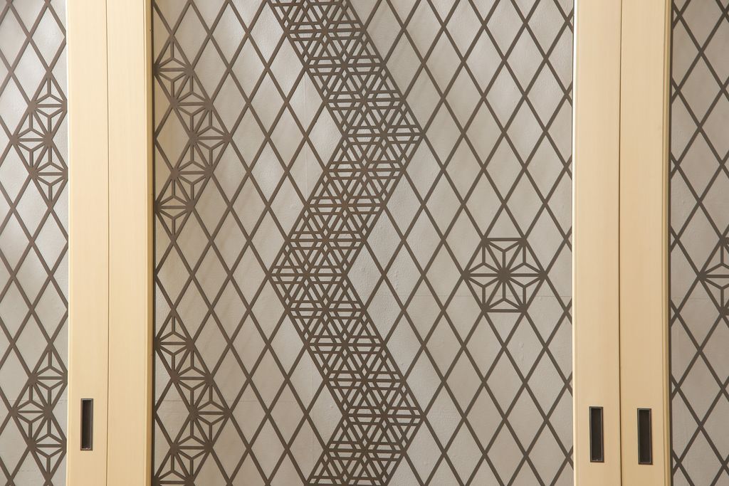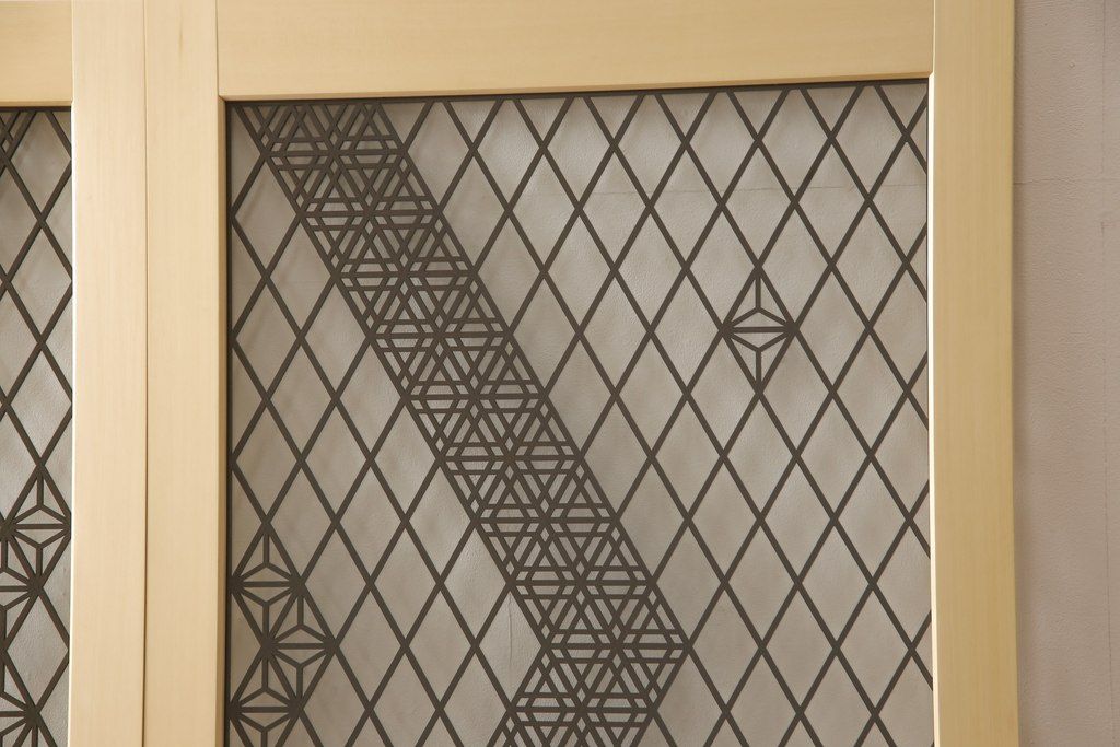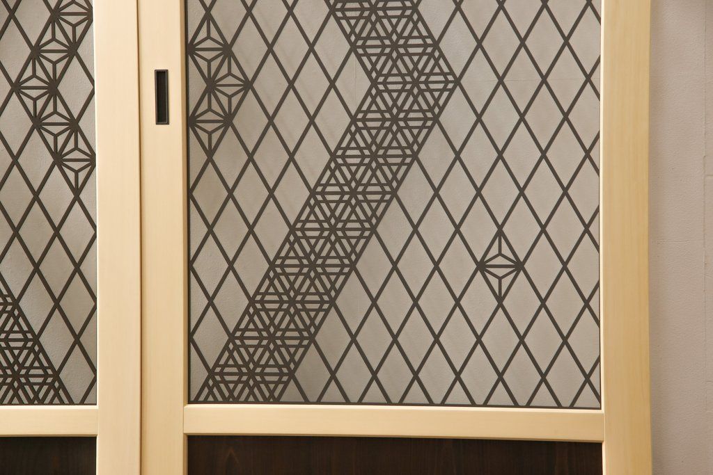 レーザー組子入りガラス戸を新規製作!ガラスはクリアガラスを使用。格子は茶色で着色、建具本体は自然な木味を活かした仕上げ。(引き戸、建具)