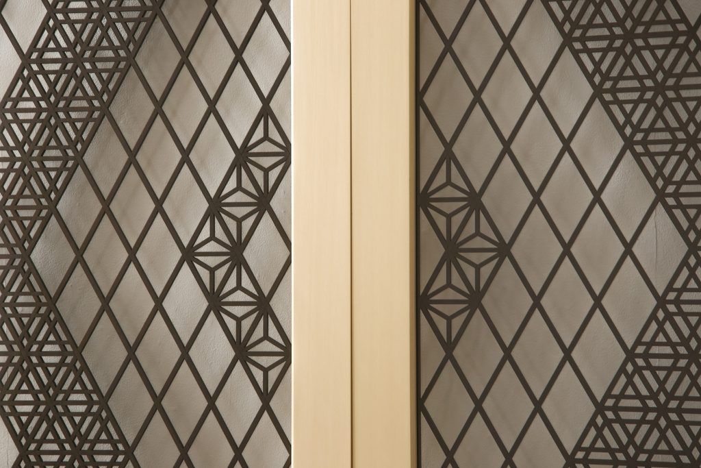 ドア・建具> 引き戸 > レーザー組子入りガラス戸を新規製作!ガラスはクリアガラスを使用。格子は茶色で着色、建具本体は自然な木味を活かした仕上げ。(引き戸、建具)