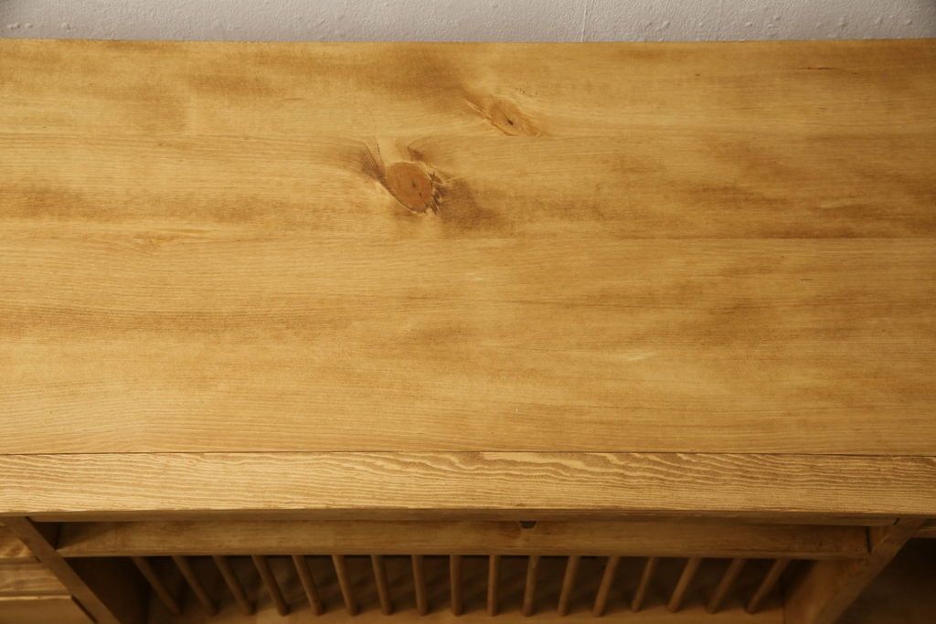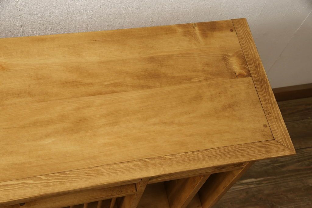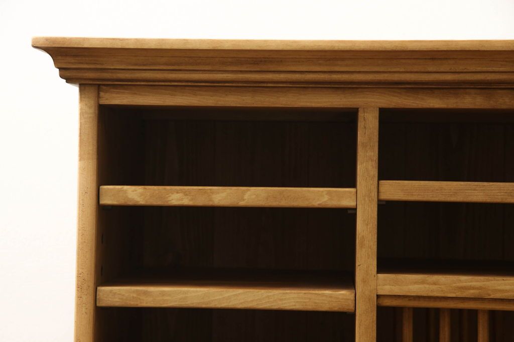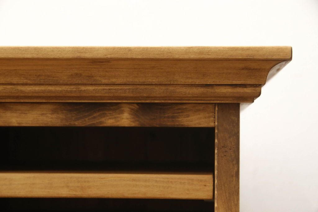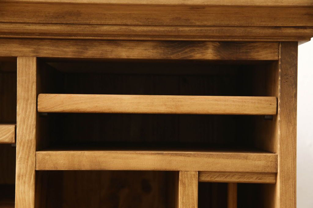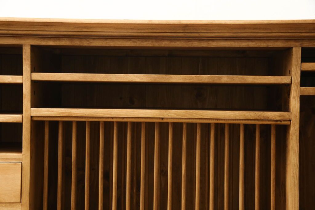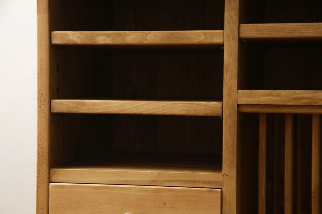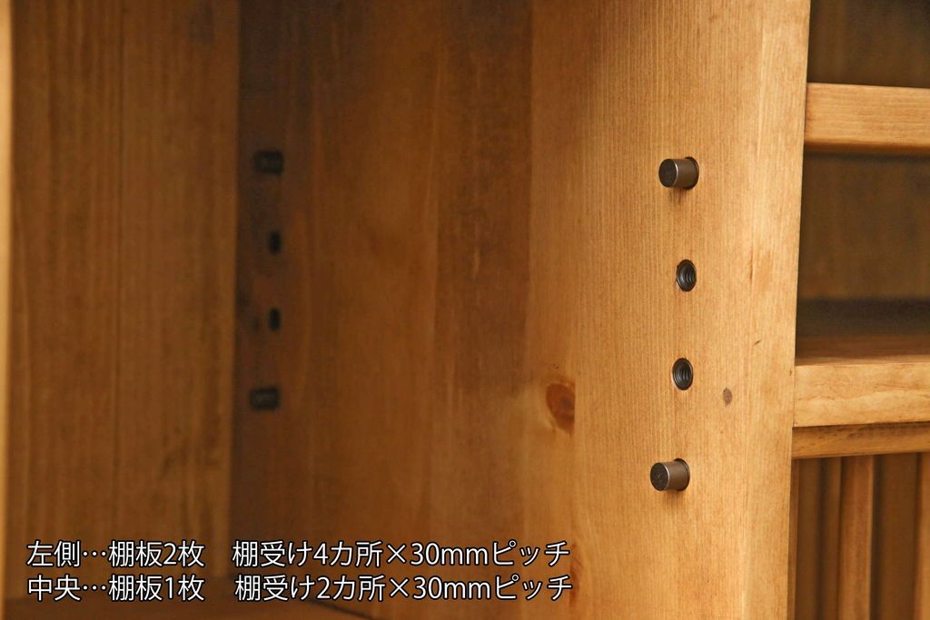 棚板は取り外しできます。棚板は左側2枚・中央1枚あります。棚受けは左側4ヶ所・中央2ヶ所、各30mmピッチで調整できます。棚幅サイズのものが1枚の作りです。