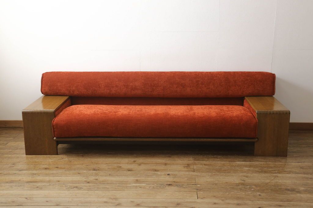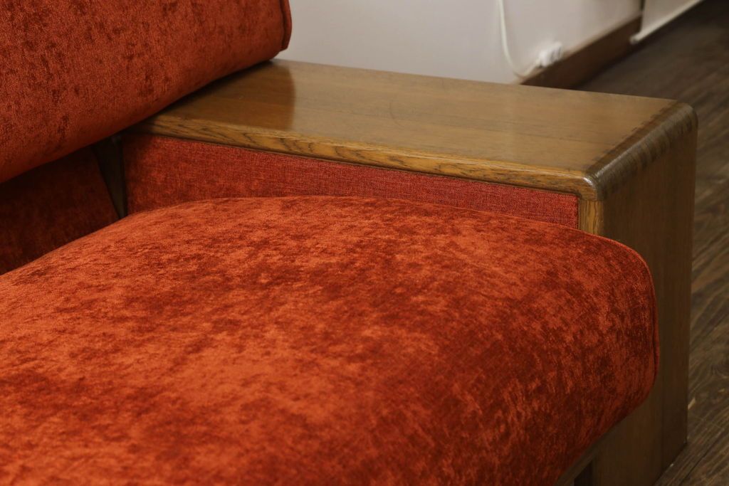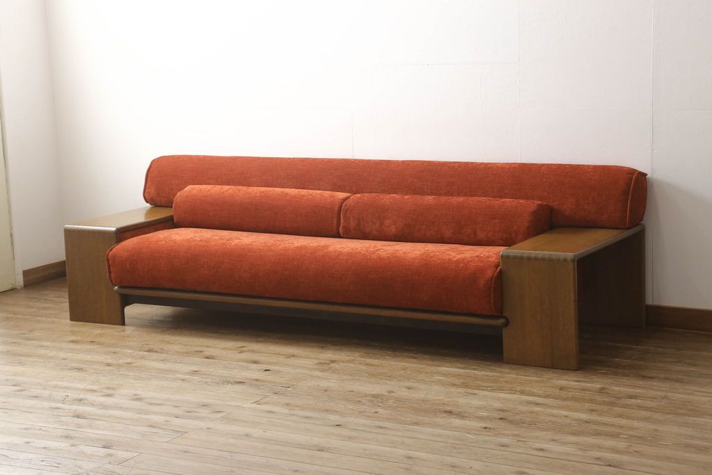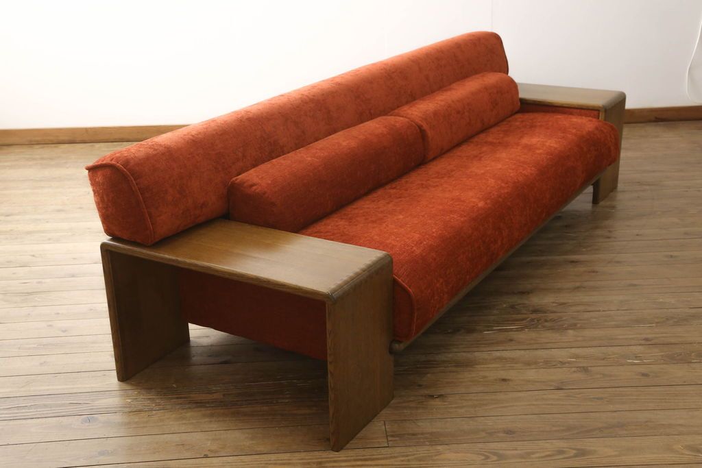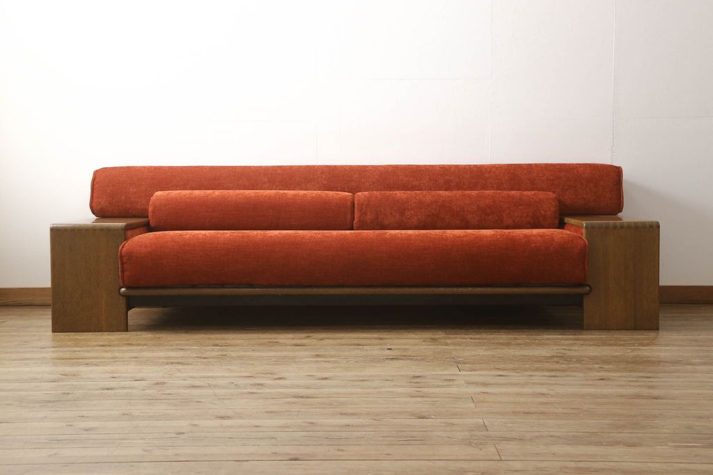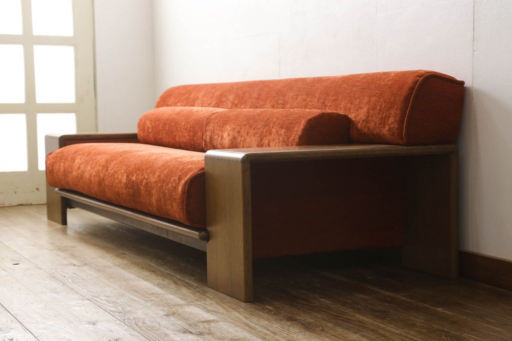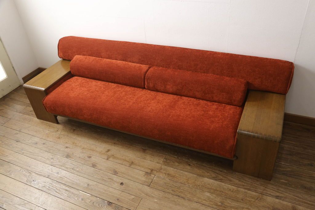 3人掛けソファをリペア&カスタム!指定の生地に張り替え、座面の厚みを調整。同じ生地でクッションカバーも制作。(3Pソファ、三人掛けソファ、ビンテージ)