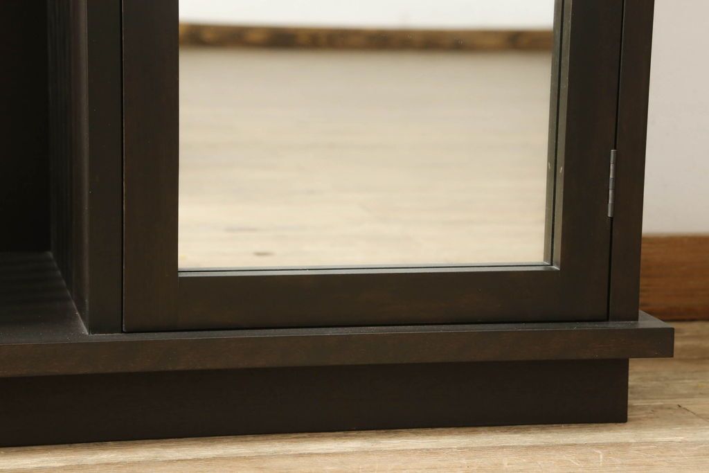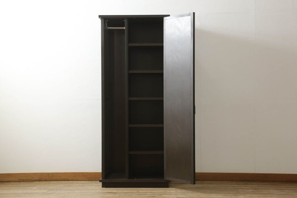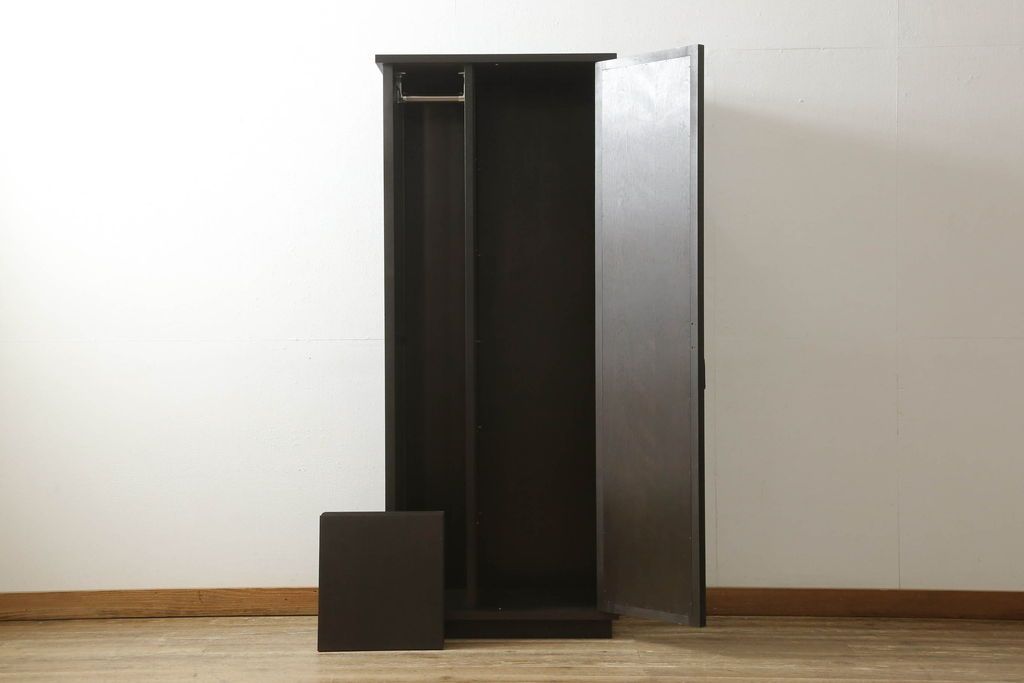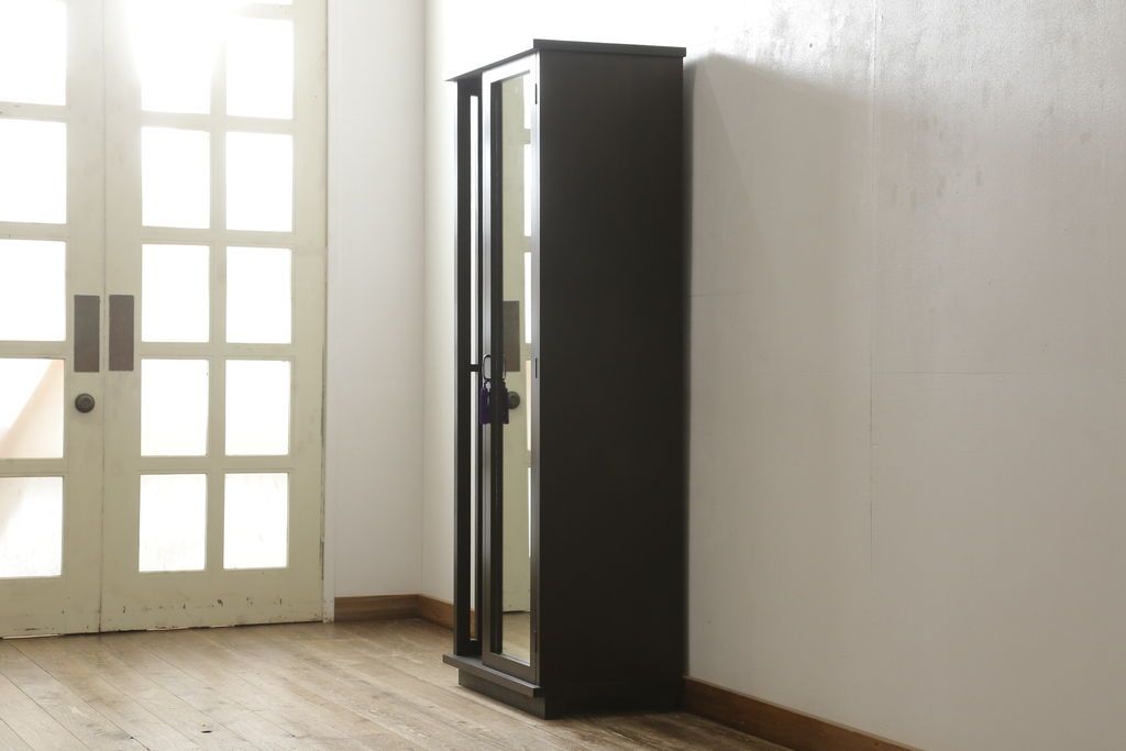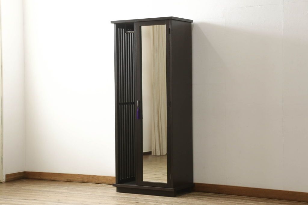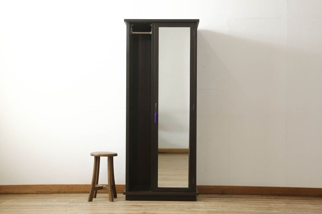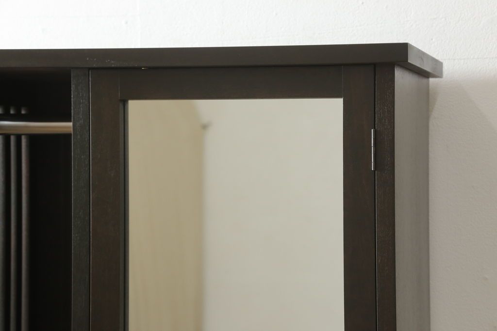 ワードローブ・ロッカー> ワードローブ > ハンガー収納付姿見を新規製作!鏡面内部は可動式の棚板5枚とハンガーアイアンを取り付け。濃い茶色で着色仕上げ。(洋服タンス、収納棚、戸棚、キャビネット、ワードローブ)