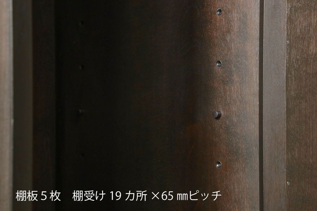 棚板は取り外しできます。棚板は5枚あります。棚受けは19ヶ所、65mmピッチで調整できます。棚幅サイズのものが1枚の作りです。