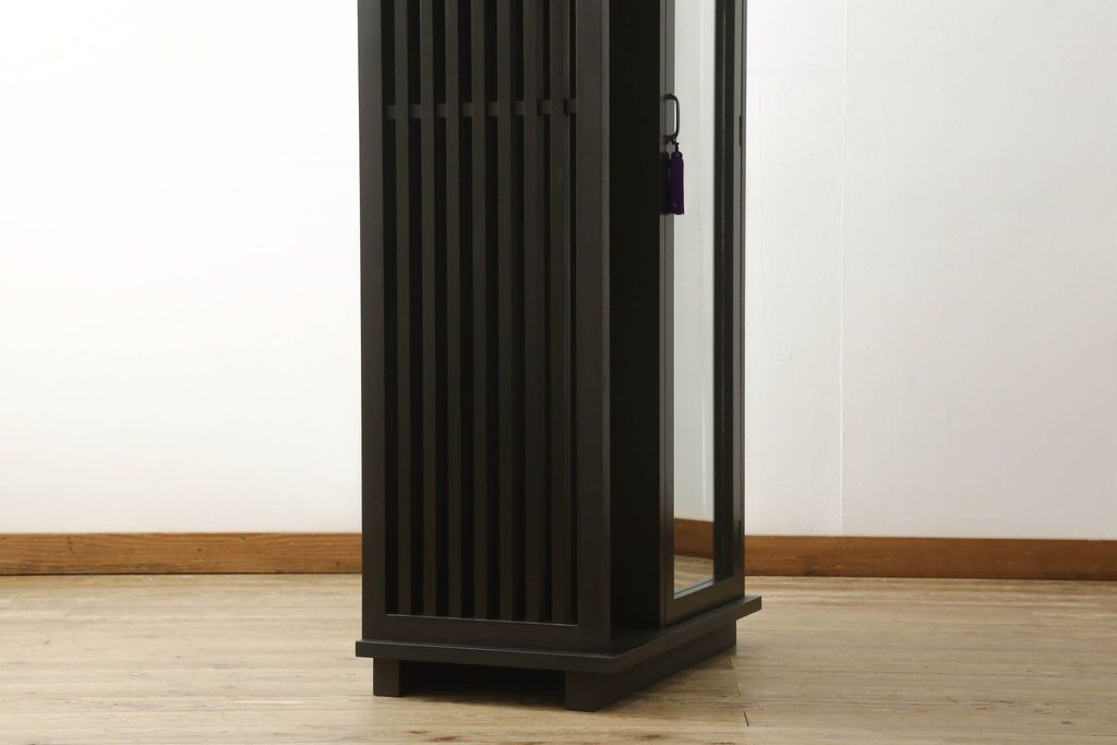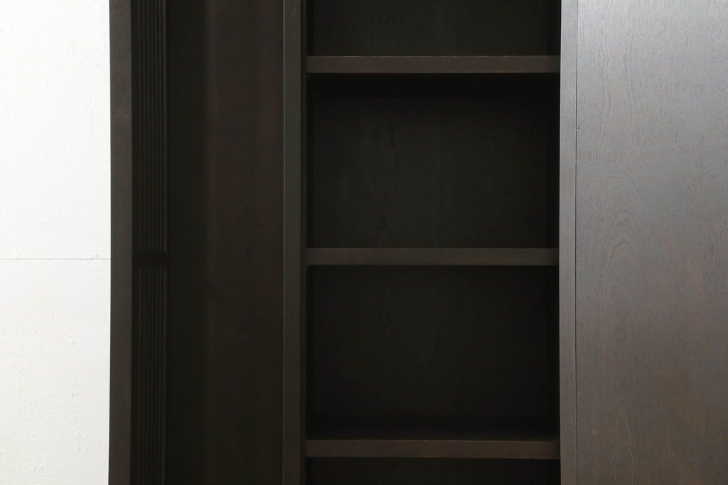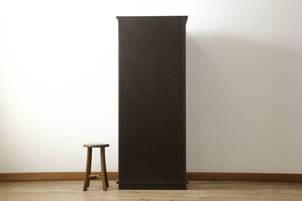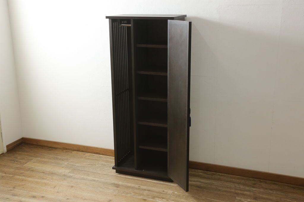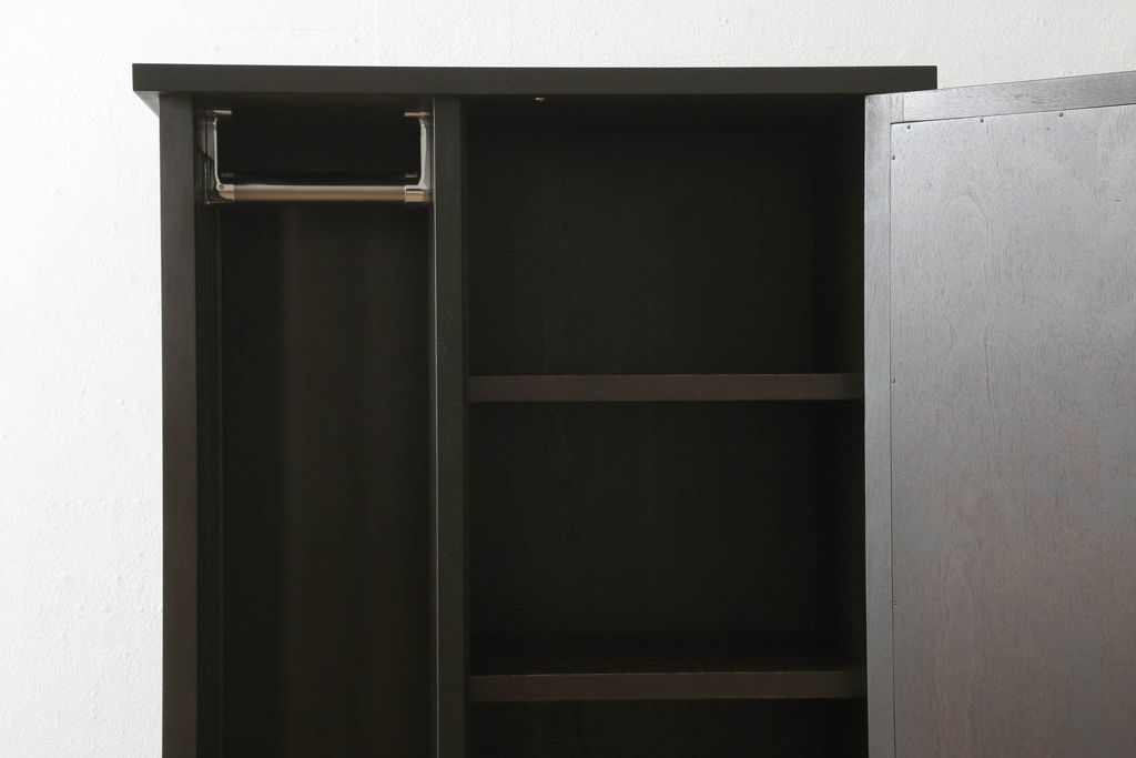 ハンガー収納付姿見を新規製作!鏡面内部は可動式の棚板5枚とハンガーアイアンを取り付け。濃い茶色で着色仕上げ。(洋服タンス、収納棚、戸棚、キャビネット、ワードローブ)