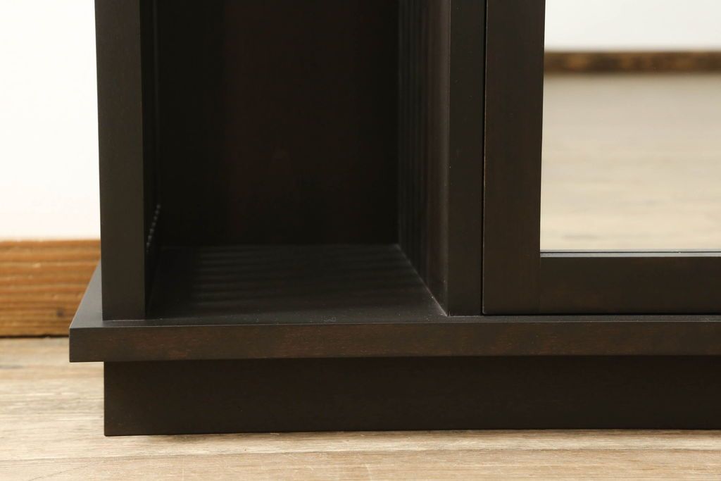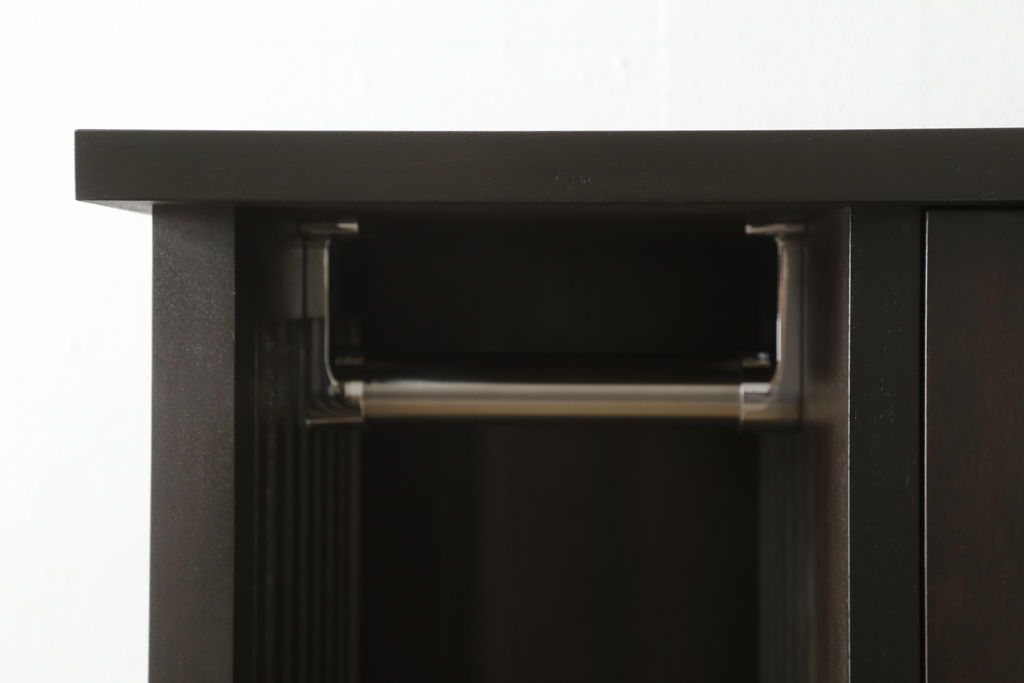 フルオーダー家具実績 > ハンガー収納付姿見を新規製作!鏡面内部は可動式の棚板5枚とハンガーアイアンを取り付け。濃い茶色で着色仕上げ。(洋服タンス、収納棚、戸棚、キャビネット、ワードローブ)