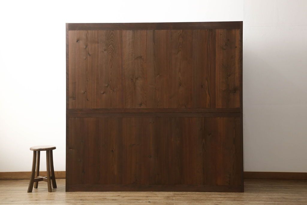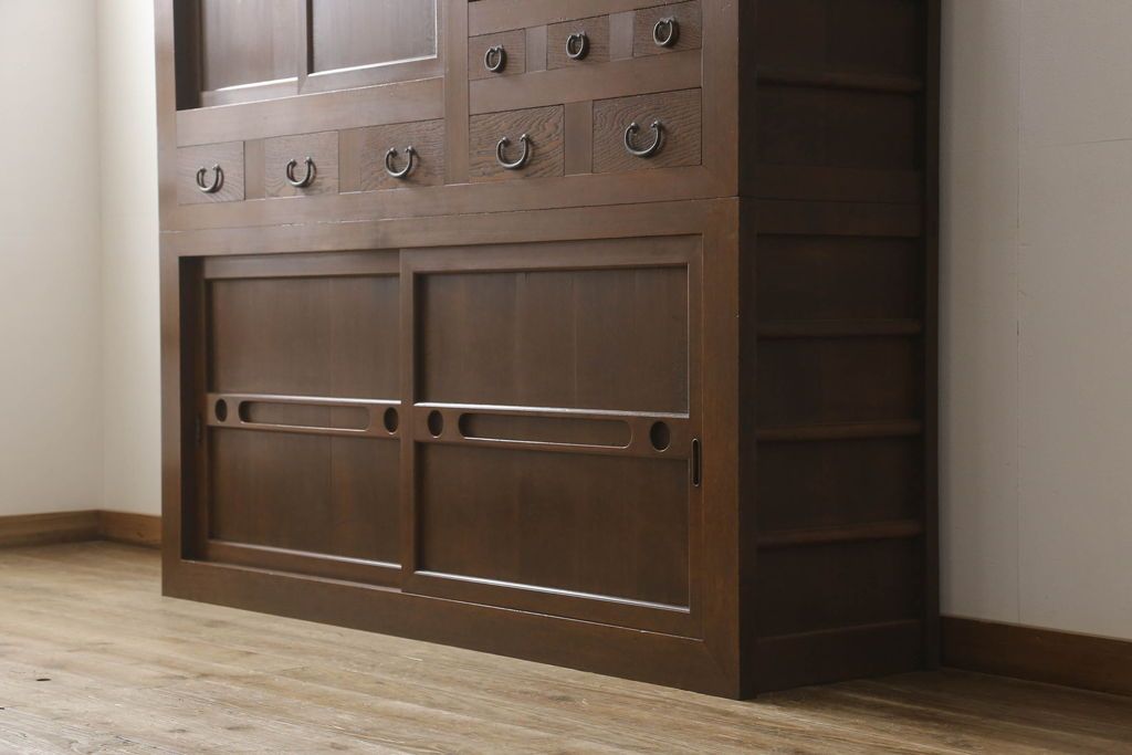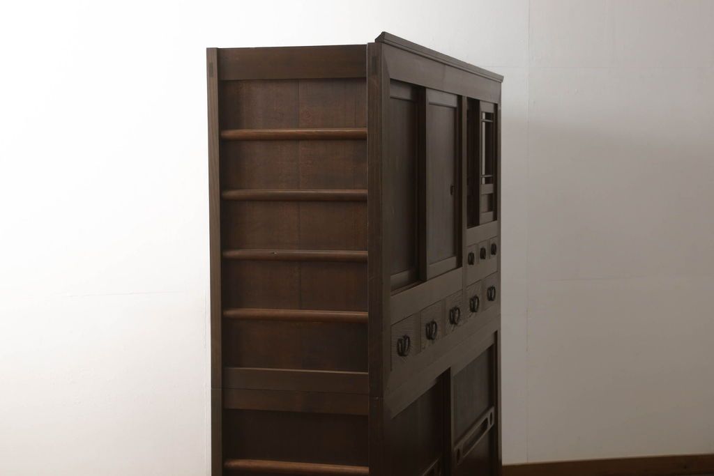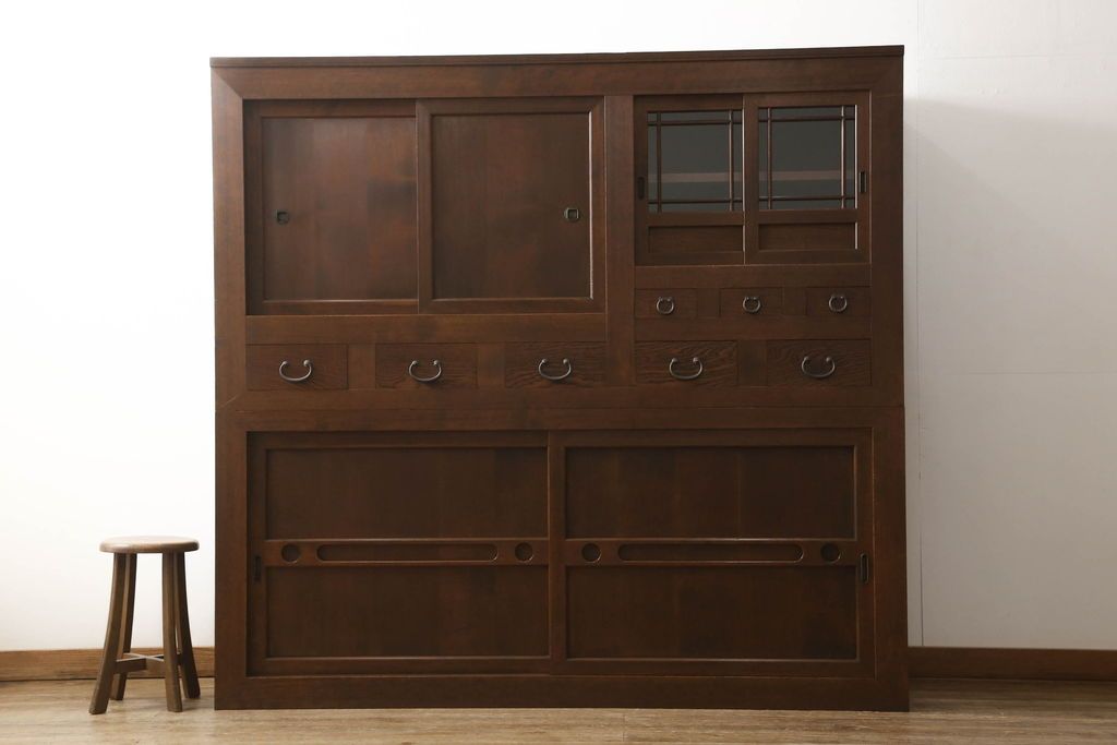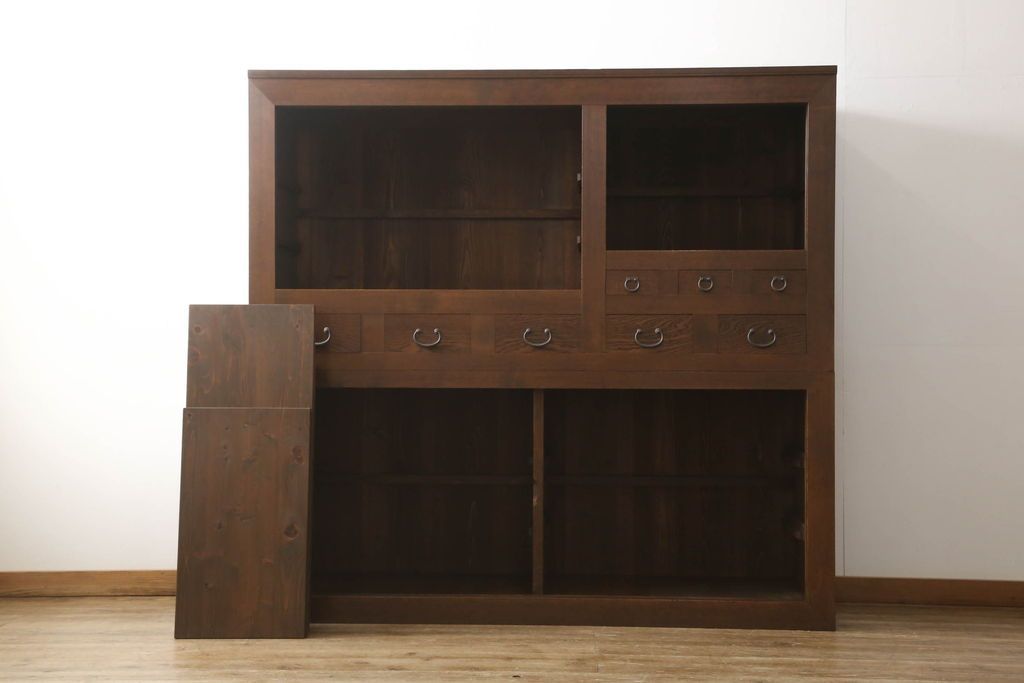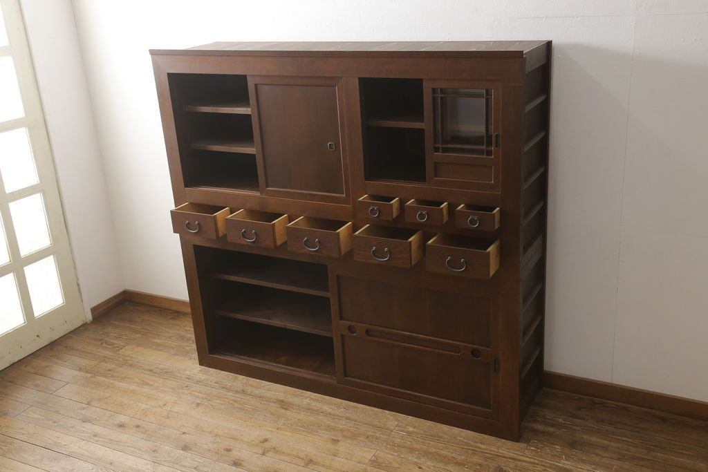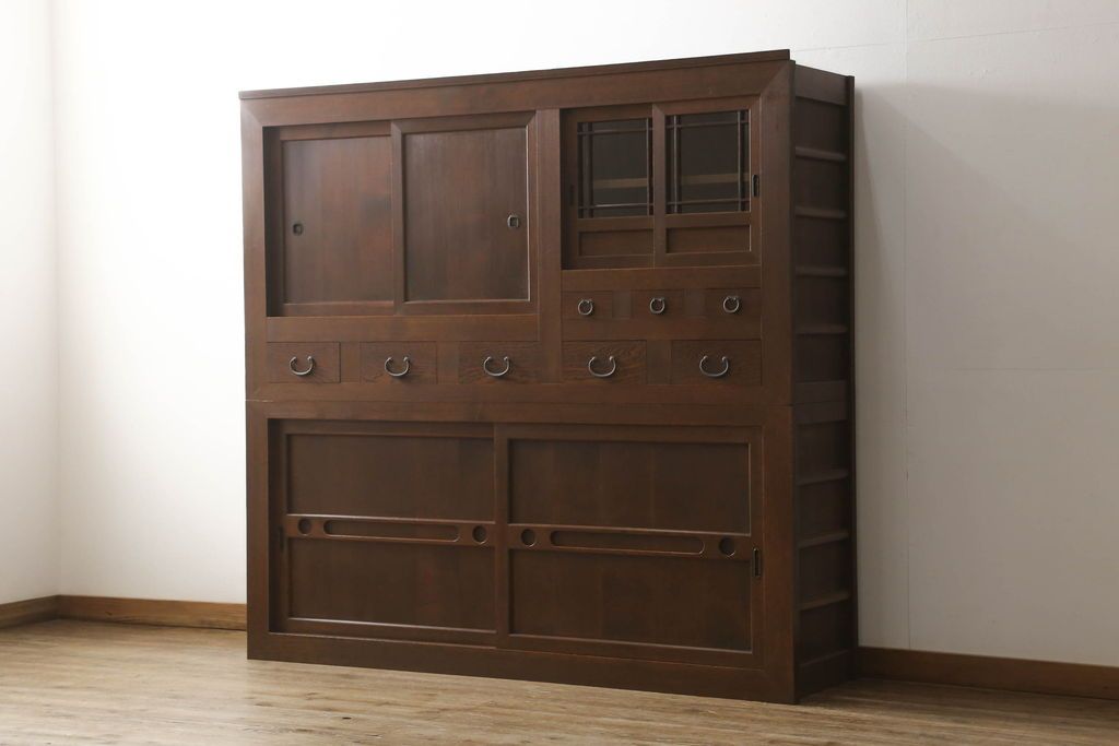 重ね水屋箪笥をリペア&カスタム!上段右上の網をクリアガラスに変更。全ての棚板を交換し、位置を調整。全体をご希望の色味に着色仕上げ。(六尺、食器棚、戸棚、キャビネット、収納棚)