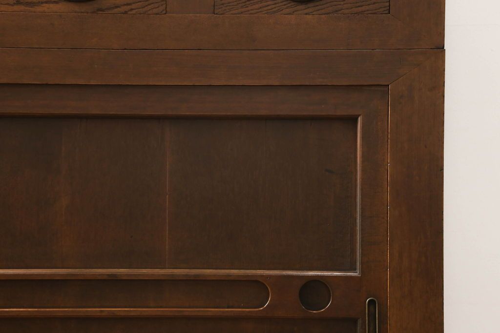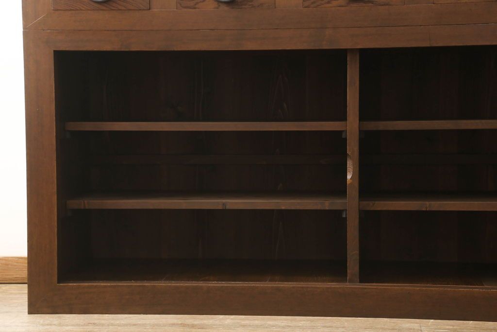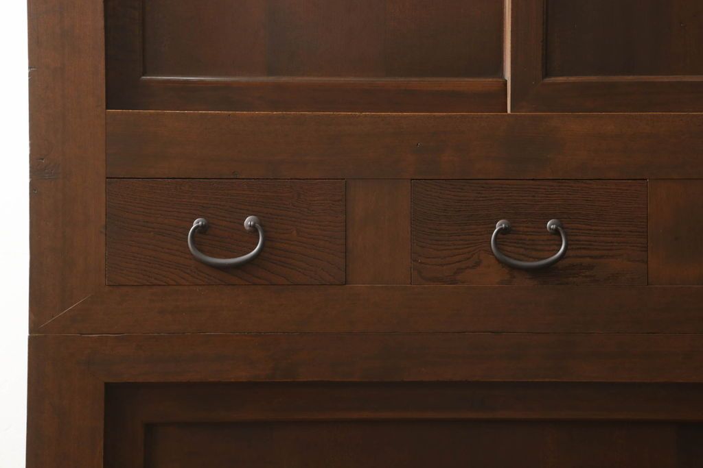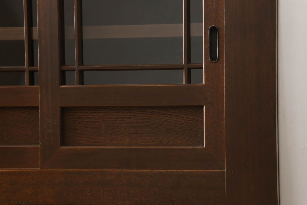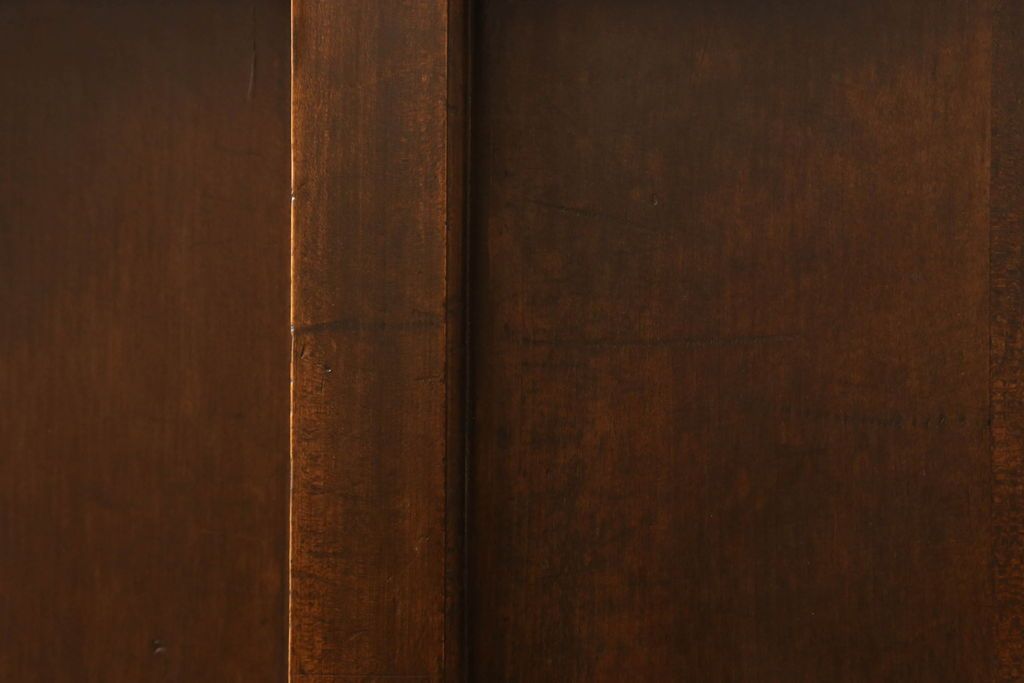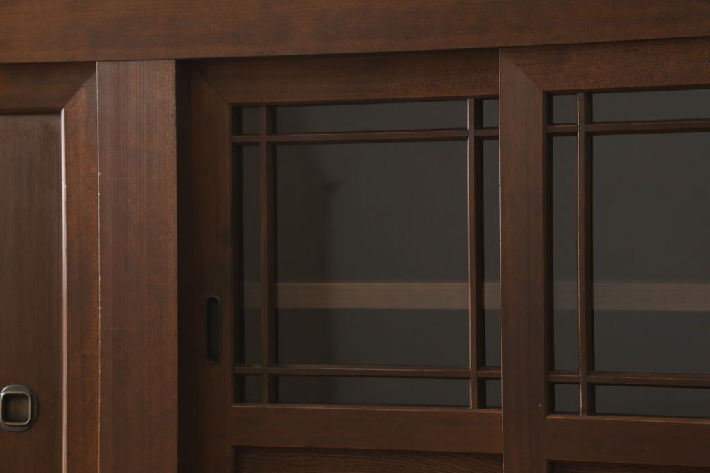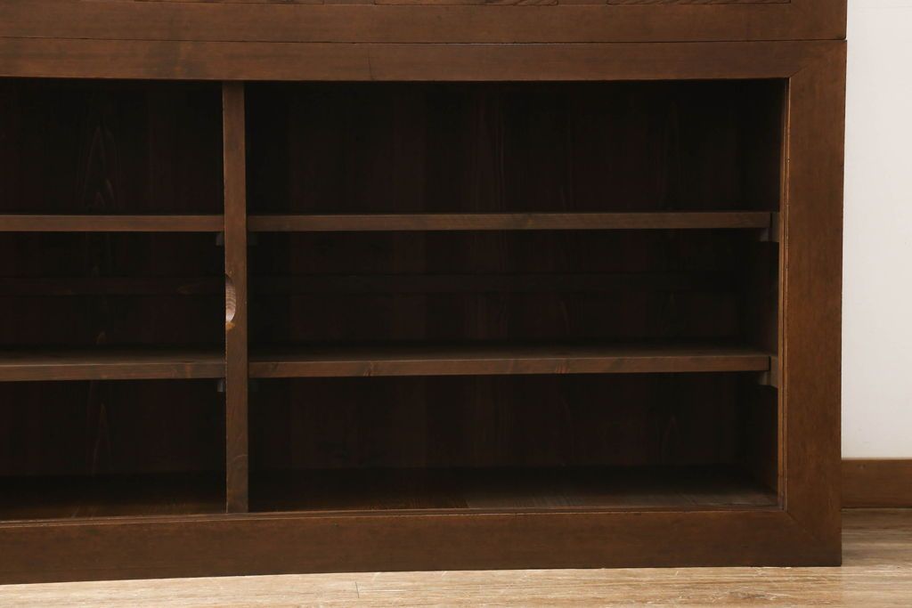 重ね水屋箪笥をリペア&カスタム!上段右上の網をクリアガラスに変更。全ての棚板を交換し、位置を調整。全体をご希望の色味に着色仕上げ。(六尺、食器棚、戸棚、キャビネット、収納棚)