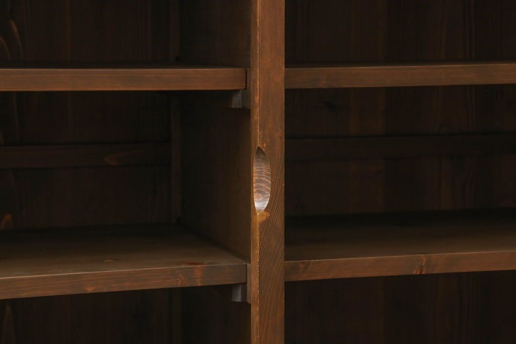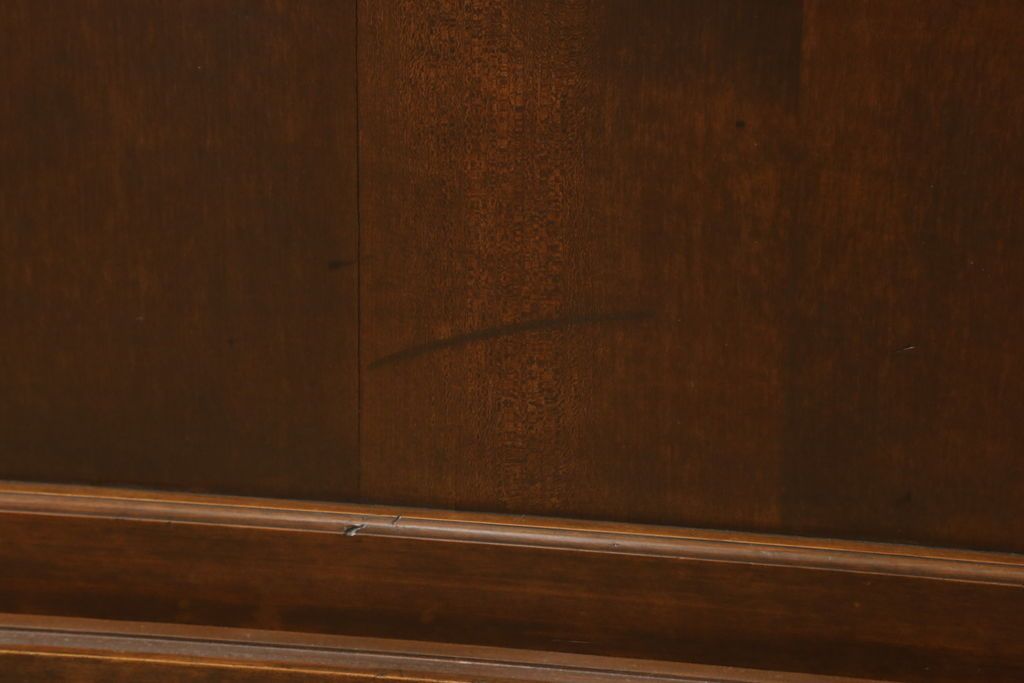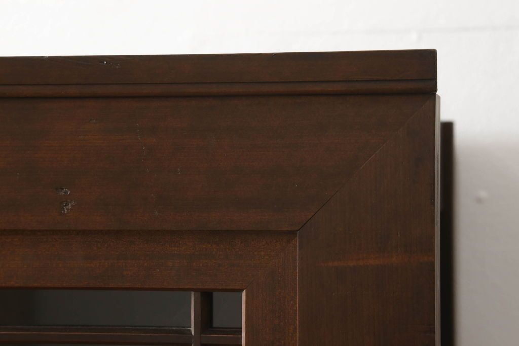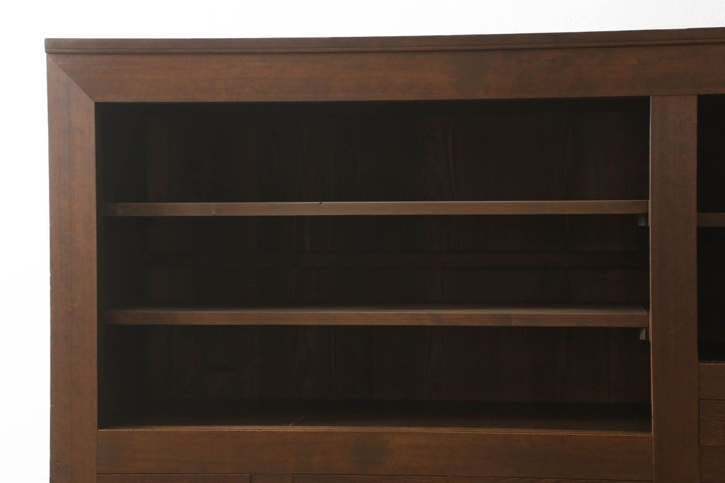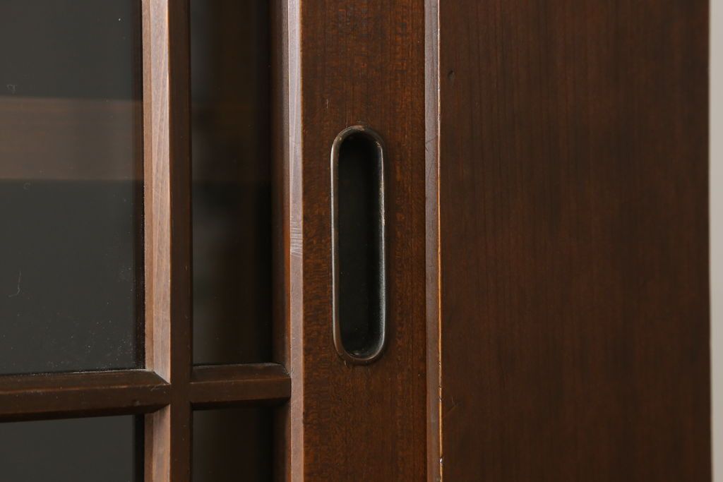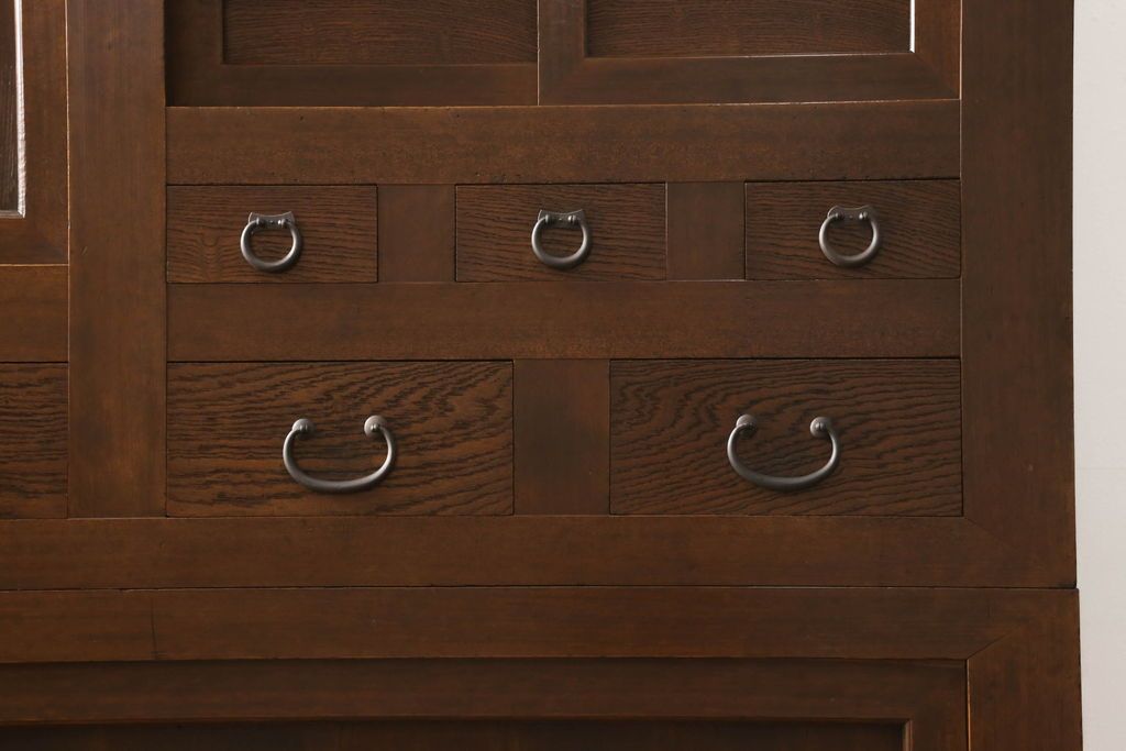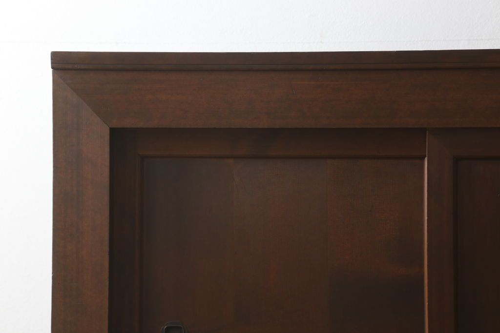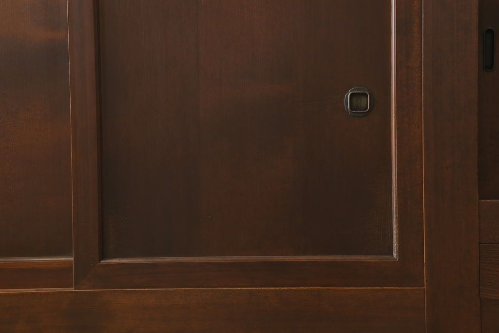 重ね水屋箪笥をリペア&カスタム!上段右上の網をクリアガラスに変更。全ての棚板を交換し、位置を調整。全体をご希望の色味に着色仕上げ。(六尺、食器棚、戸棚、キャビネット、収納棚)